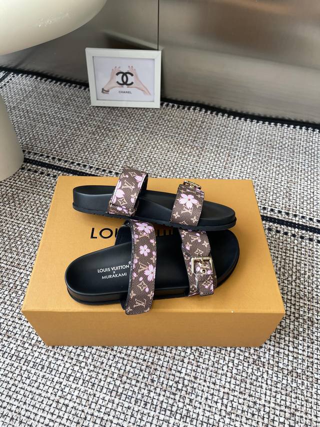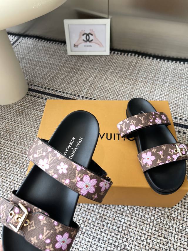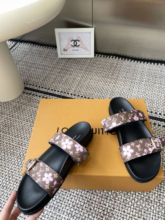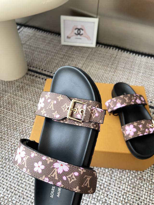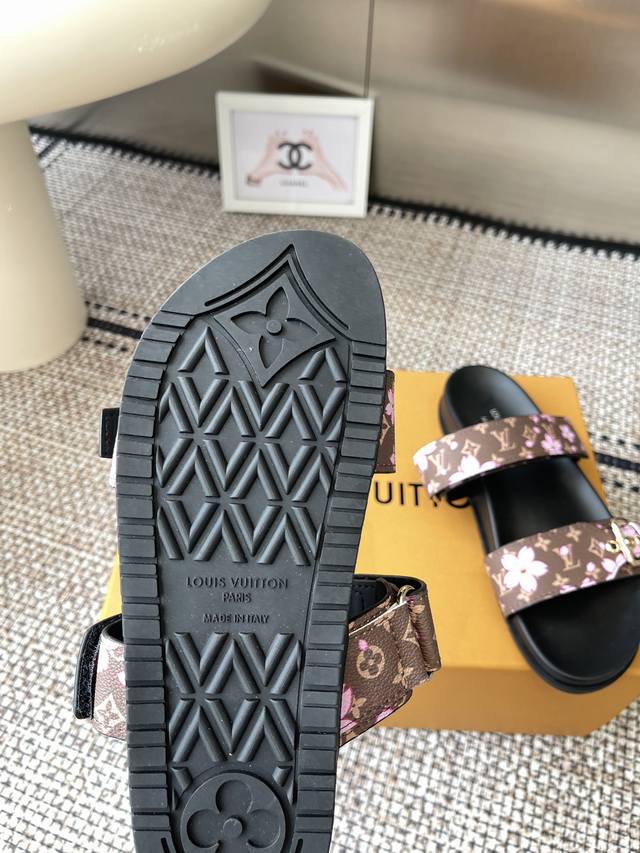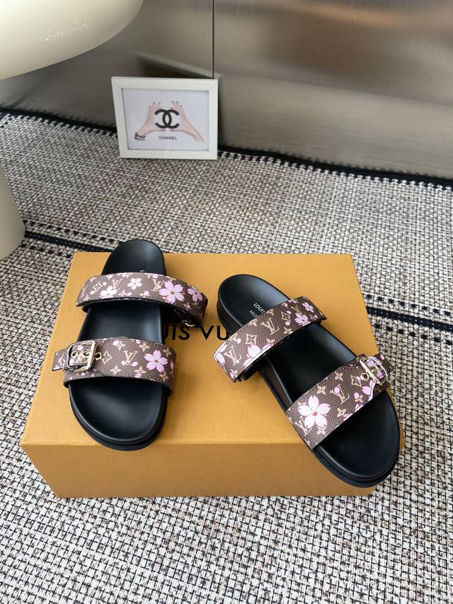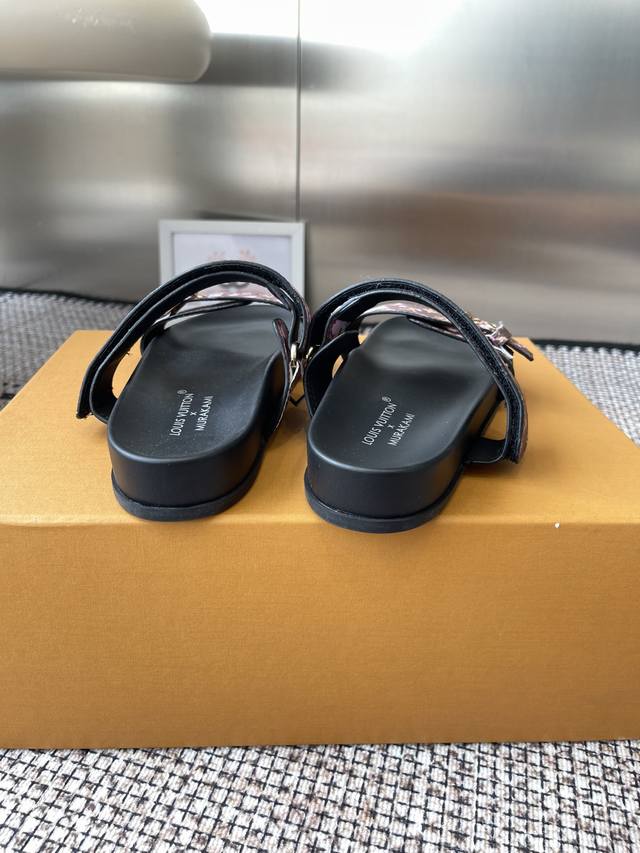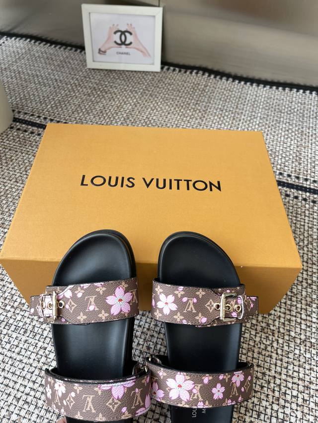 LV2025 Spring/Summer New Slippers with Adjustable Belt Buckle Design, Full of Beach Style. Original mold, LV metal logo decoration, custom cowhide upper, imported jacquard fabric, original monogram leather, water-dyed sheepskin lining, three-layer combination, platform sole + wear-resistant fleece + rubber sole. Sizes: 35-46 (Men's 45, 46) Custom made.