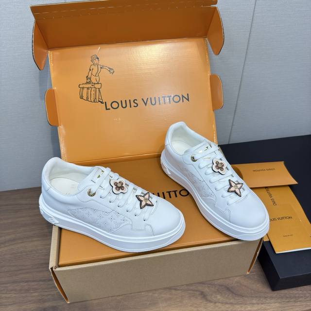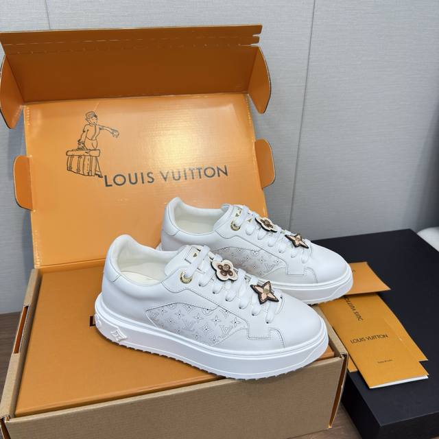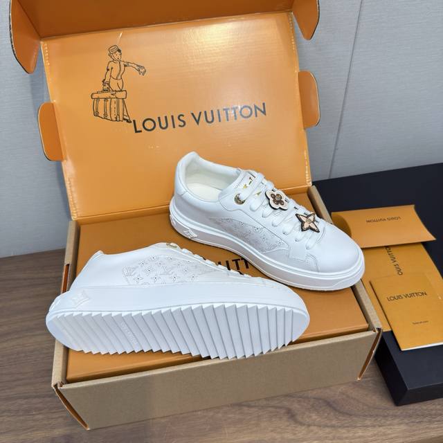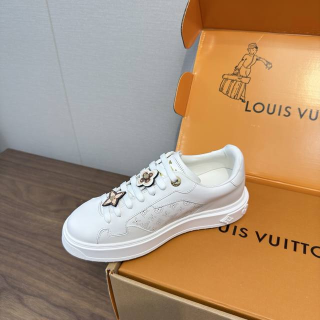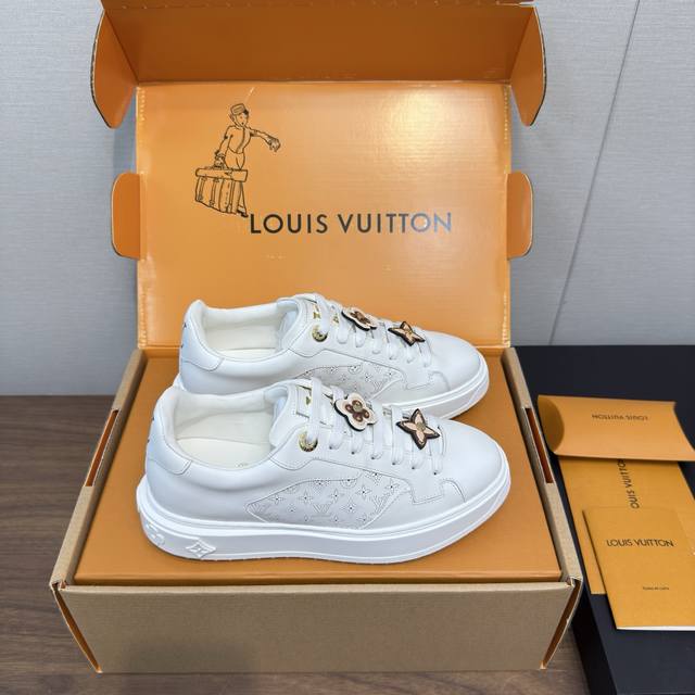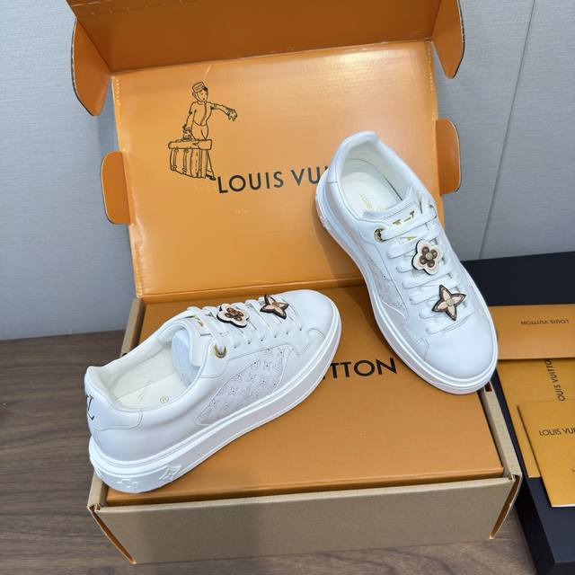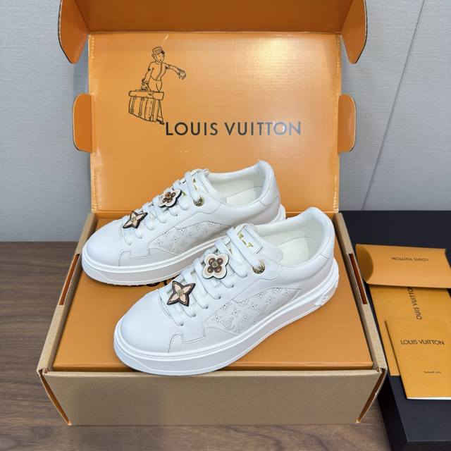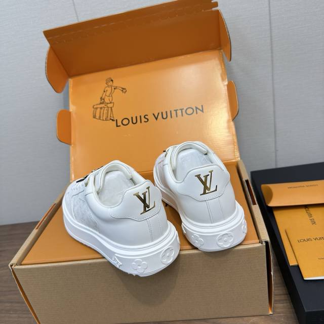 LV's 25 new color Time Out collection features embossed pendants, high-end versions of these casual white sneakers. Originally purchased, developed, and crafted, these Time Out sneakers feature a combination of cowhide and Monogram denim, echoing the current season's leather goods collection. A denim luggage tag is secured to the upper with a leather strap, highlighting Louis Vuitton's travel heritage. Dazzling inscribed eyelets and an embossed brand logo on the tongue add sophisticated detail. Delivered in exquisite packaging at the counter. Fabric: Original imported top-grain cowhide. Lining: Original custom soft sheepskin. Sole: Original molded TPU non-slip outsole. Sole thickness: 4cm. Size: Women's 35-40, custom sizes 34, 41, and 42.