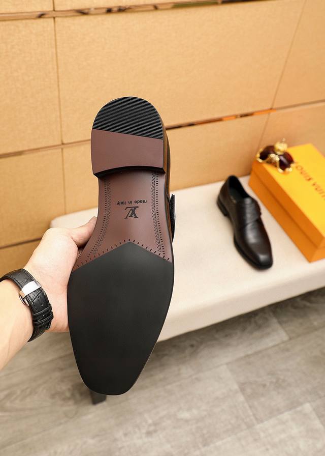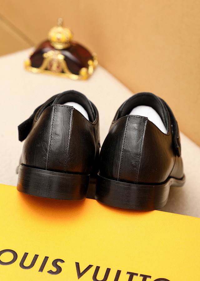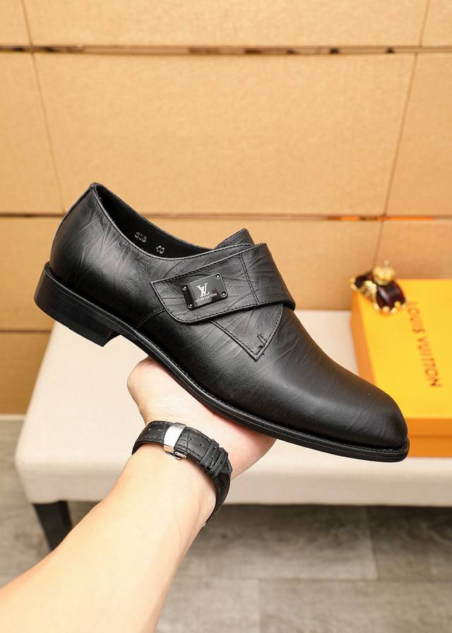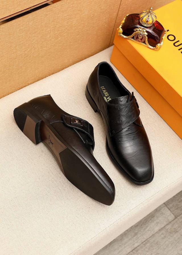 Product Trademark: Louis Vuitton Business Leather Shoes True to Size: 38-44, 45-46 (Custom Made) Materials: Selected imported top-grain calfskin with textured upper and luxurious hardware buckles; imported top-grain cowhide lining. Strong 3D visual effect; original outsole. Colors: 3 leather options available.