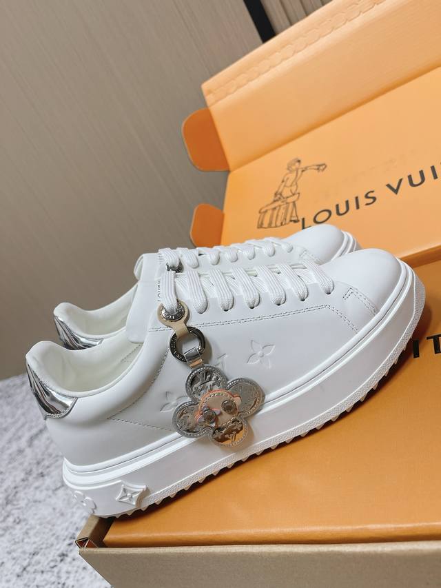 Retailer Grade: DDD LV Time Out Series Platform White Sneakers, classic monogram + white leather, detachable side charm for added detail. Durable and height-enhancing rubber sole, versatile and flattering for everyday wear! The platform sole provides a subtle height boost, comfortable and stylish. Easily complements both casual and sporty looks, a popular classic LV style, praised by the fashion world! DDD Size: #35-41 40.41 Made to order, no returns or exchanges DDD