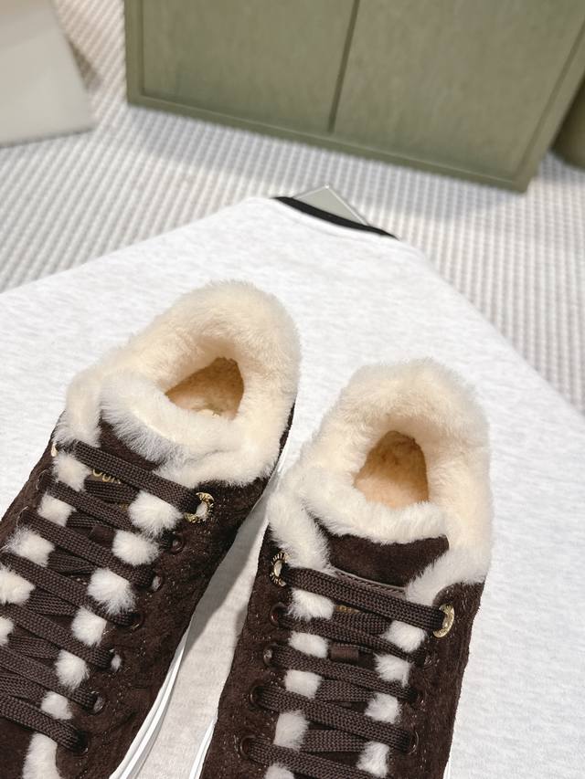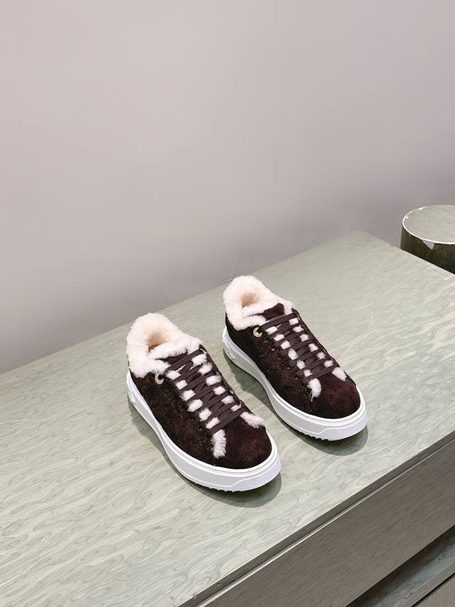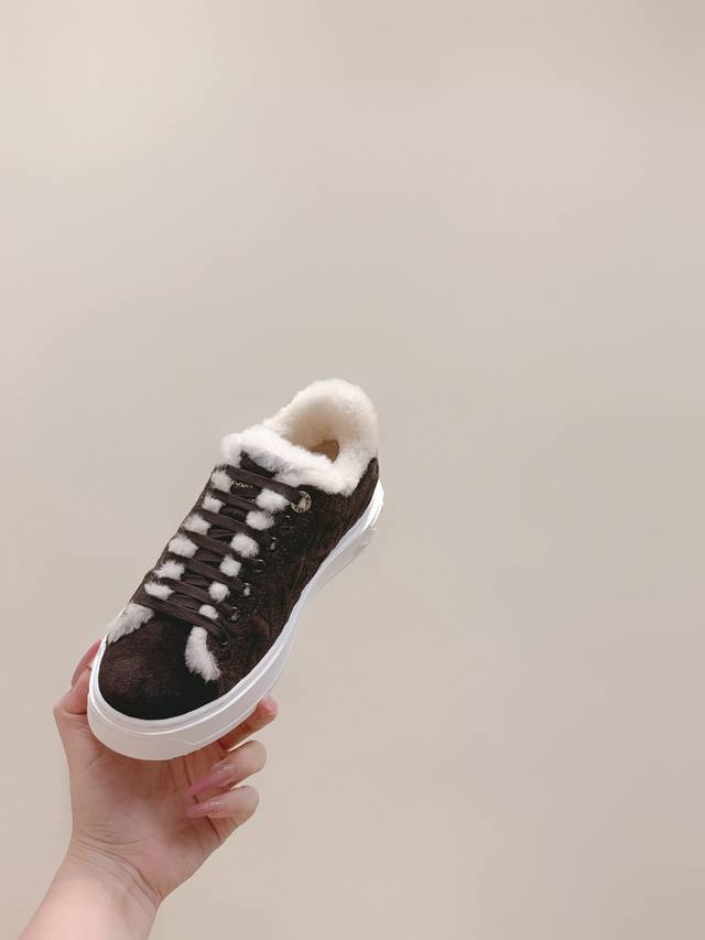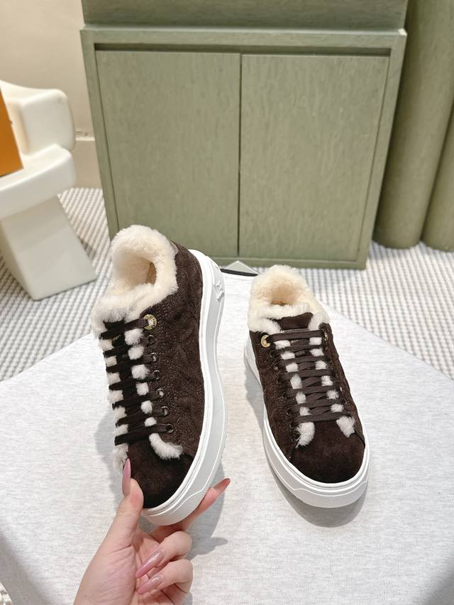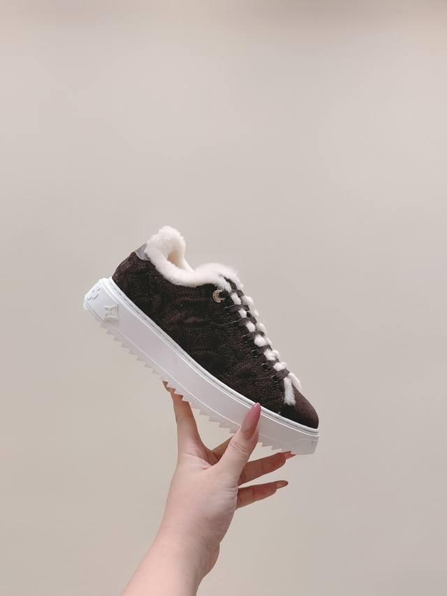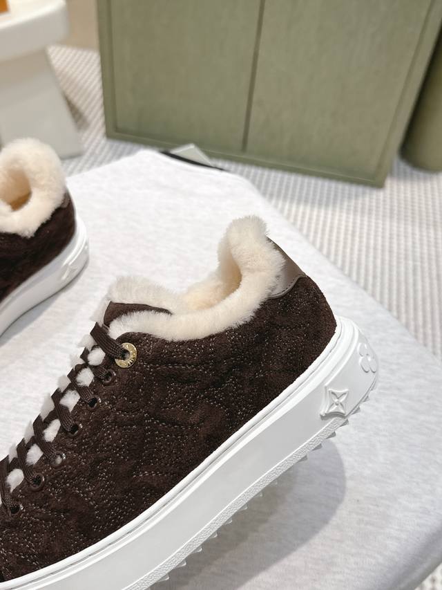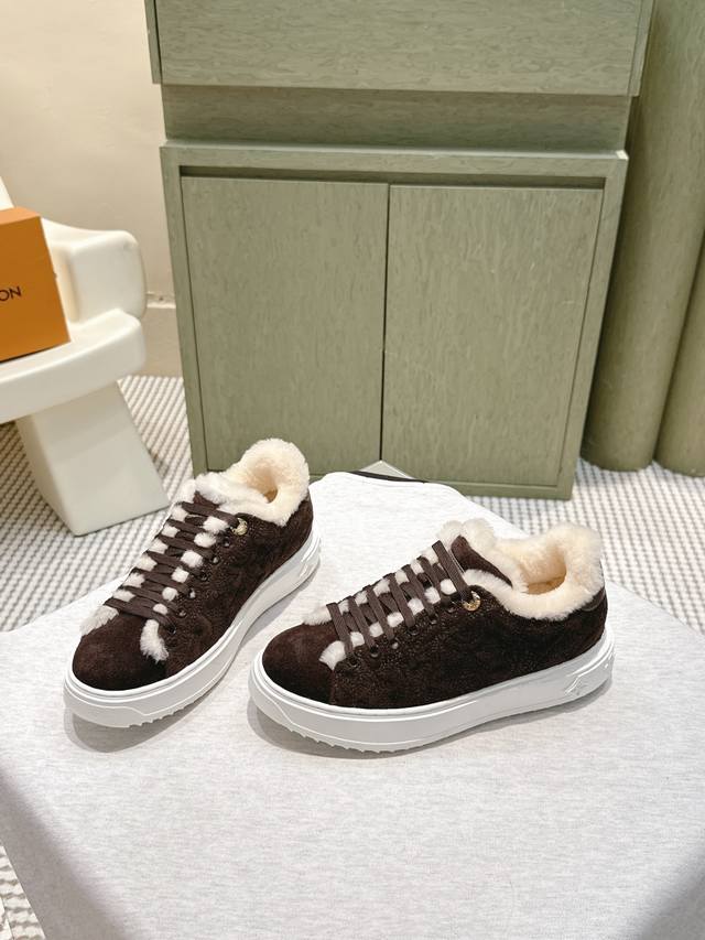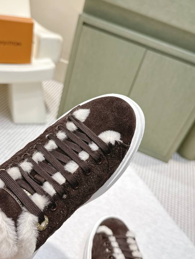 Retail-grade Louis Vuitton Time Out Casual Sneakers, White Sneakers with Fleece Lining. This Time Out sneaker combines cowhide leather with Monogram denim, echoing the season's leather goods collection. A denim luggage tag is secured to the upper with leather straps, highlighting Louis Vuitton's travel heritage. Striking eyelets and embossed brand logo on the tongue add sophisticated details. Upper: Original cow suede; Lining: Wool; Outsole: Original mold. Size: 35-39, 40-41. Custom-made, no returns or exchanges.