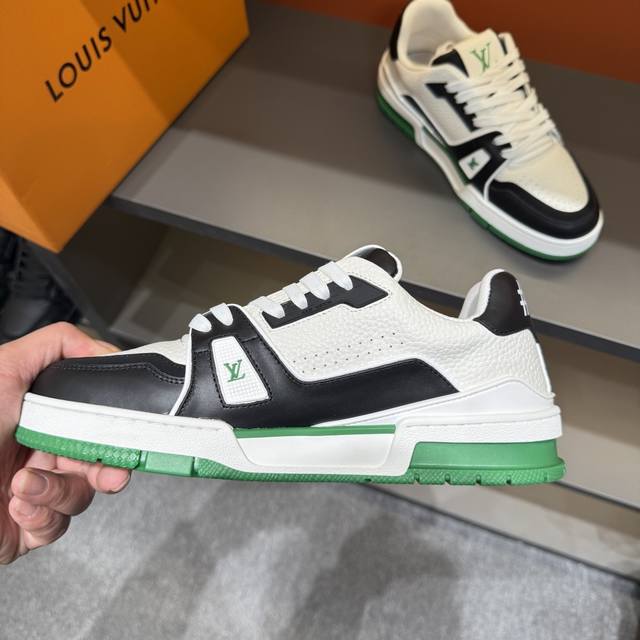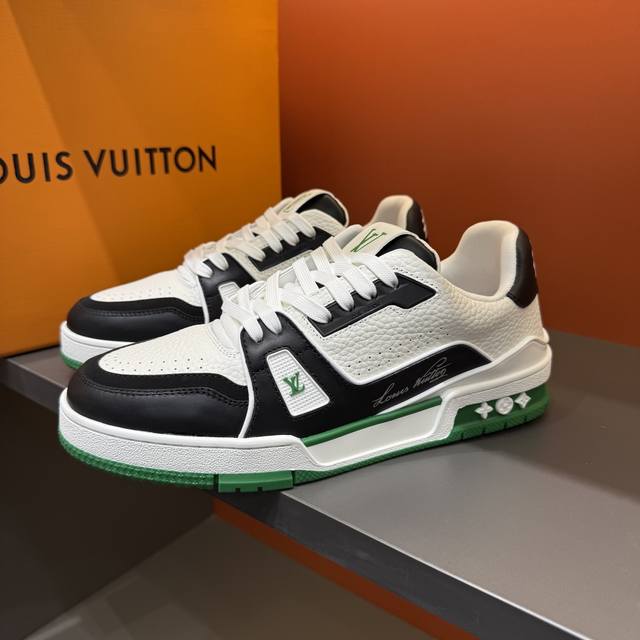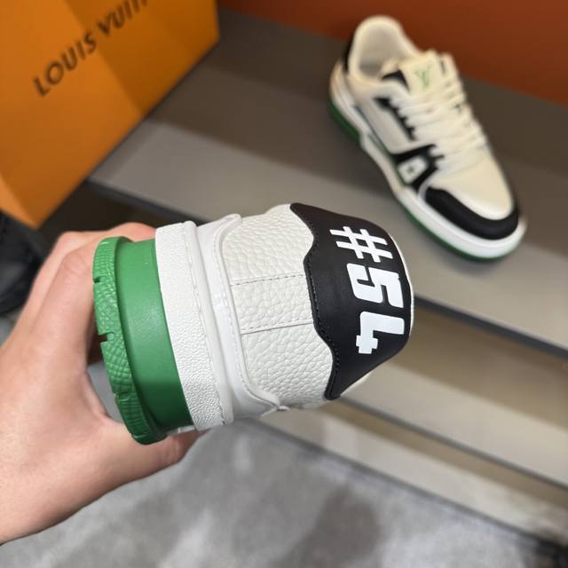 Sizes 38-45. This new colorway of the Louis Vuitton Trainer sneaker is crafted from soft grained calfskin, presenting a pure color. The #54 logo on the heel traces the brand's founding in 1854, while the designer's handwritten logo adorns one side. Designed by Virgil Abloh himself, this sneaker is highly commemorative. The new Louis Vuitton Trainer Sneaker Low is a versatile basketball shoe suitable for casual sports and culture.