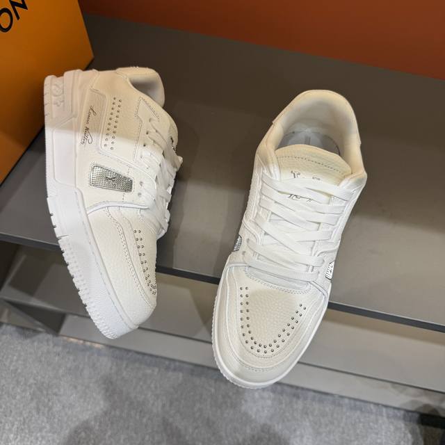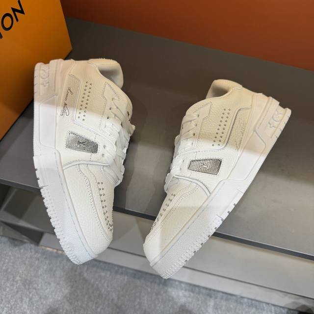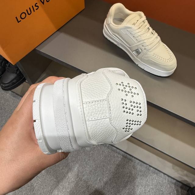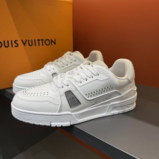 Sizes 38-45. This new colorway of the Louis Vuitton Trainer sneaker is crafted from soft grained calfskin, presenting a pure color tone. The #54 logo on the heel traces the brand's founding in 1854, while the designer's handwritten logo adorns one side. Designed by Virgil Abloh himself, this sneaker is highly commemorative. The new Louis Vuitton Trainer Sneaker Low is a versatile basketball shoe suitable for casual sports and culture.