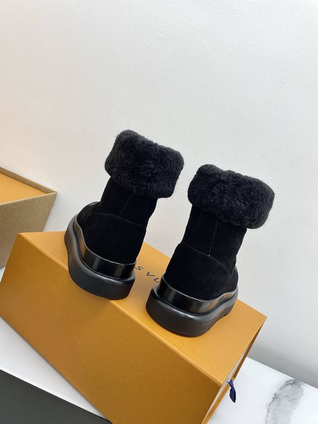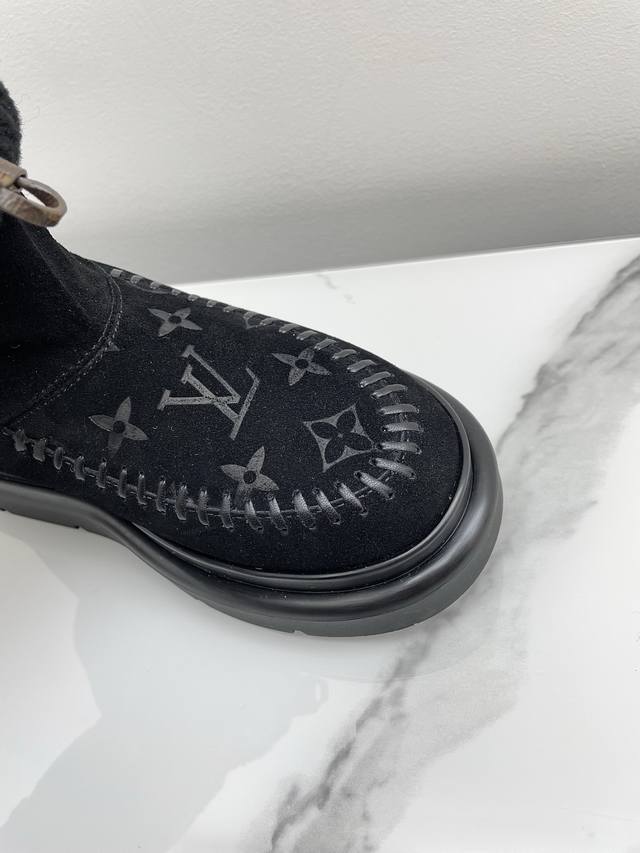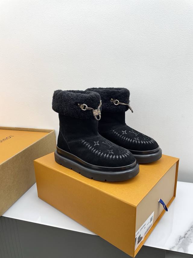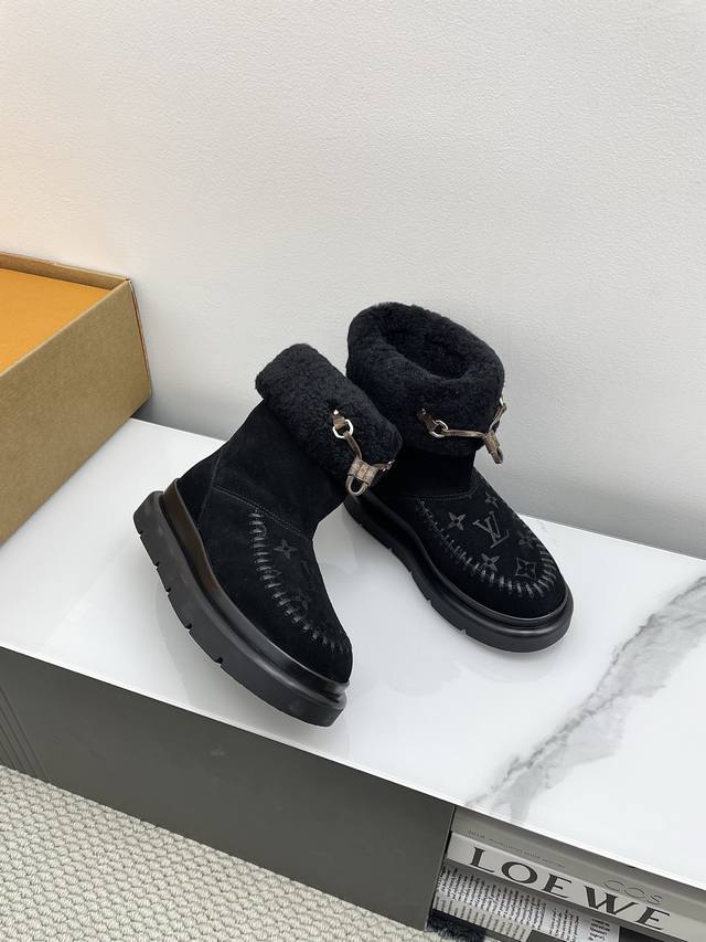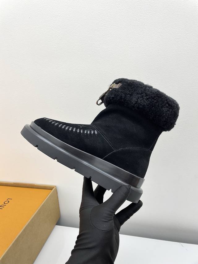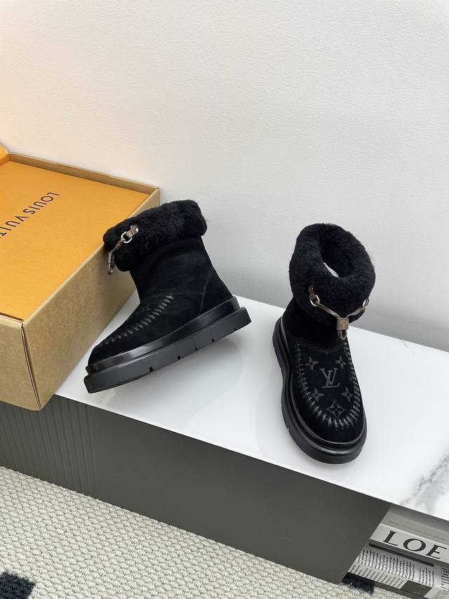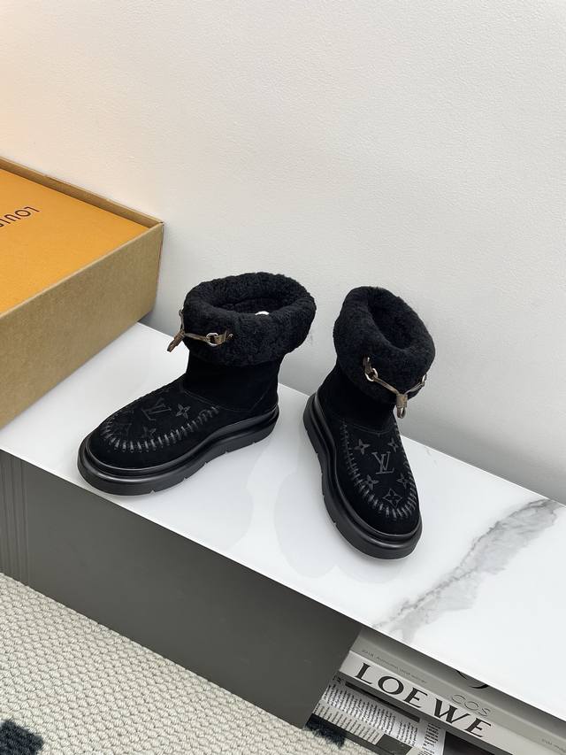 Slippers & Ankle Boots LV Louis Vuitton Cortina Series Fur Boots, Snow Boots & Ankle Boots DDD This Cortina closed-toe slippers are from the LV Ski series, featuring suede cowhide with partial Monogram pattern embossing, a comfortable sheepskin lining, and leather laces adorned with the LV Circle logo. The comfortable design seamlessly transitions between winter holidays and city life. DDD Delivered with exquisite boutique packaging. DDD Material: Original custom-made imported top-grain cowhide DDD Lining: Imported warm sheepskin lining DDD Sole: Original molded non-slip TPU material DDD Sole thickness: 4.5cm DDD Size: Women's 35-41 40 41 (Custom made) DDD