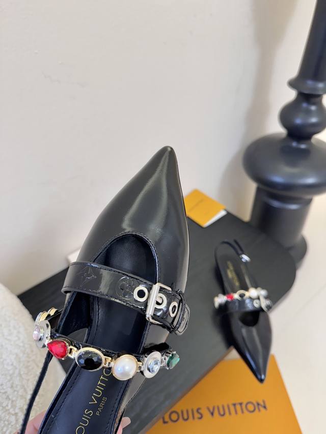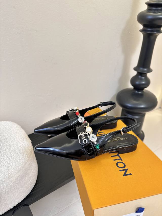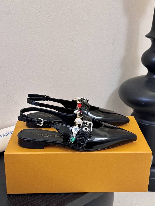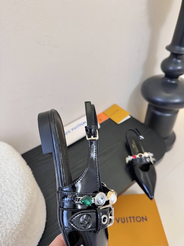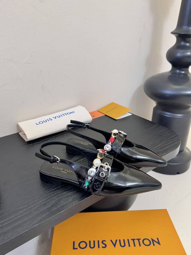 Summer New Arrival Louis Vuitton Legacy Slingback Sandals, Pointed Toe Kitten Heel Sandals. This Legacy slingback sandal continues the traditional design with smooth cowhide leather, highlighting the heritage theme of Louis Vuitton's Spring/Summer 2025 runway show. The graceful pointed toe and kitten heel exude elegance, while the Monogram canvas heel incorporates elements of trunk handles. Subtle elastic trim allows for easy on and off. Upper: Cowhide; Lining/Insole: Sheepskin; Sole: Italian Leather; Heel Height: 9cm/6cm (Flat); Sizes: 35-41; Sizes 40 and 41 are custom-made and non-refundable .