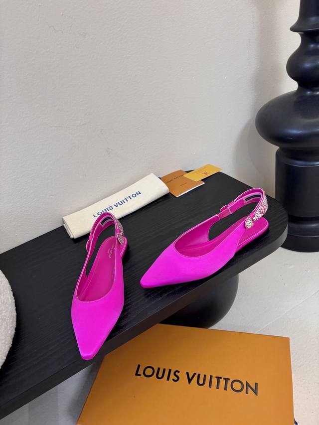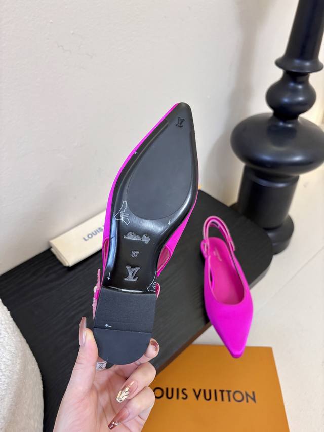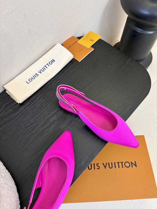 Summer New Louis Vuitton Legacy Slingback Sandals, Pointed Toe Kitten Heel Sandals. This Legacy slingback sandal continues the traditional design with smooth cowhide leather, highlighting the heritage theme of Louis Vuitton's Spring/Summer runway show. The graceful pointed toe and kitten heel exude elegance, while the Monogram canvas heel incorporates elements of trunk handles. Subtle elastic trim allows for easy on and off. Upper: Silk; Lining/Insole: Sheepskin; Sole: Italian Leather; Heel Height: 9cm/6cm (Flat); Sizes: 35-41; Sizes 40 and 41 are custom-made and non-refundable.