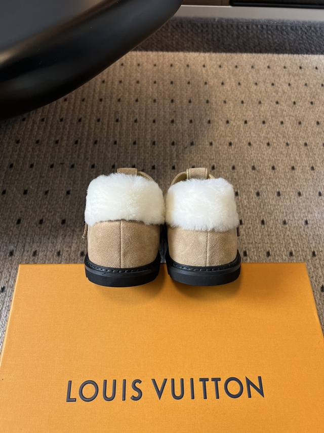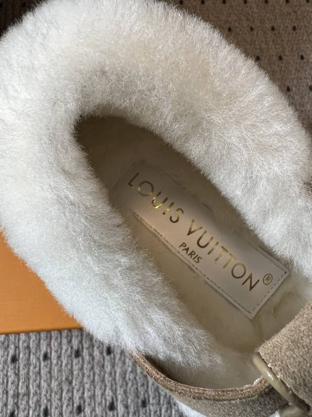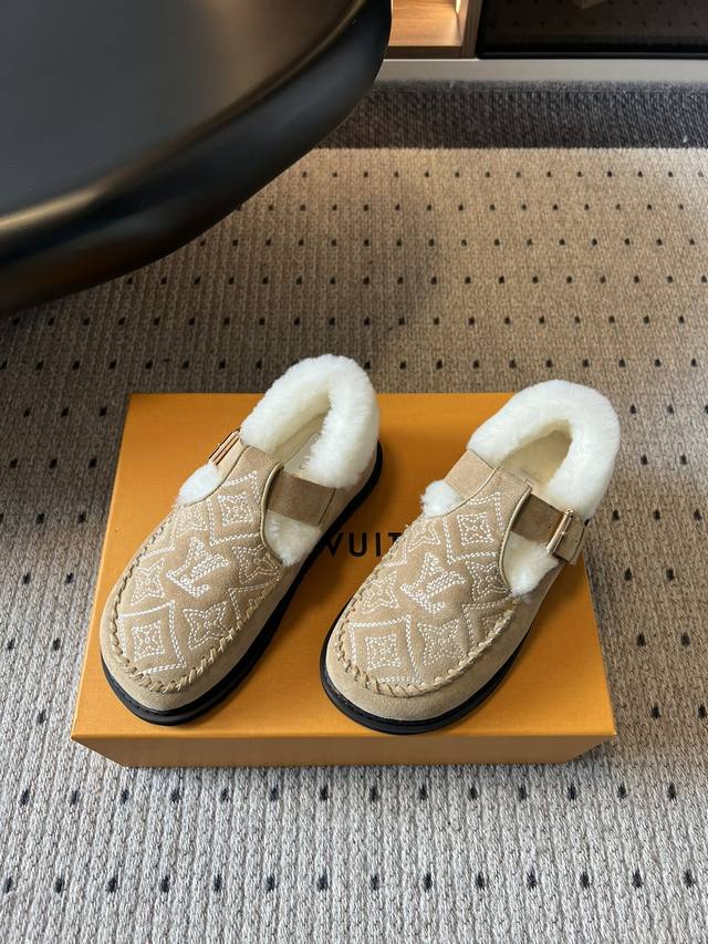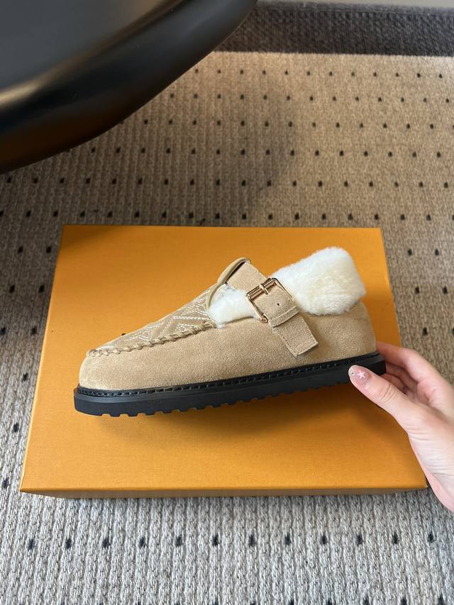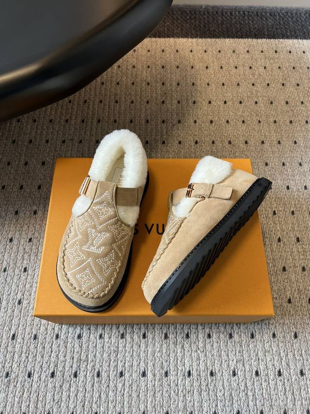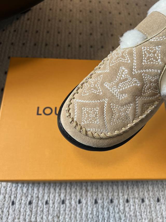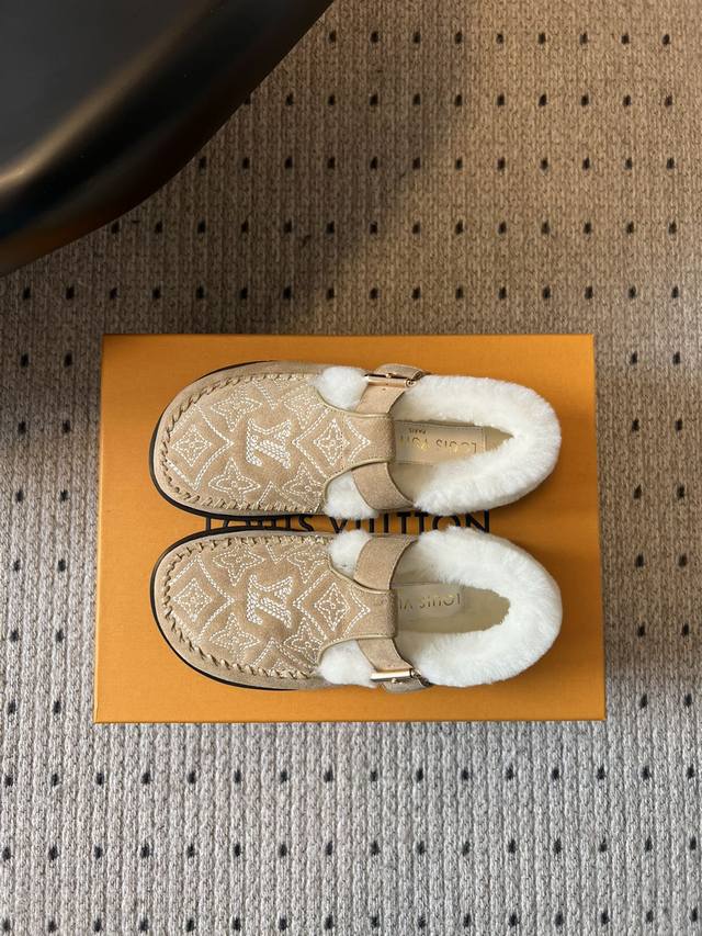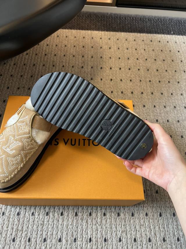 Top Quality Louis Vuitto Monogram Embroidered Plush Mules. These mules blend a retro silhouette with classic brand elements. The upper features the iconic LV monogram embroidery, paired with a metal buckle design, exuding a luxurious feel amidst the retro look. The plush collar adds warmth and a touch of cuteness. Made of suede with a plush lining, these shoes offer excellent warmth, perfect for autumn and winter wear. The suede material also enhances the shoe's texture and sophistication. Pair them with a retro-style plaid coat or wool suit to highlight their vintage and luxurious feel, suitable for parties or fashion events, showcasing sophisticated taste. They also pair well with loose knitwear and wide-leg pants for a casual and comfortable look, suitable for everyday outings, coffee shop visits, etc., offering both warmth and style. Upper: Calfskin Lining: Wool Outsole: TPU Size: 35-41