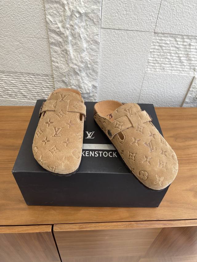 Top Version: DDD Birkenstock x Louis Vuitton Unisex Soft-Soled Closed-Toe Slippers DDD The Birkenstock x Louis Vuitton collaboration features the brand's iconic embossed monogram leather, a classic closed-toe slipper design, and a buckle. Available in off-white, light gray, and black, these slippers offer both distinctiveness and versatility. The monogram pattern enhances brand recognition, while the simple silhouette suits various casual or light business occasions. DDD Material: Imported suede DDD Lining: Imported sheepskin DDD Outsole: Original molded cork sole with rubber foam DDD Size: Women's # 35-40 (40 is custom-made and non-refundable) DDD Men's # 39-45 (45 is custom-made and non-refundable) DDD