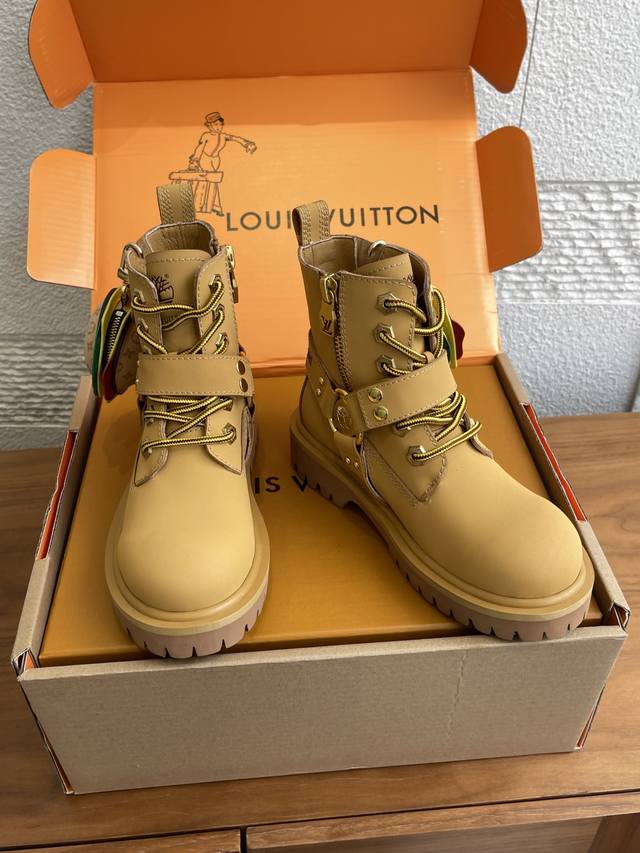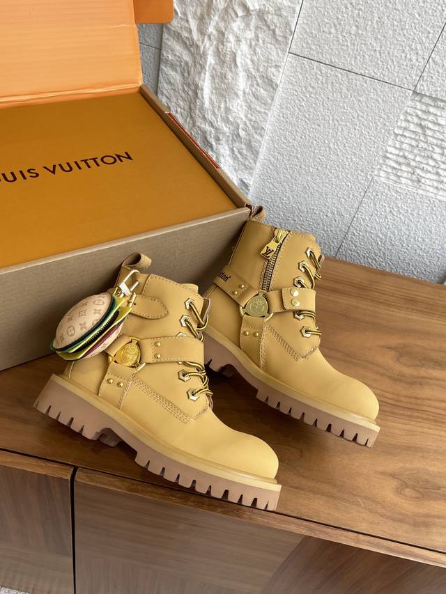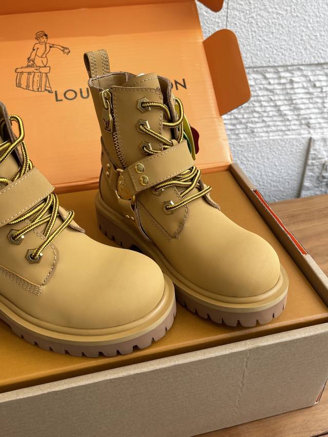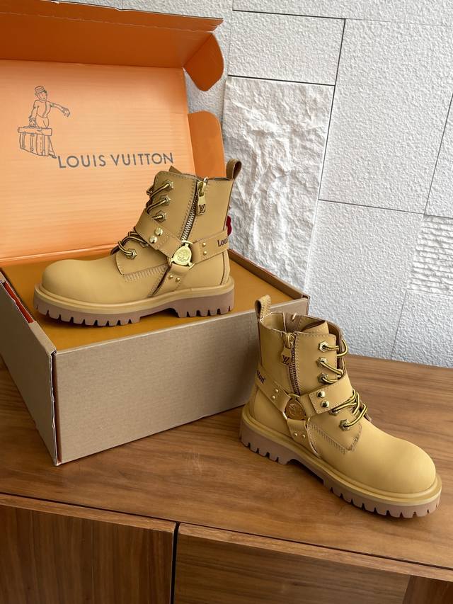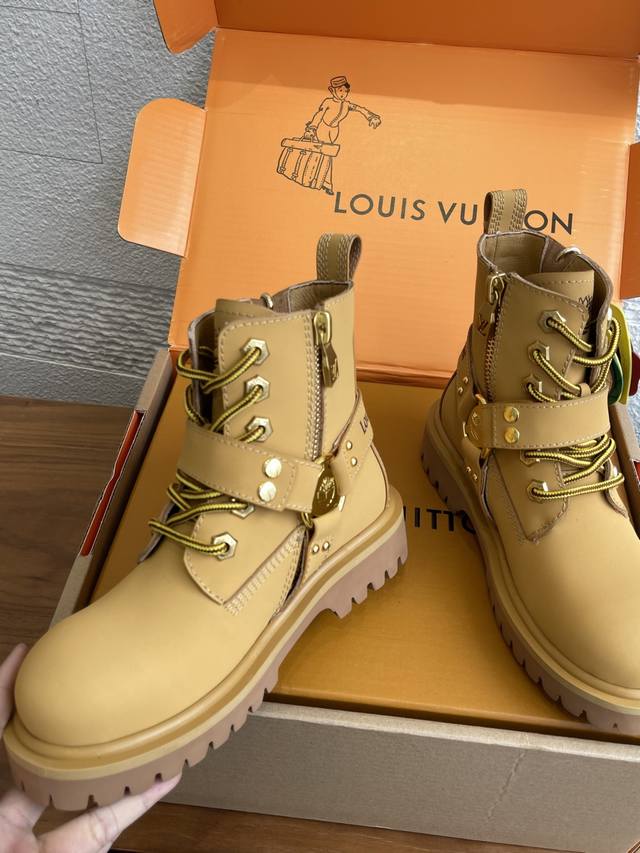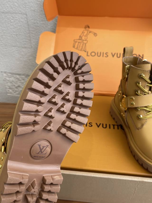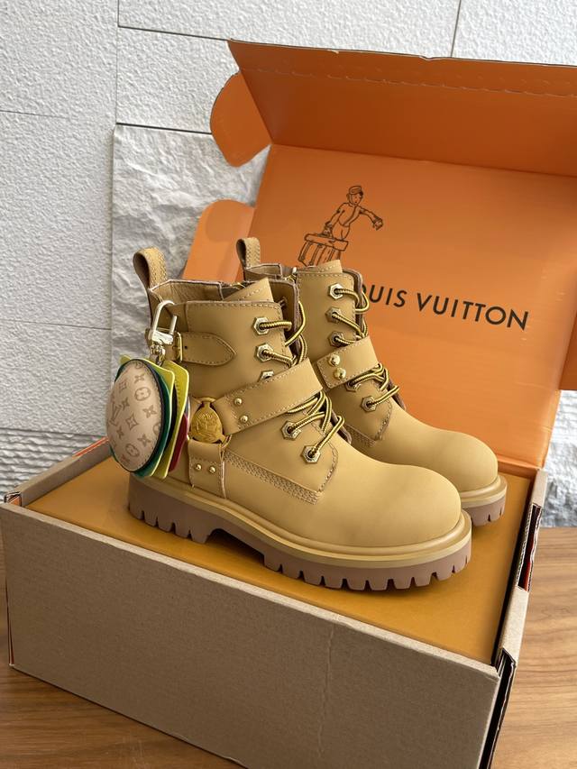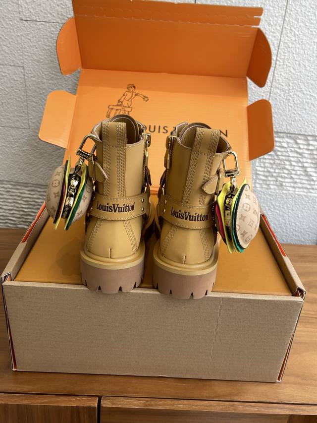 Top Version: Women's Delivery, Exquisite Airplane Box, Men's (without hamburger) - 140 Louis Vuitton 2025 Autumn/Winter New Couple Style Detachable Hamburger-Shaped High-Top Boots, Mid-Calf Boots, Ankle Boots When Louis Vuitton's exquisite leather craftsmanship meets urban playful inspiration, this unique cowhide couple boot collection is born. Made from premium cowhide leather, the collection comes in classic black and vibrant yellow, and features a detachable hamburger-shaped charm, cleverly blending high fashion with relaxed fun. Available in high-top, mid-calf, and ankle boot styles, it provides fashionable couples with a perfectly coordinated head-to-toe look. Fun Hamburger Charm Each boot features a detachable mini hamburger-shaped charm on the side, crafted with leather and metal stitching. The charm can be adjusted in position, injecting a touch of playful energy into the simple boot design.