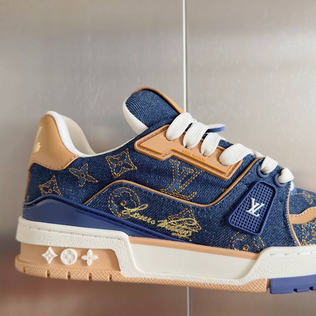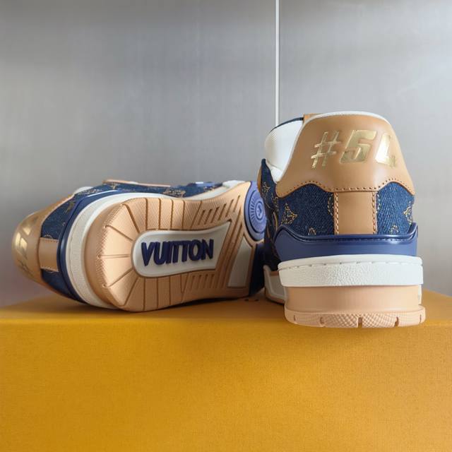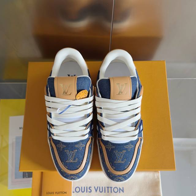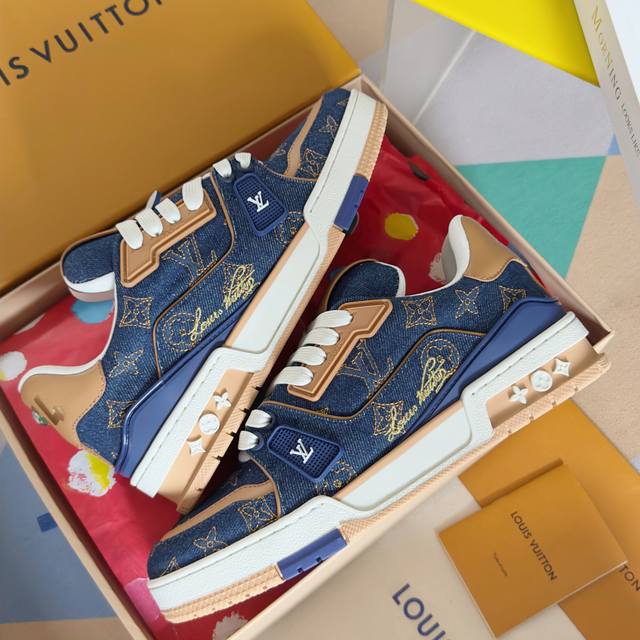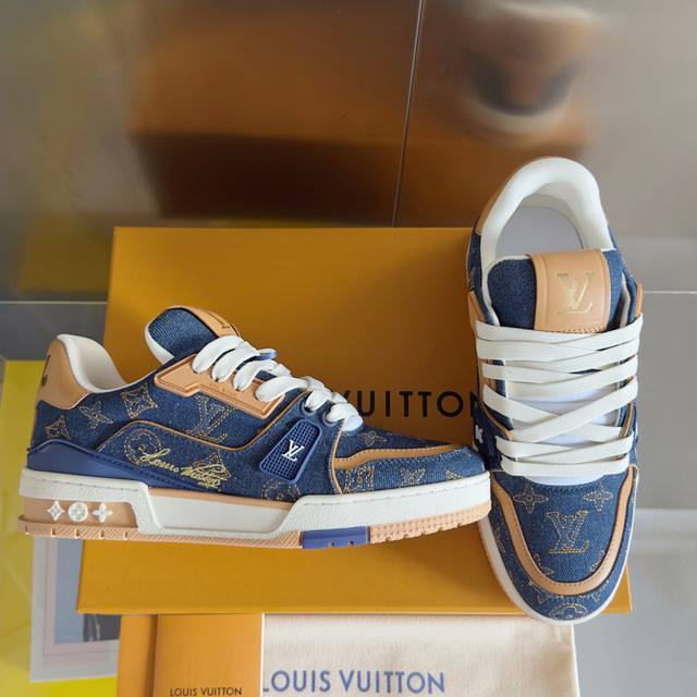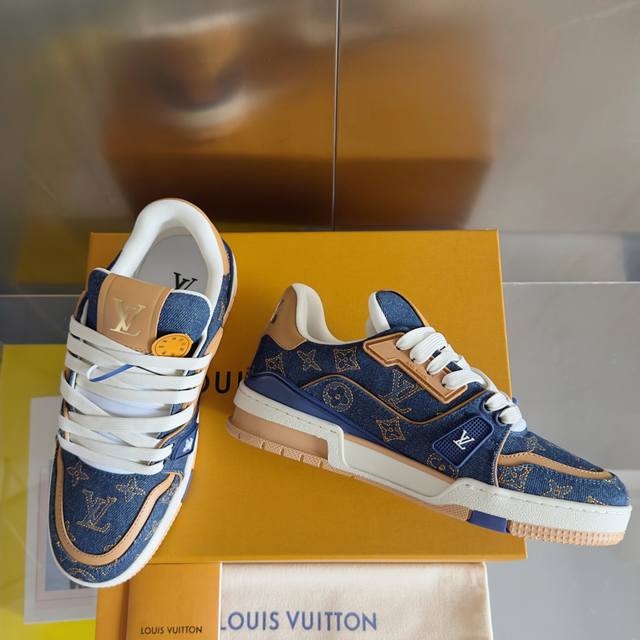 Top-tier version: Couple's style Lv Trainer Louis Vuitton casual sneakers/skate shoes. Original purchase and development. This Lv Trainer sneaker features smooth cowhide leather with a Monogram pattern, inspired by retro basketball shoes. The intricate upper is adorned with the Lv lettering and the #54 logo, tracing the brand's founding in 1854. Comes with exquisite boutique packaging. Material: Original custom imported top-grain cowhide. Lining: Original custom breathable mesh. Outsole: Original molded anti-slip TPU material. Sole thickness: 3cm. Size: Women's 35-41, Men's 38-46.