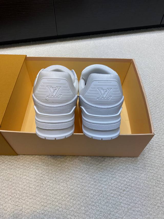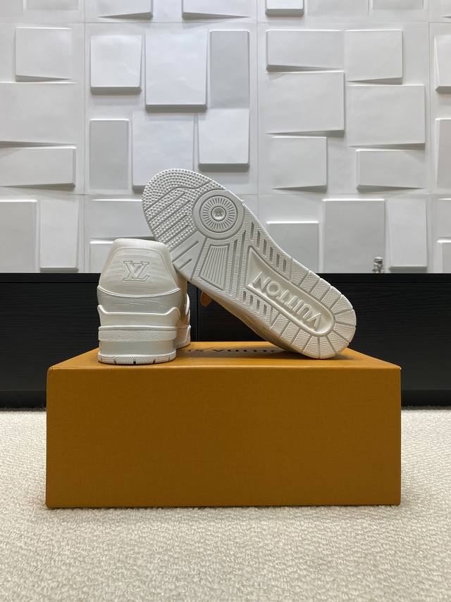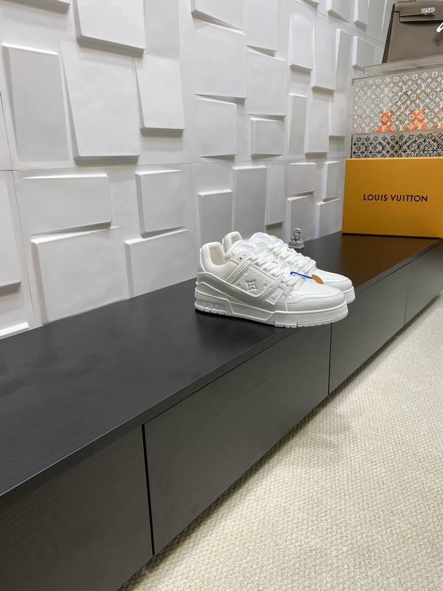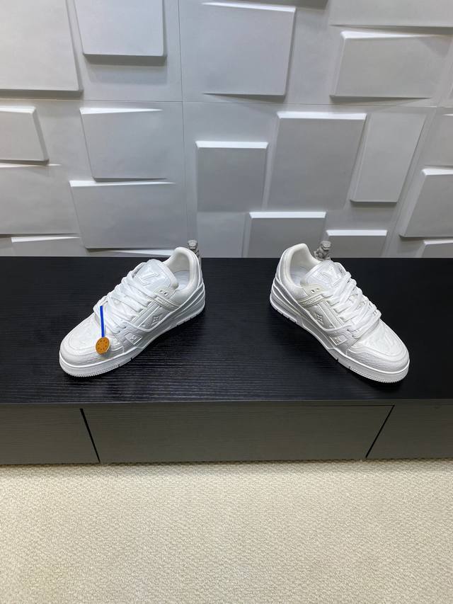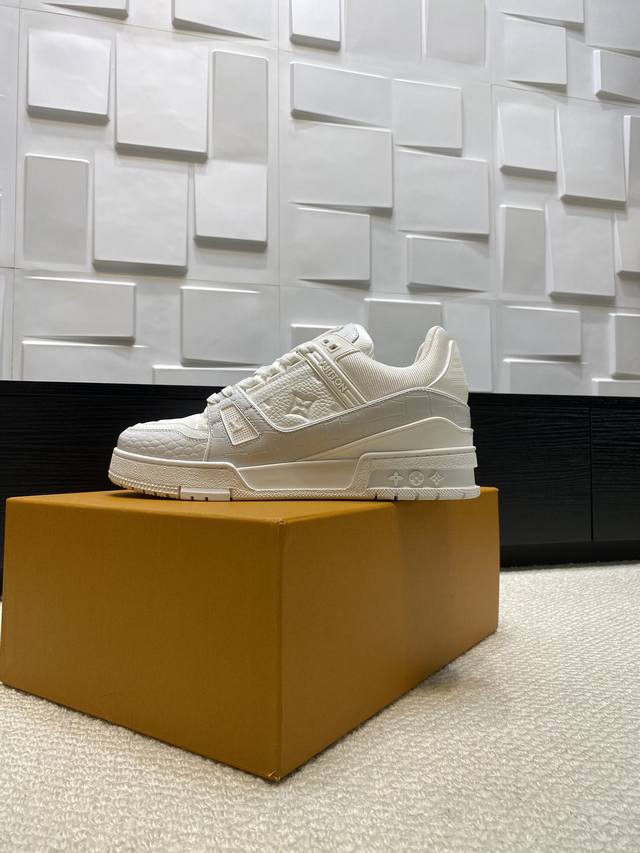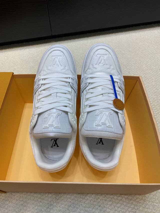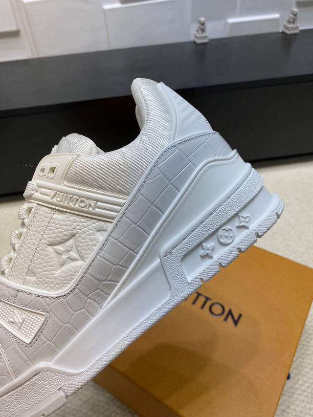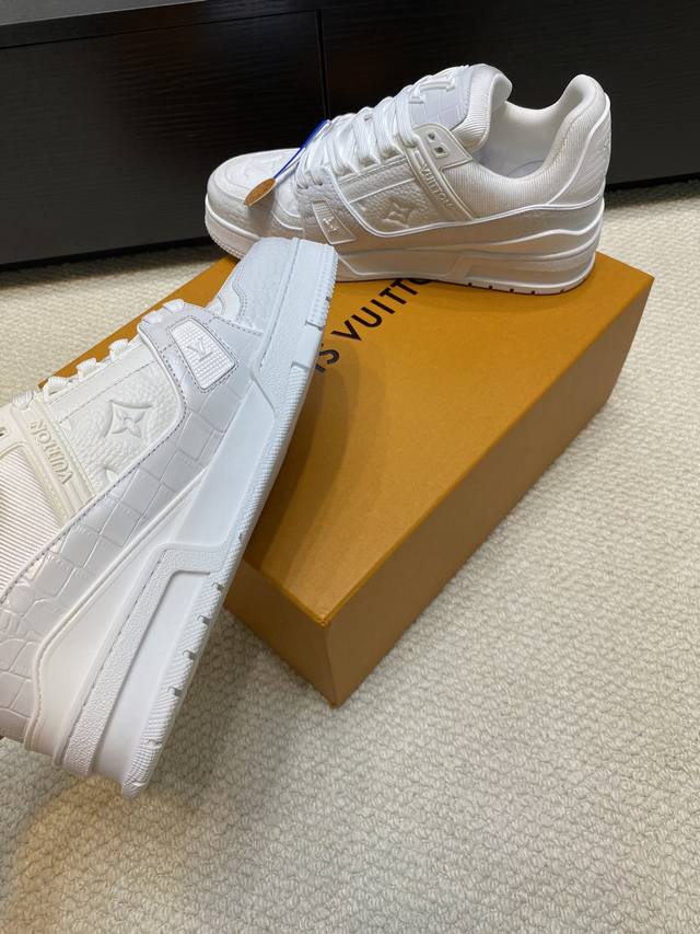 Top-tier version: Crocodile-patterned Louis Vuitton x Tyler collaboration LV Tarine embossed couple's casual sneakers/skate shoes. Original purchase and development. The Louis Vuitton x Tyler collaboration launched the LV Trainer sneakers, continuing Virgil Abloh's classic design based on retro basketball shoes. The cowhide leather upper incorporates the Craggy Monogram embossing and Louis Vuitton logo, showcasing Tyler's playful reconstruction of the Monogram pattern and brand elements. Comes with exquisite boutique packaging. Material: Original custom top-grain cowhide. Lining: Original custom breathable mesh. Outsole: Original molded two-tone TPU combination outsole. Sole thickness: 3cm. Size: Women's 35-41, Men's 38-46.