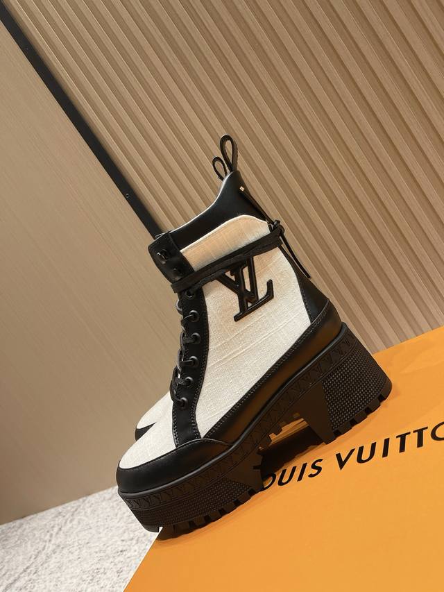 Top-tier version: High-quality LV (Louis Vuitton) classic high-heeled combat boots, chunky heel sand boots series, original 1:1 replica. Comparable details include last, material, outsole, cowhide monogram leather upper, sheepskin lining, and genuine leather laces. Heel height 7cm, platform 3.5cm. Stylish, slimming, height-increasing, comfortable to walk in. Sizes: 35-40. Order 41.42.