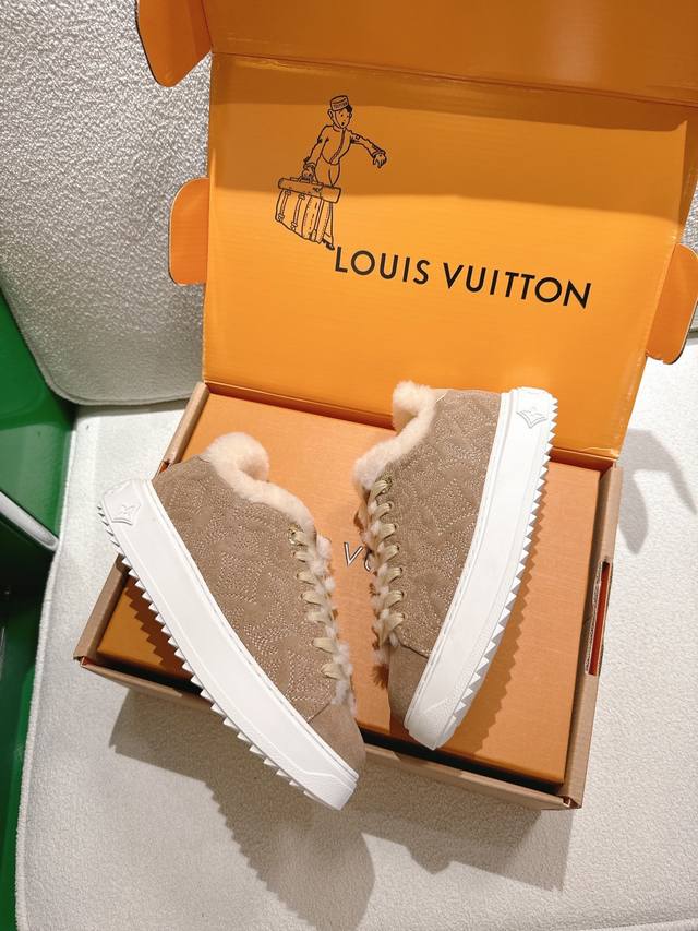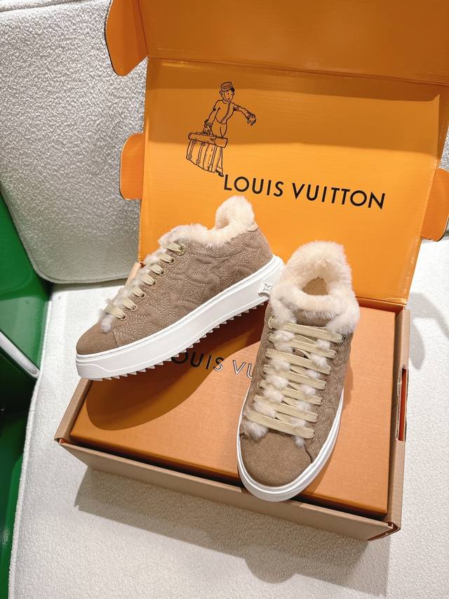 Top-tier version K007 DDD Louis Vuitton Time Out casual sneakers, white sneakers with fur lining DDD This Time Out sneaker combines cowhide leather with Monogram denim, echoing the season's leather goods collection. A denim luggage tag is secured to the upper with leather straps, showcasing Louis Vuitton's travel heritage. Striking eyelets and embossed brand logo on the tongue add sophisticated details. DDD Sizes: 35-40 41 (Custom made) DDD