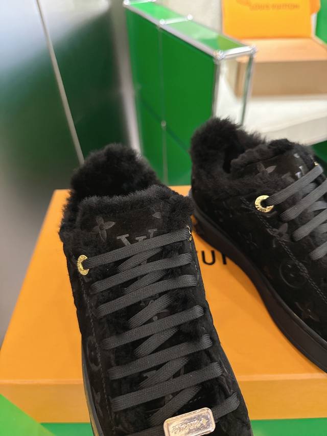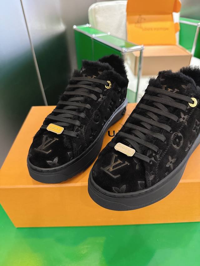 Top-tier version K007 DDD Louis Vuitton Time Out casual sneakers, white sneakers with fur lining DDD This Time Out sneaker combines cowhide leather with Monogram denim, echoing the season's leather goods collection. A denim luggage tag is secured to the upper with leather straps, showcasing Louis Vuitton's travel heritage. Striking eyelets and embossed brand logo on the tongue add sophisticated details. DDD Sizes: 35-40 41 (Custom made) DDD