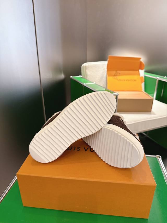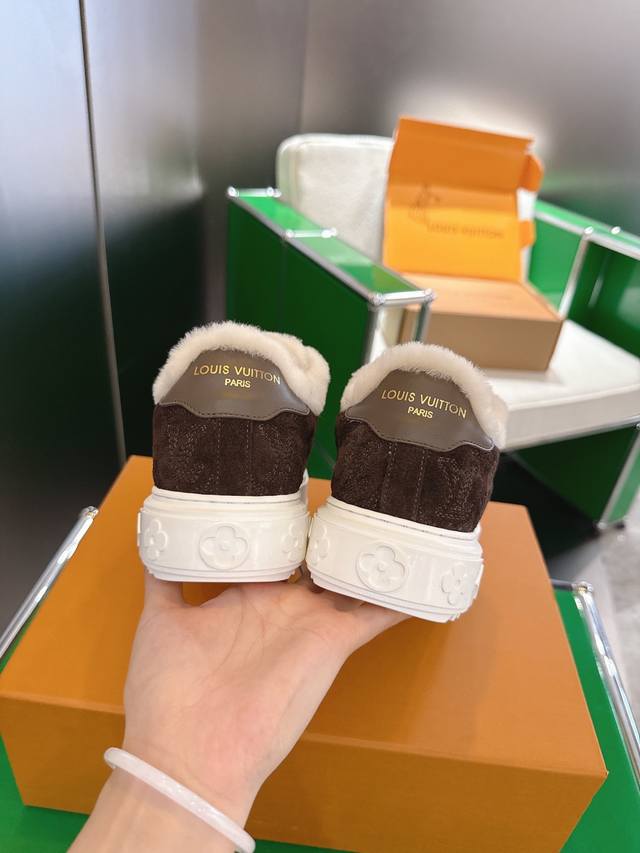 Top-tier version K007 DDD Louis Vuitton Time Out casual sneakers, white sneakers with fur lining DDD This Time Out sneaker combines cowhide leather with Monogram denim, echoing the season's leather goods collection. A denim luggage tag is secured to the upper with leather straps, highlighting Louis Vuitton's travel heritage. Striking eyelets and embossed brand logo on the tongue add sophisticated details. DDD Sizes: 35-40 41 Custom-made DDD