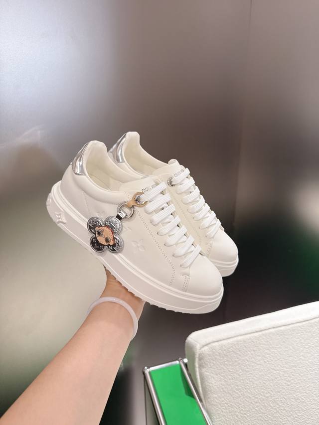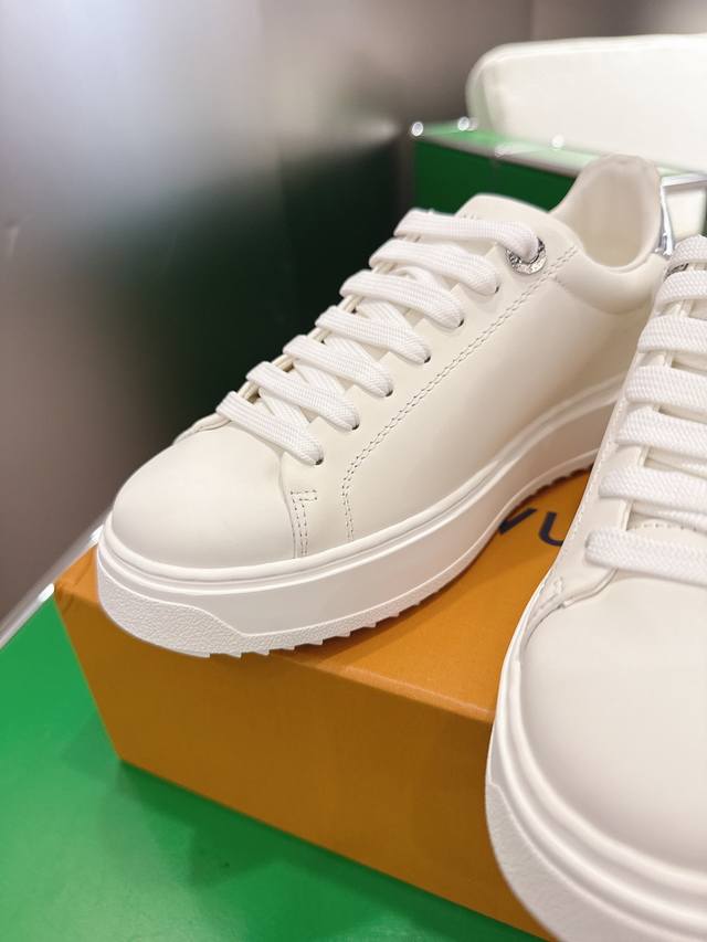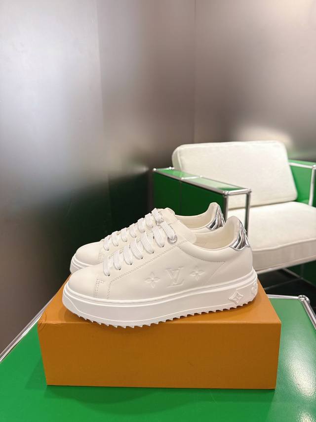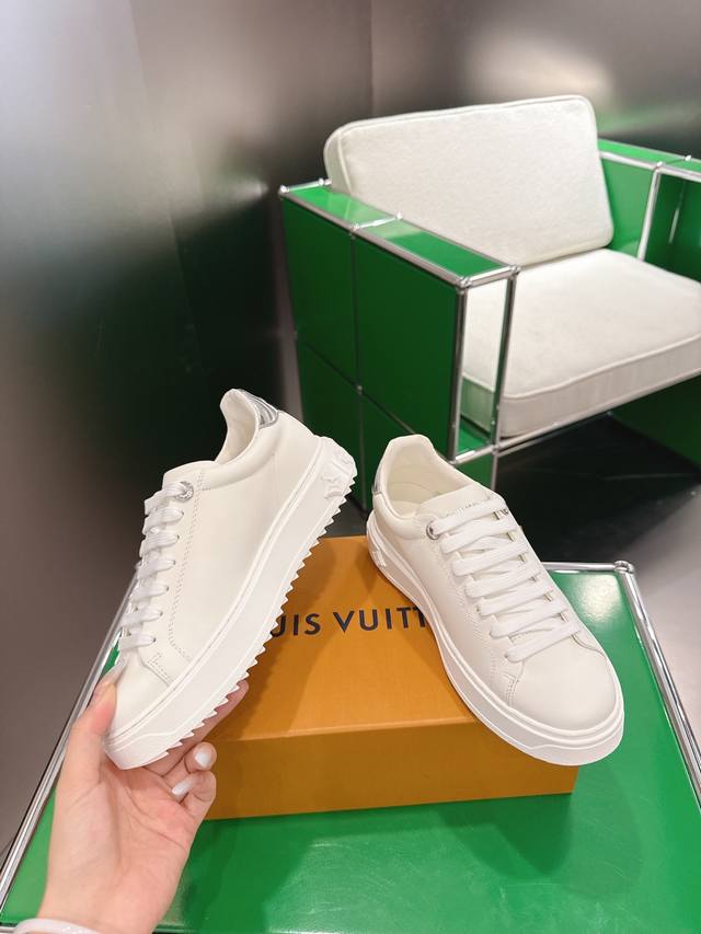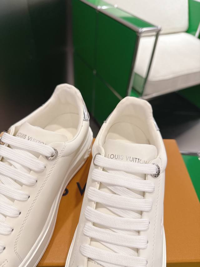This Time Out sneaker combines cowhide leather with Monogram denim, echoing the season's leather goods collection. A denim luggage tag is secured to the upper with leather straps, highlighting Louis Vuitton's travel heritage. Striking eyelets and embossed brand logo on the tongue add sophisticated details.