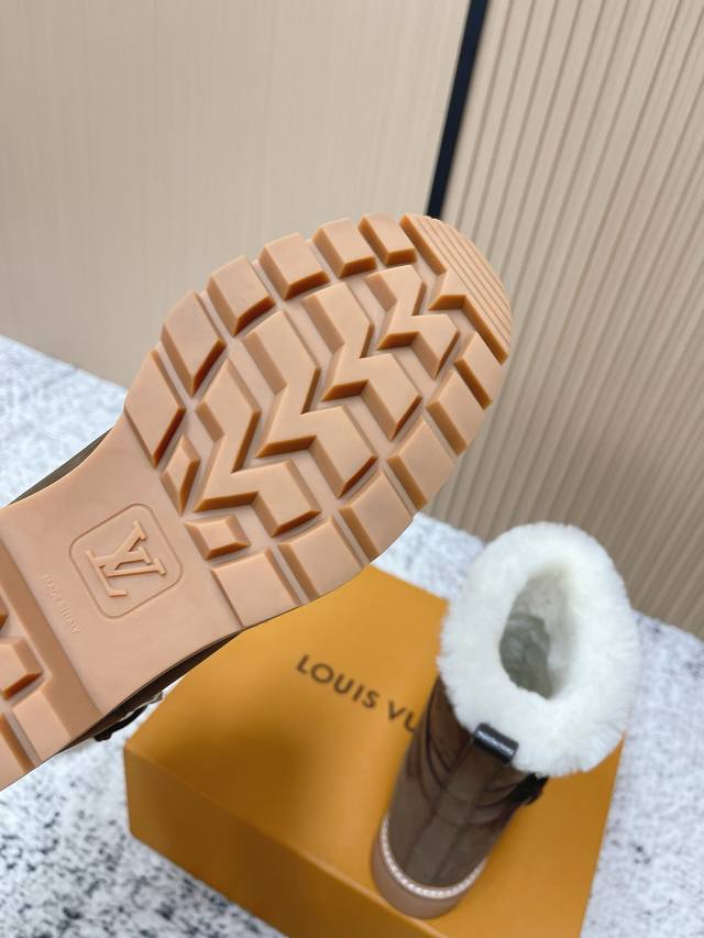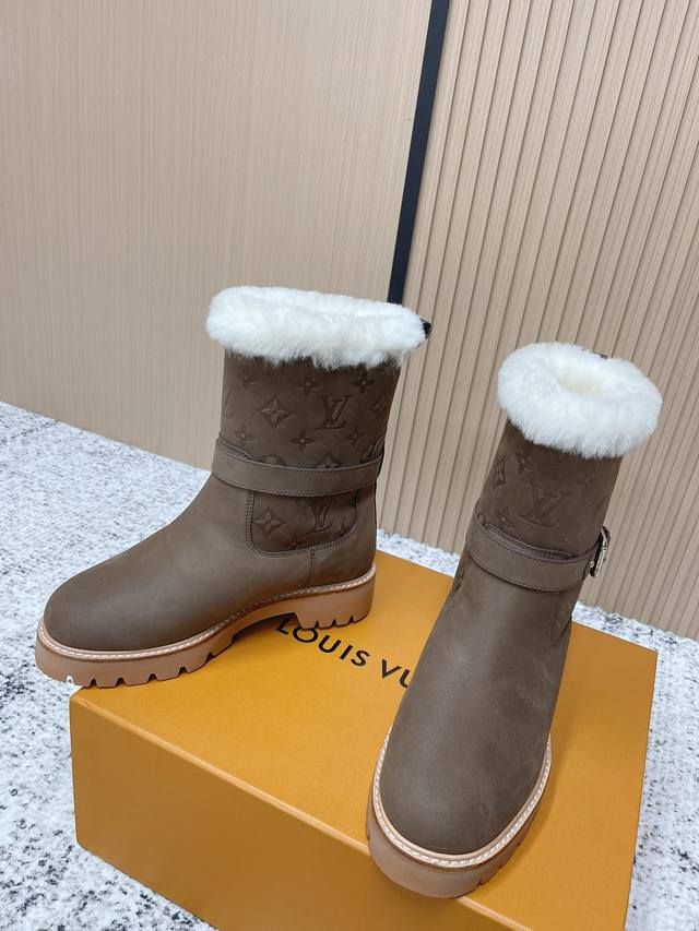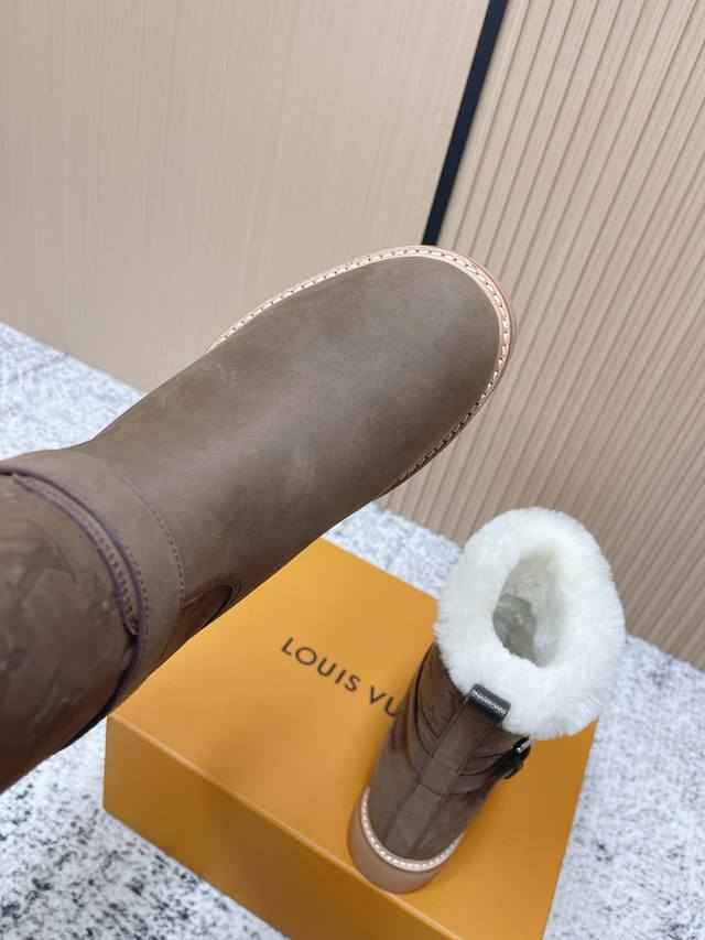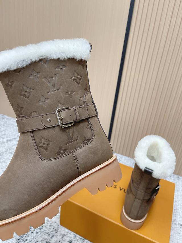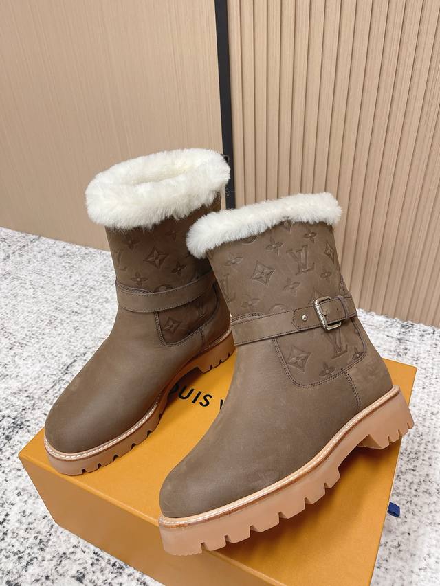 Top-tier version: Louis Vuitton LV Monogram series 25 sheepskin thick-soled snow boots. Monogram fur snow boots, made of suede cowhide with classic monogram embossing, offering a delicate and luxurious feel. The inner lining is made of sheepskin, soft and warm, super comfortable for autumn and winter! The thick sole design provides height, with a Western cowboy style and metal buckle strap, practical and fashionable. Comes with exquisite boutique packaging. Material: Original custom imported top-grain cowhide. Lining: Imported warm wool lining. Sole: Original molded non-slip rubber material. Sole thickness: 3.5cm. Size: Women's 35-41, 40-41 (custom sizes available).
