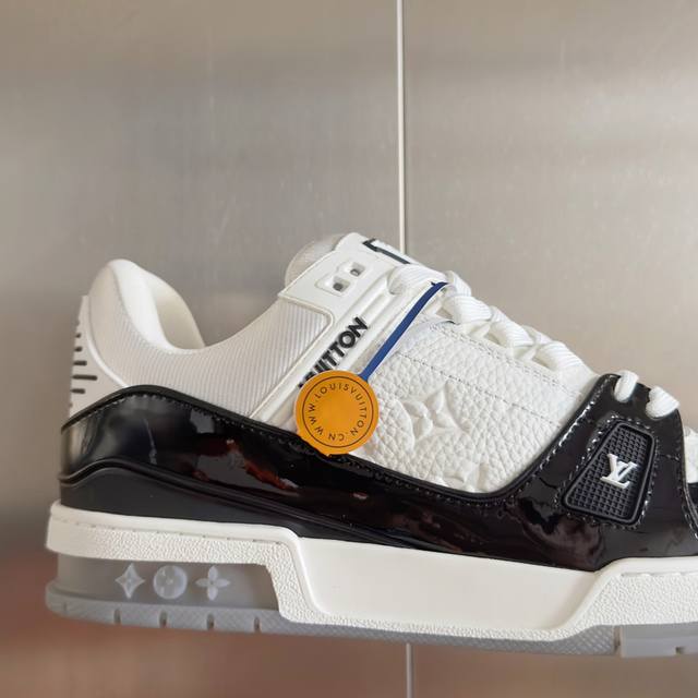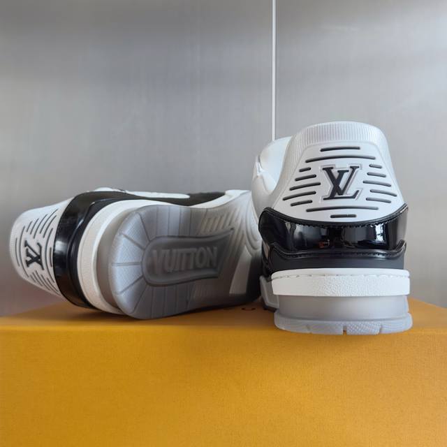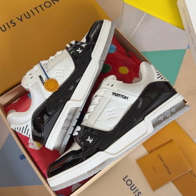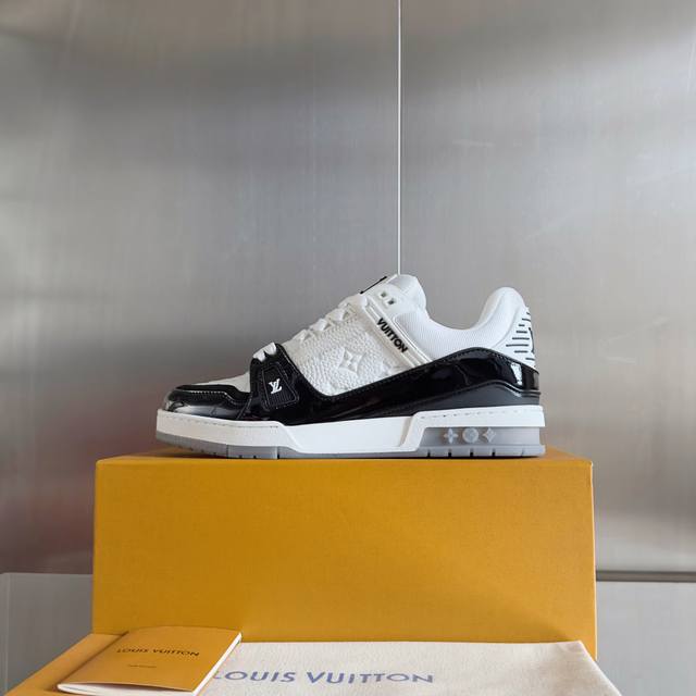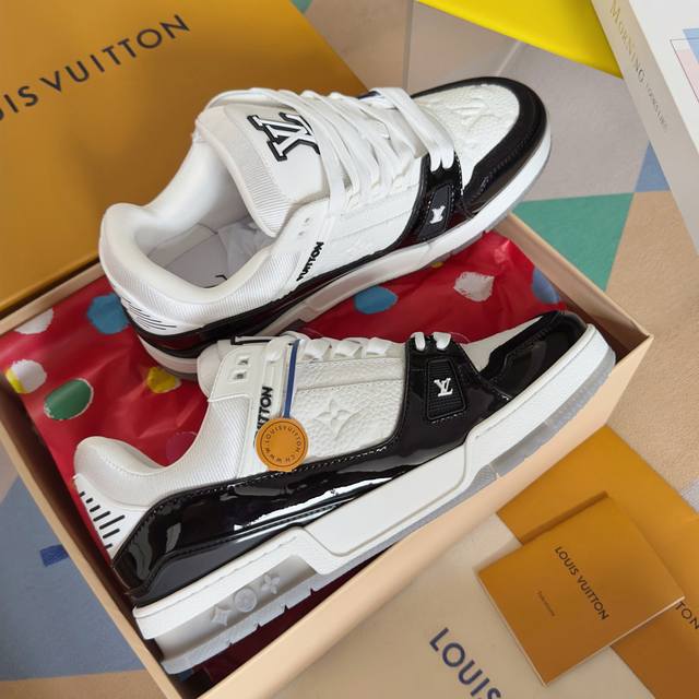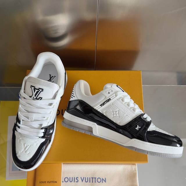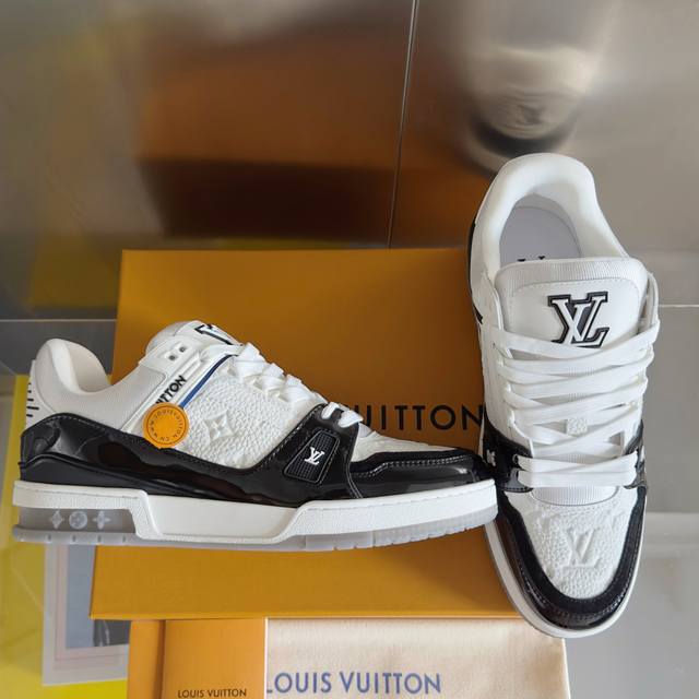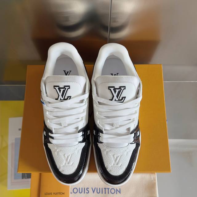Top-tier version: Men's Louis Vuitton Lv Trainer casual sneakers/skate shoes, couple style. Original purchase and development. This Lv Trainer sneaker features a smooth cowhide leather design with a Monogram pattern, inspired by retro basketball shoes. The intricate upper is adorned with the Lv lettering and the #54 logo, tracing the brand's founding in 1854. Comes with exquisite boutique packaging. Material: Original custom imported top-grain cowhide. Lining: Original custom breathable mesh. Outsole: Original molded anti-slip TPU material. Sole thickness: 3cm. Size: Men's 38-46 .