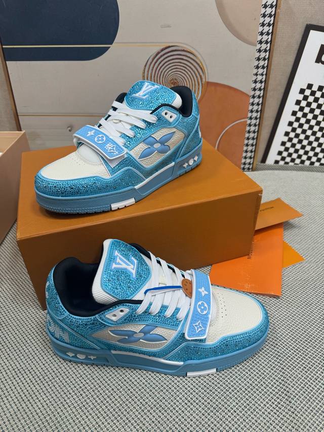 Top-tier version of Louis Vuitto Trainer sneakers, couple style. Purchased from European reseller for 10,000 RMB. A month-long process of disassembling and developing the outsole and upper molds, with three sets of molds discarded before the perfect finish was achieved. A truly meticulously crafted and comfortable shoe. Designed since Vifgil's arrival, this series has been highly favored by fans every season. It pairs well with different fashion styles for added personality. Features include luxurious Louis Vuitto rhinestones, original TPU outsole, and original packaging. Sizes: Women's 35-40, Men's 39-45. Size 38 is custom-made and non-refundable.