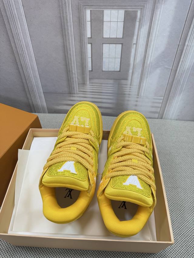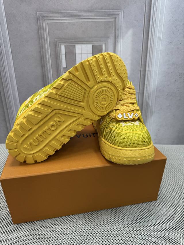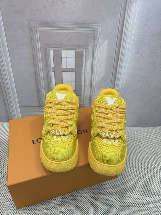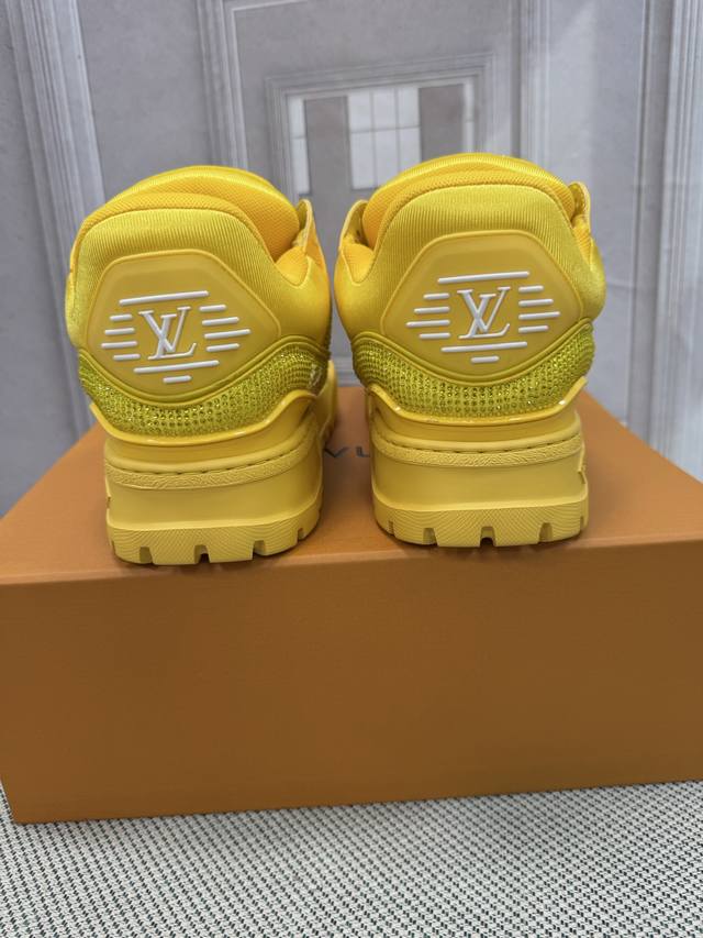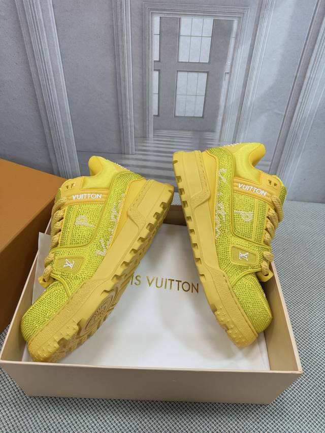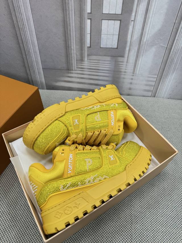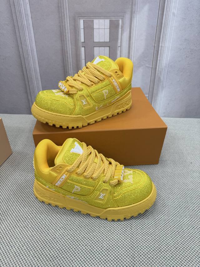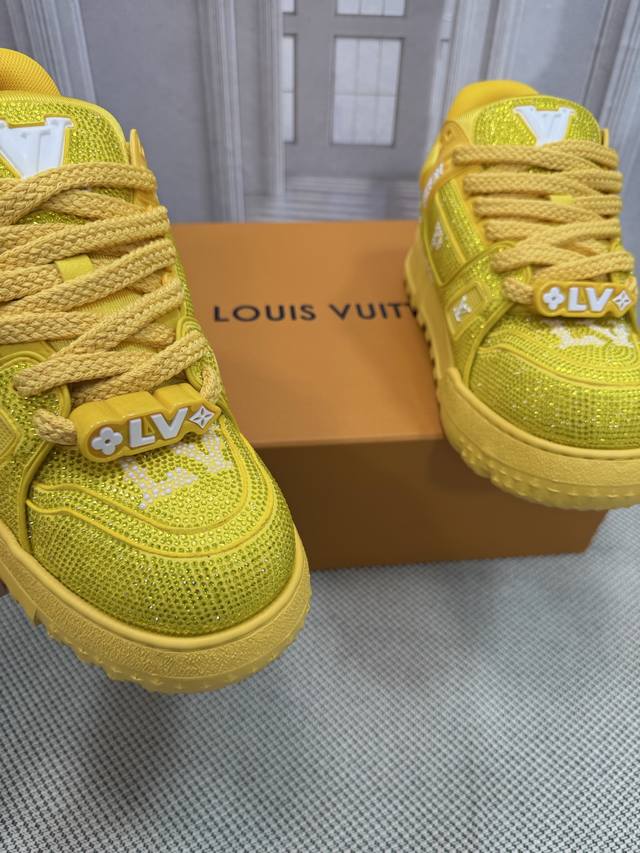 Top-tier version of Louis Vuitto Trainer sneakers, couple style. Purchased from European reseller for 10,000 RMB. A month-long process of disassembling and developing the outsole and upper molds, with three sets of molds discarded before the perfect finish was achieved. A truly meticulously crafted and comfortable shoe. Designed since Vifgil's arrival, this series has been a favorite among fans every season. It pairs well with different fashion styles for added personality. Features include luxurious Louis Vuitto rhinestones, original TPU outsole, and original packaging. Sizes: Women's 35-40, Men's 39-45, 38, 46. Custom orders are non-refundable.