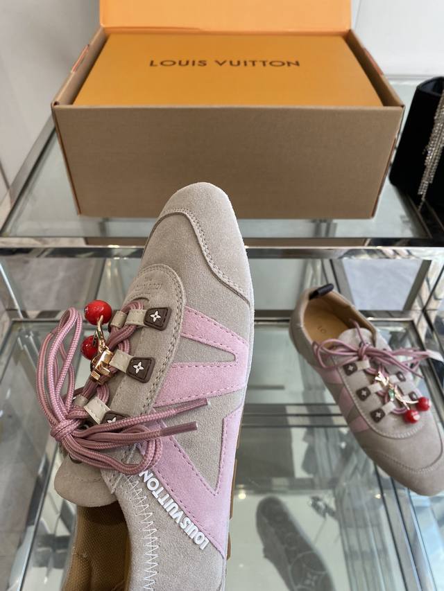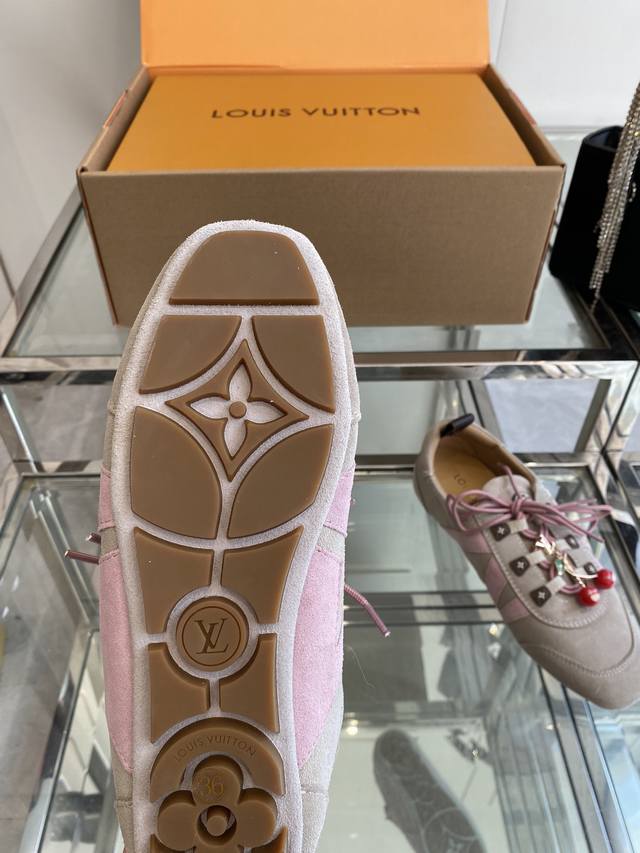 Sneakerina Ballet Style Sneakers. These sneakers feature smooth lines crafted from silky suede cowhide leather, combining the lightness of ballet shoes with the comfort of athletic shoes. Side Lv logo, Monogram canvas, rich details on the heel tab, Sacchetto craftsmanship, and upgraded TPU outsole for a softer wearing experience. Three accessories for easy matching