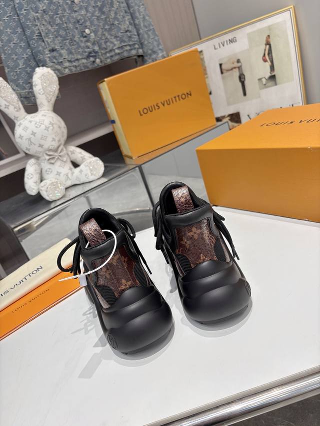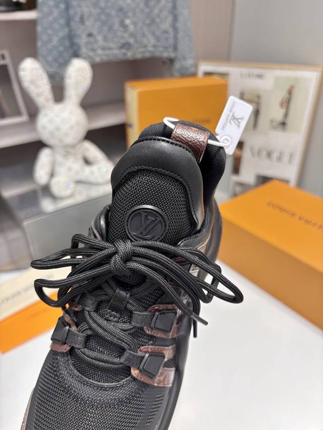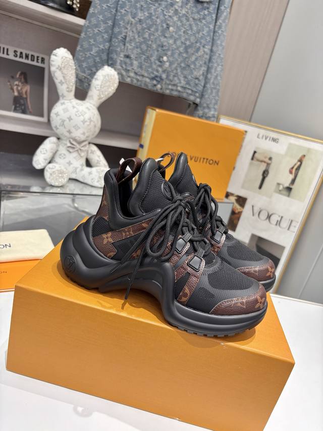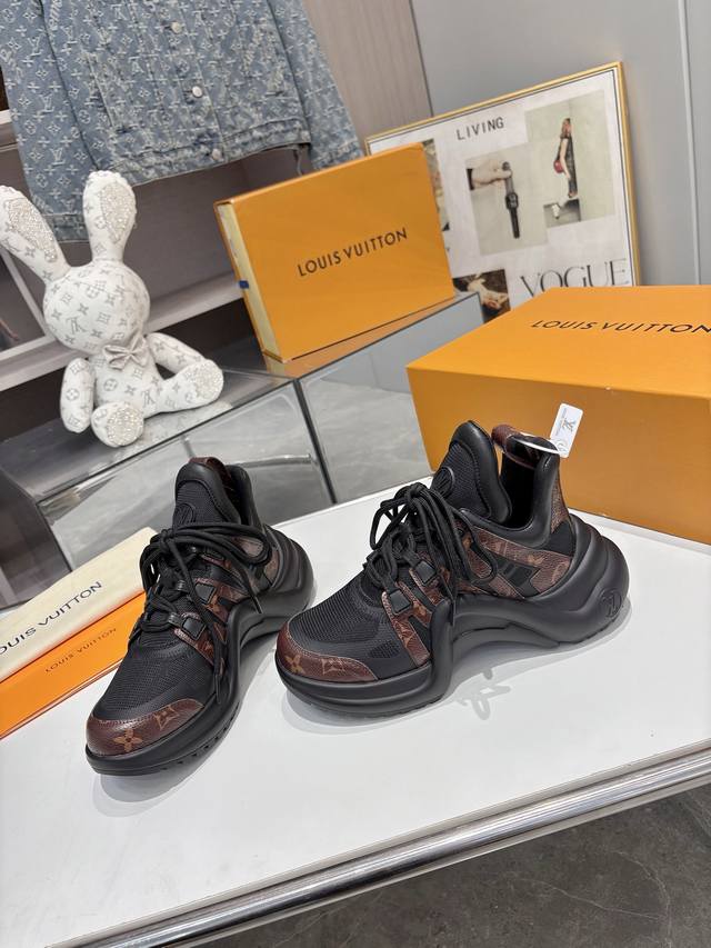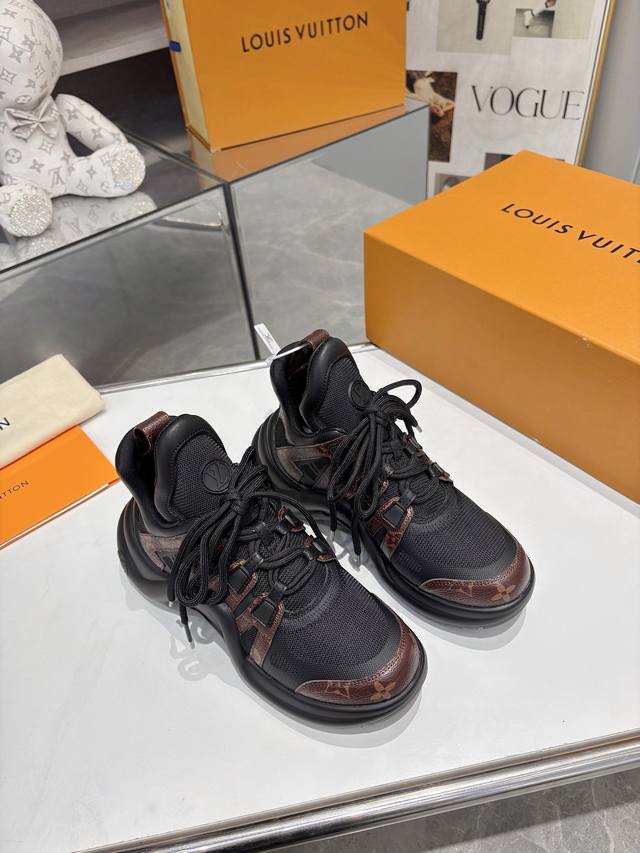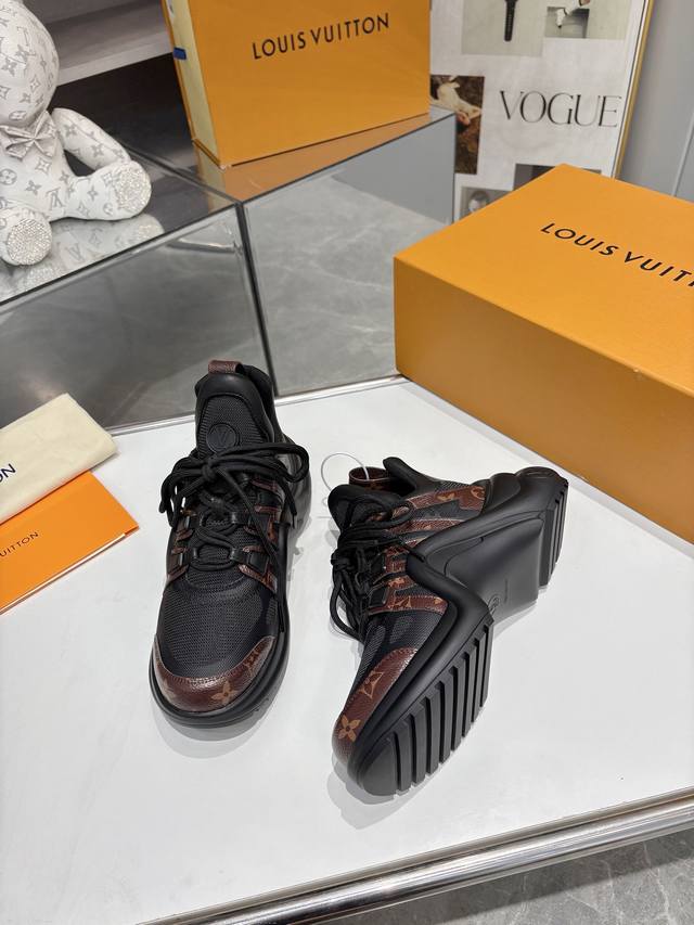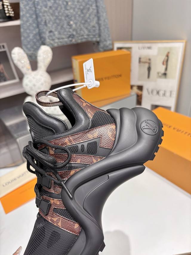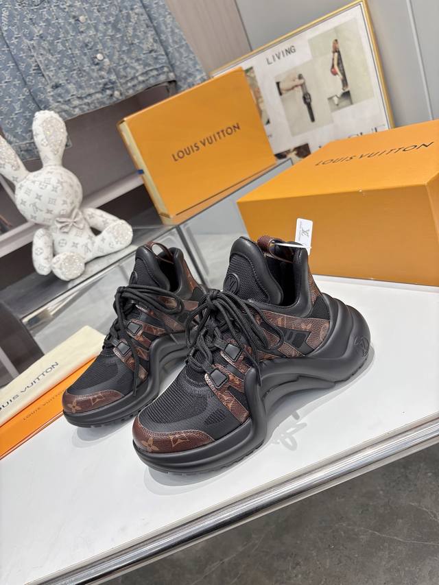 Upgraded DDD Autumn/Winter New Classic LV Archlight Sneakers are inspired by the gradient colors of Louis Vuitton's autumn accessories, leather goods, and ready-to-wear collections. The calfskin upper and futuristic wave-shaped outsole are accented with LV lettering and Monogram floral details on the sides. The LV Circle logo is embossed on the tongue. Comfortable and stylish, these sneakers are a fashion statement, hailed as the coolest casual sneakers ever. The heel is 5.5cm high. The outsole uses a combination of vacuum-molded PU and a rubber soleplate. Original materials, sizes 35-42. Sizes 35 and 42 are custom-made and non-refundable.