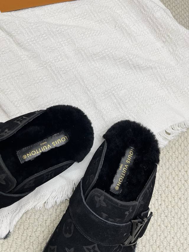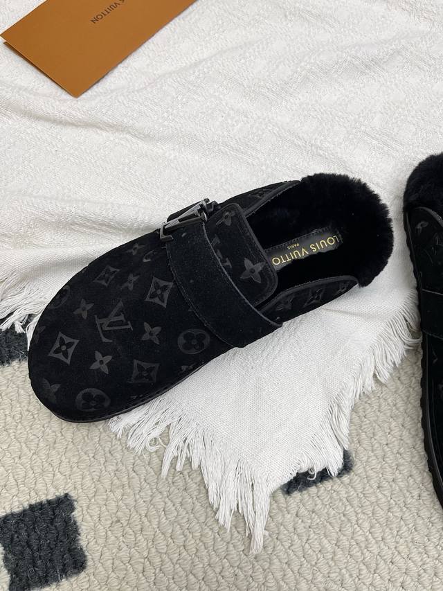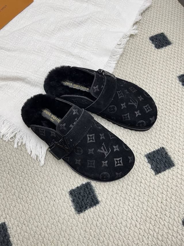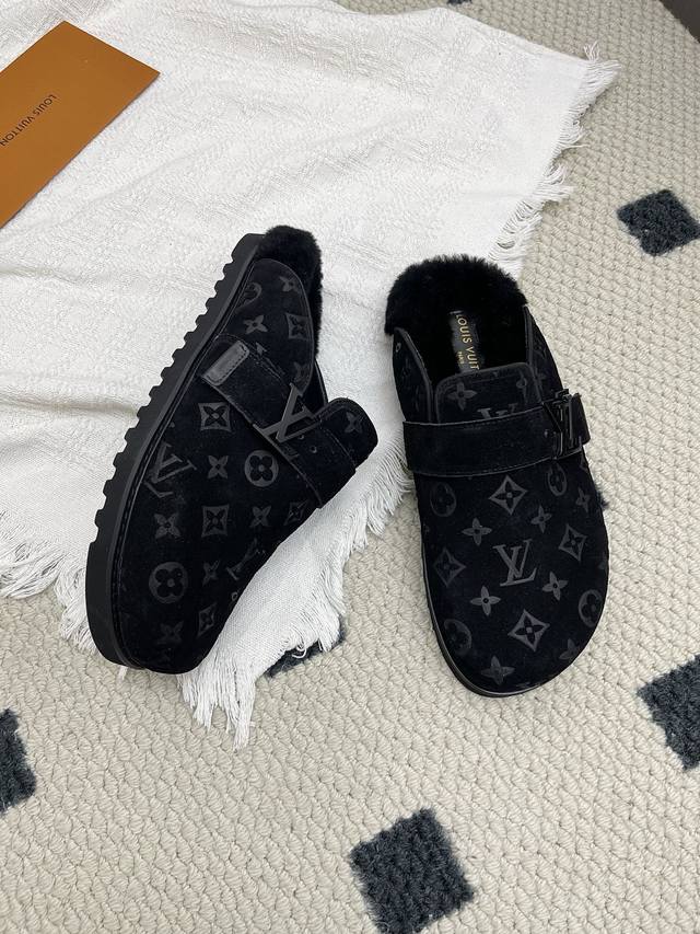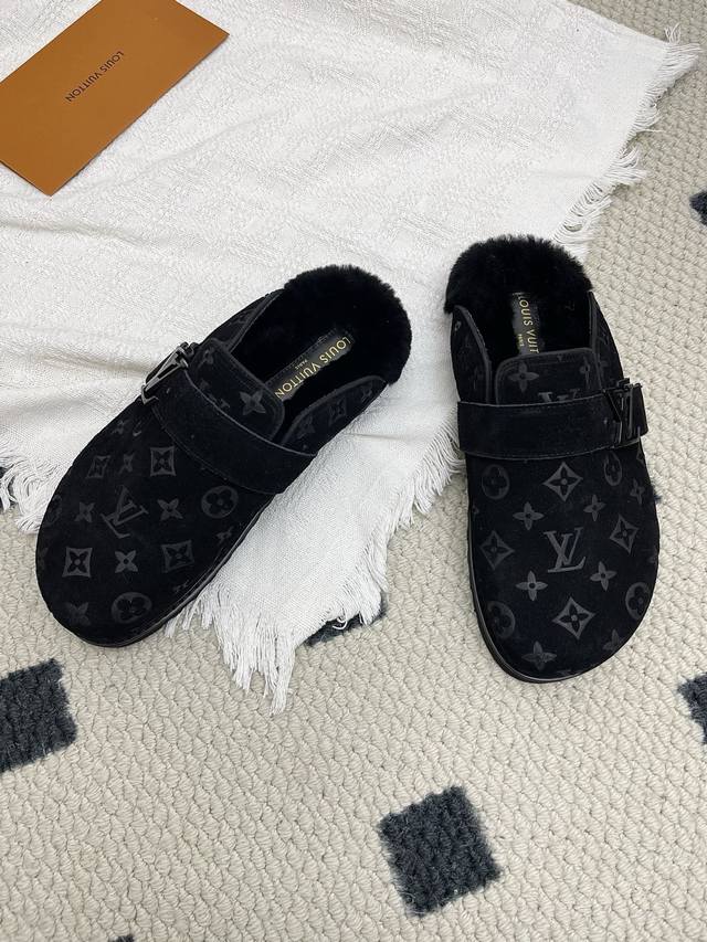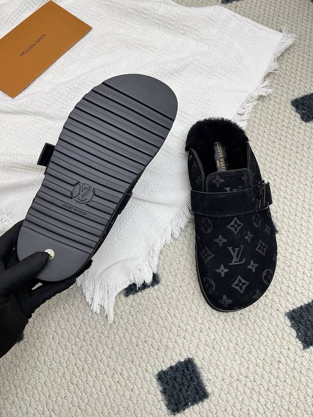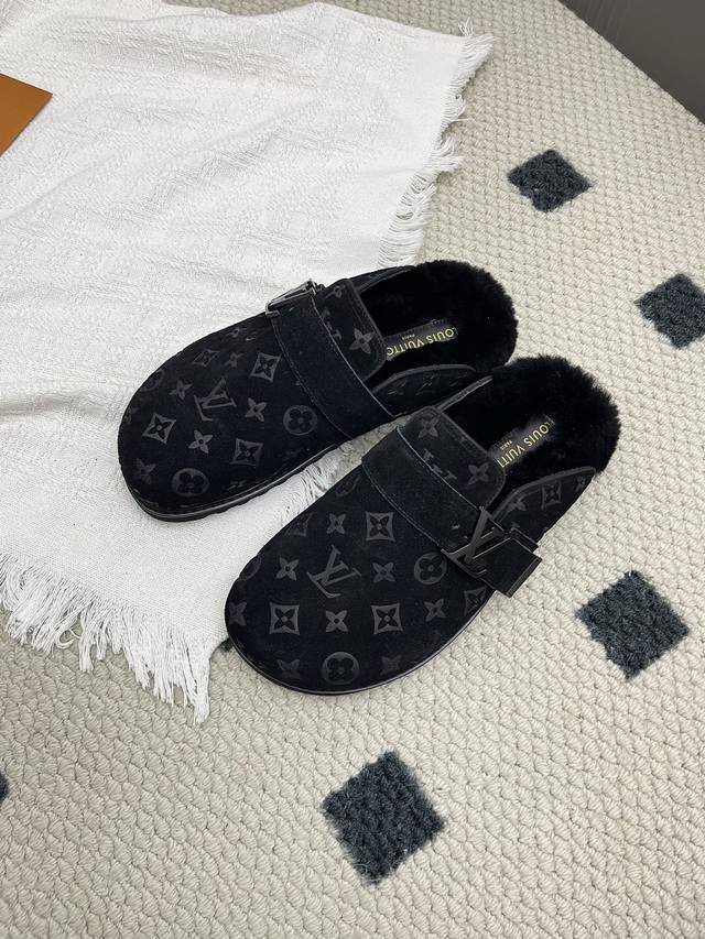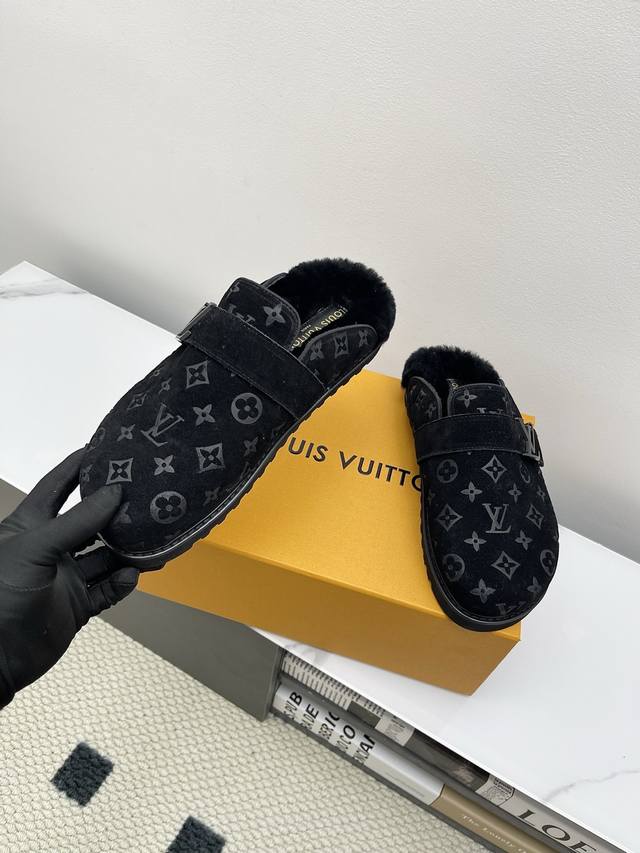 Women's and Men's Lv Louis Vuitton L's latest Easy series Birkenstock thick-soled wool slippers.