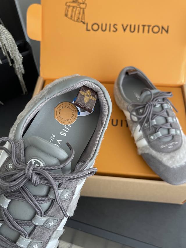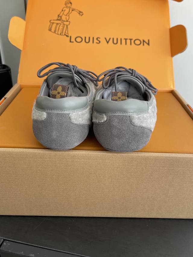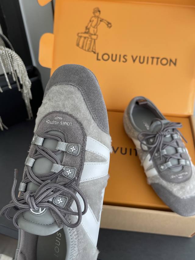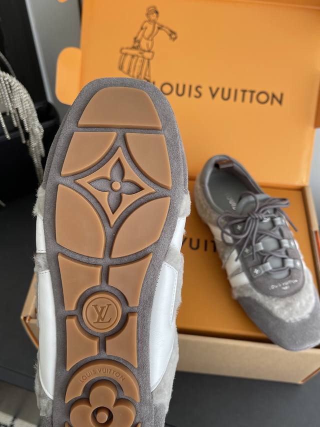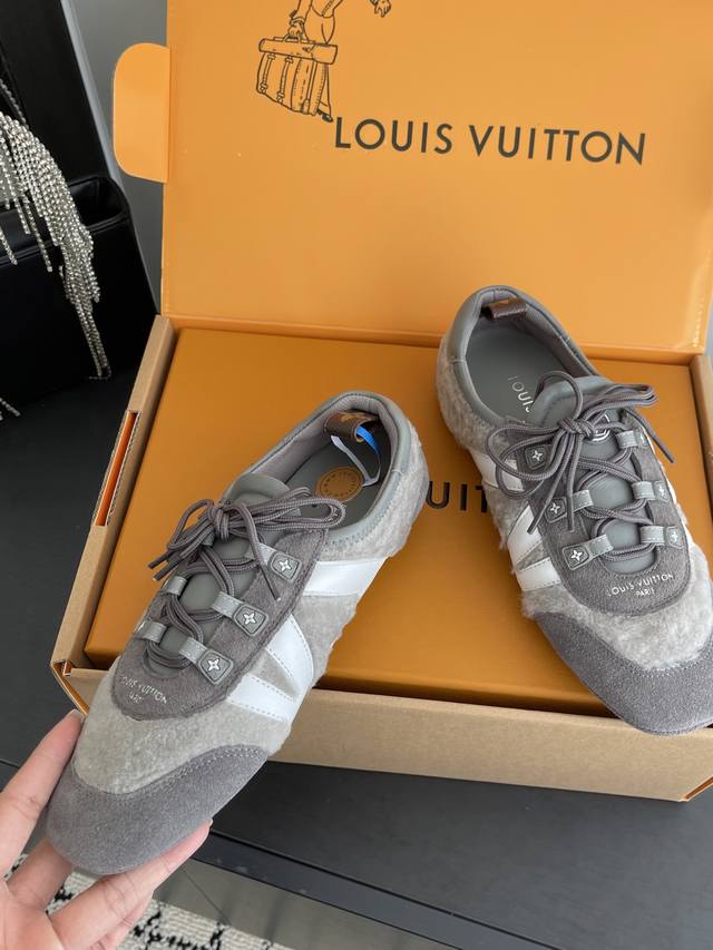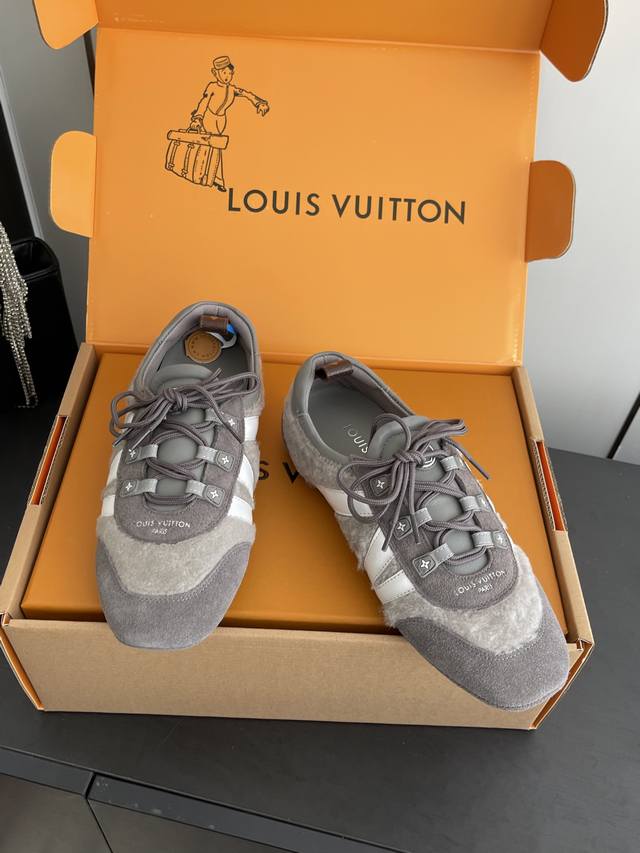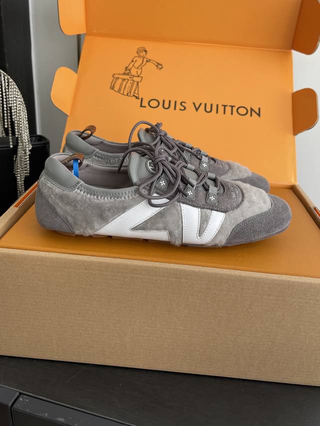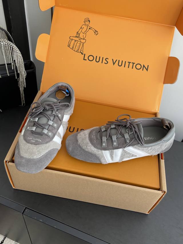 Women's & Men's 480 Louis Vuitton Spring/Summer Sneakerina Series Ballet Sneakers, German Training Shoes, Couple Style. The Sneakerina ballet-inspired sneakers feature smooth lines crafted from silky suede cowhide leather, combining the lightness of ballet shoes with the comfort of athletic footwear. The side features the Lv logo, Monogram canvas, and a richly detailed heel strap. The Sacchetto process and TPU outsole enhance the soft wearing experience. Three accessories allow for easy matching. Original custom-made imported top-grain cowhide leather fabric, original custom-made breathable mesh lining, original molded outsole injection molding TPU material. Sizes: 35-45 (Women's 40, Men's 45). Custom-made.