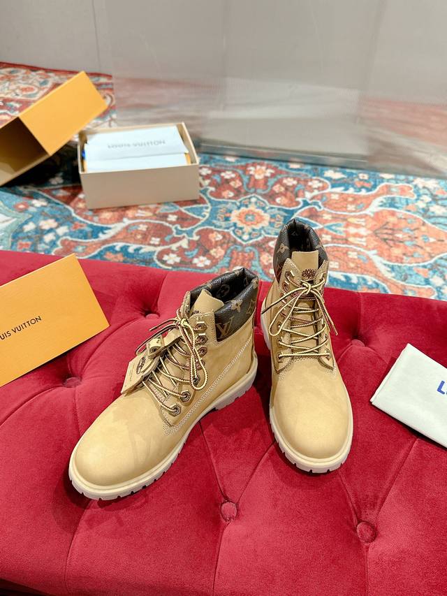 Women's P Men's P Ddd LV X Timberland Collaboration Monogram Yellow Boots Ankle Boots Top Version Ddd LV X Timberland Ankle Boots are made of Monogram embossed waterproof suede cowhide leather. Relying on the brand's exquisite craftsmanship, they are meticulously recreated in Italy to reshape the classic Timberland 6-inch boot shape. They made a striking appearance at the pharrell Williams Fall/Winter Menswear Show with an American workwear style. Features include a Monogram embossed tongue, original Timberland laces, and an outsole with meticulous details. A leather tag displays the collaboration logo. Ddd Material: Original custom imported top-grain cowhide Ddd Lining: Original custom leather lining and mesh lining Ddd Outsole: Original molded non-slip rubber material Ddd Size: Women's 35-40, Men's 39-44, Women's 40.41, Men's 45. Customized, no returns or exchanges DDD