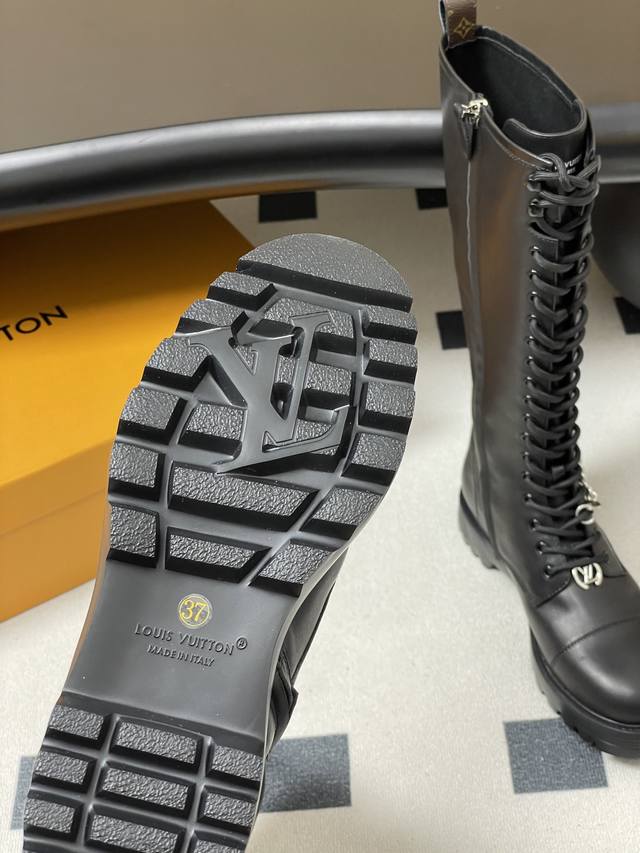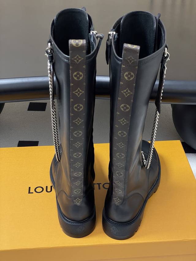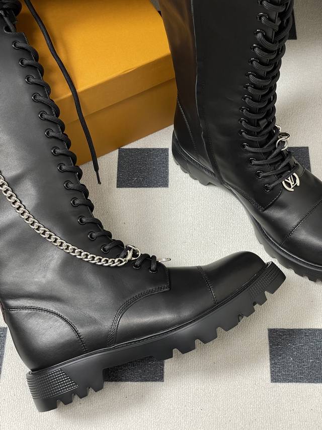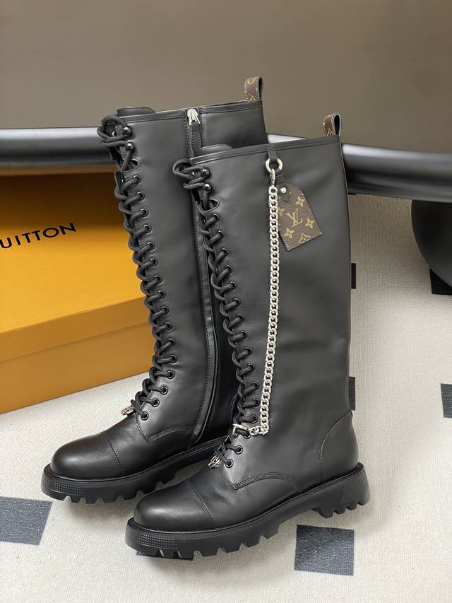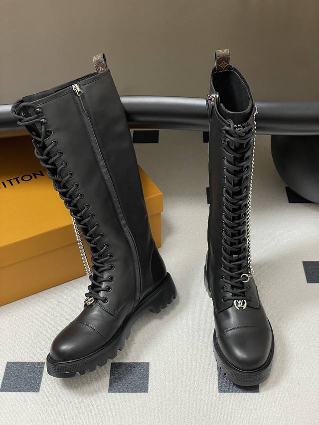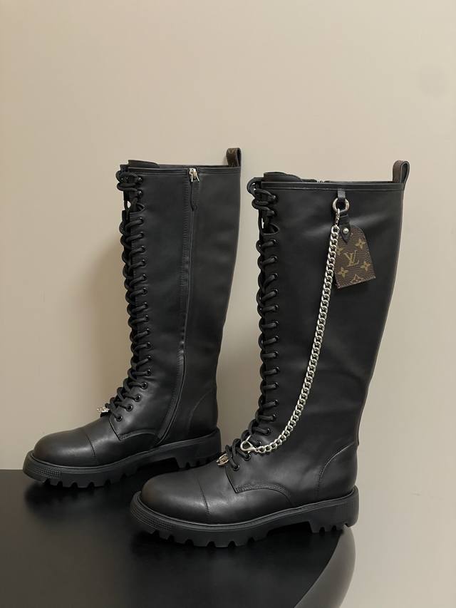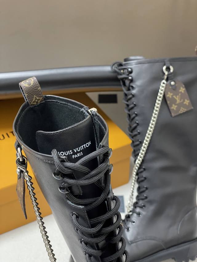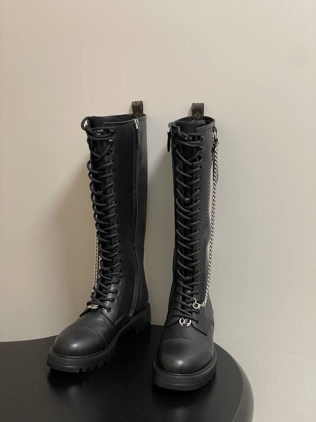 25Fw Autumn/Winter New Louis Vuitton Lv District Ranger Long Boots with Chain Monogram Canvas Pendant Riding Boots Lace-up Platform Side Zipper Long Boots