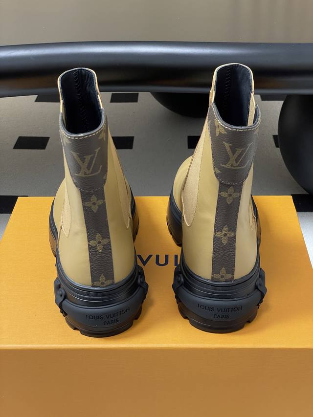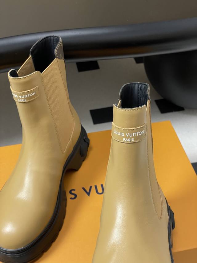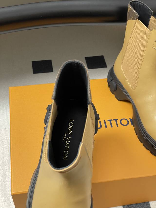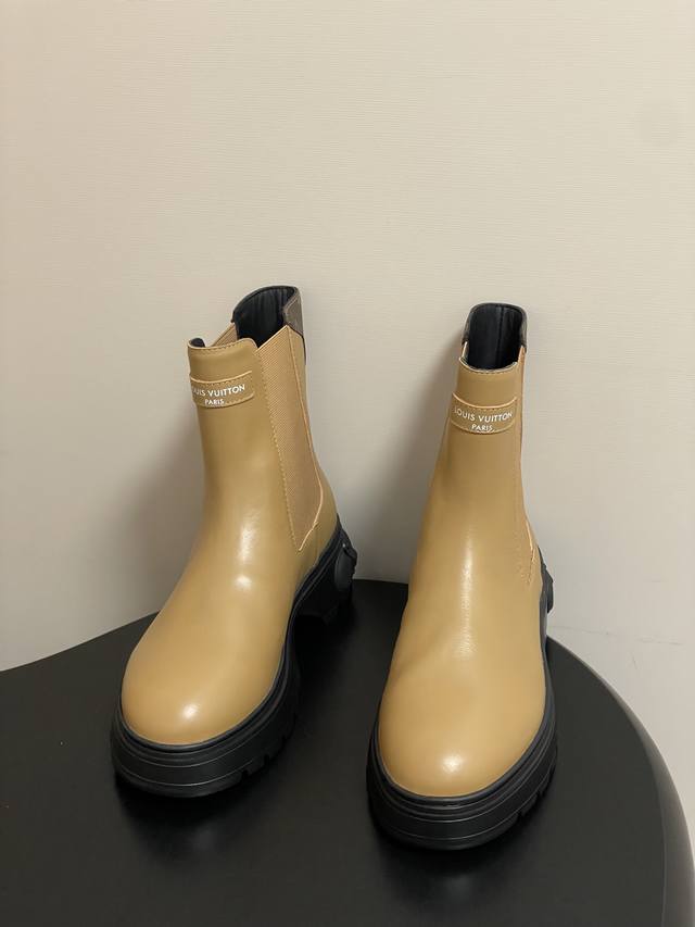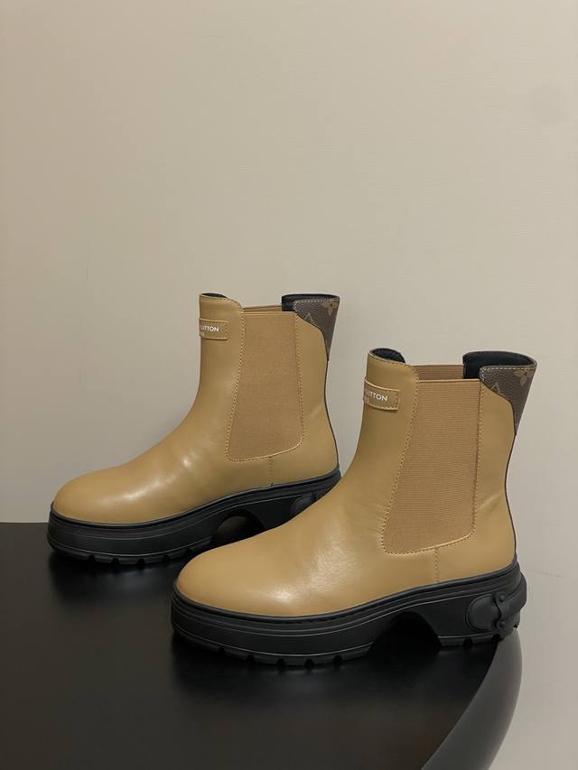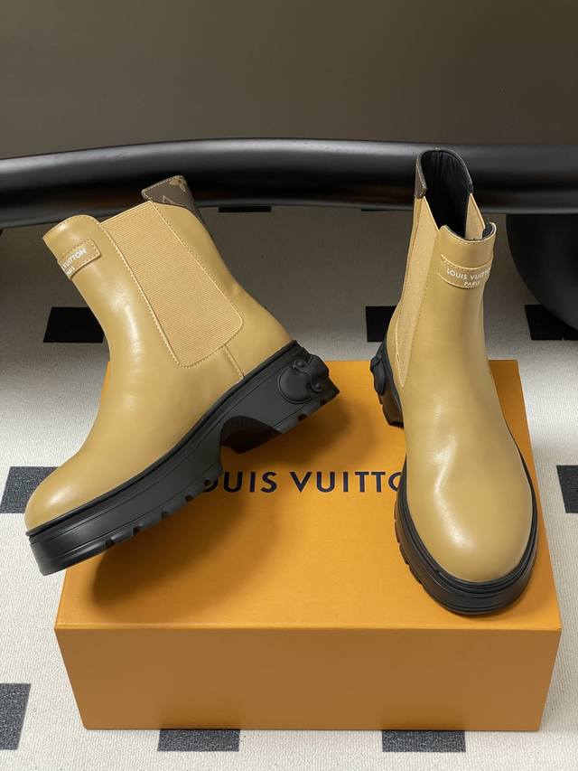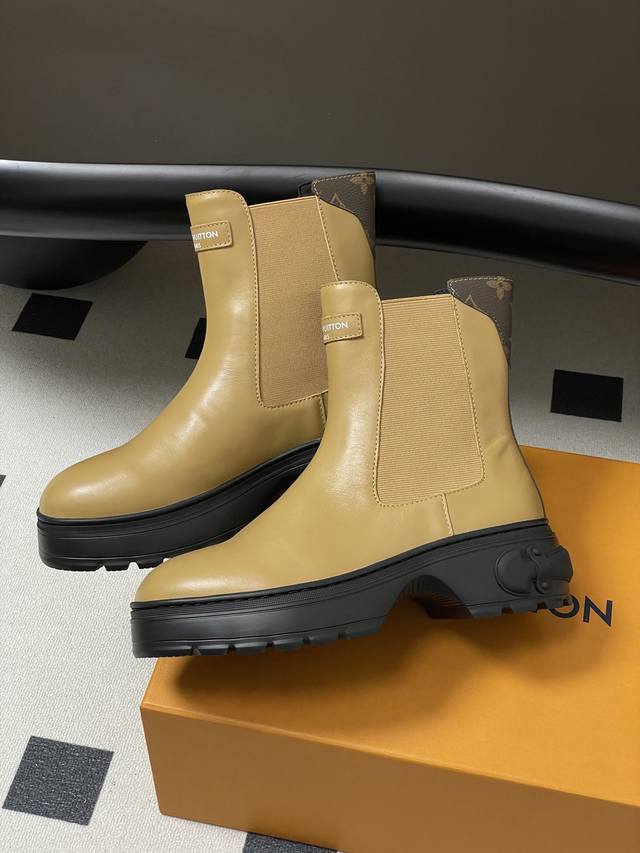 25Ss Autumn/Winter New Louis Vuitton Lv Squad Chelsea Boots, Thick Sole, Elastic Band Ankle Boots. This Lv Squad Chelsea boot features smooth cowhide leather, presenting a trendy look that balances strength and softness. The upper and outsole are adorned with Monogram canvas and Louis Vuitton trunk handle elements, respectively. The silhouette can be tightened with leather-covered buckles. Upper: Cowhide Leather; Lining/Insole: Cowhide Leather; Sole: Original Mold TPU Rubber Outsole; Heel Height: 5cm; Sizes: 35-39; 40.41 Custom-made, no returns or exchanges.