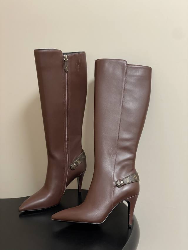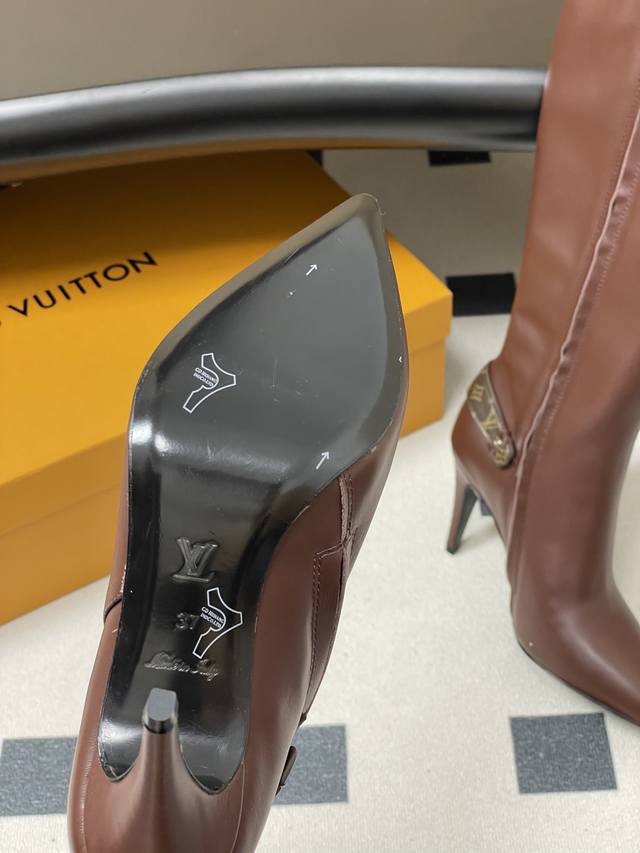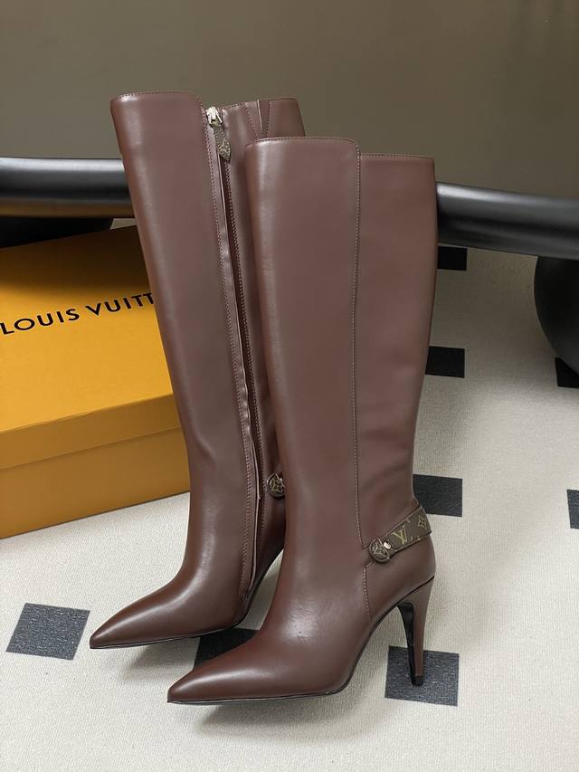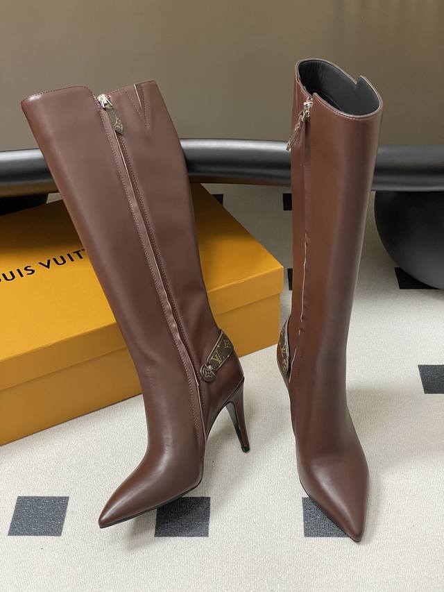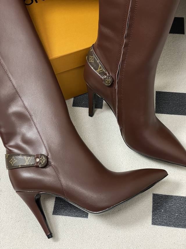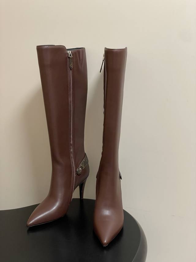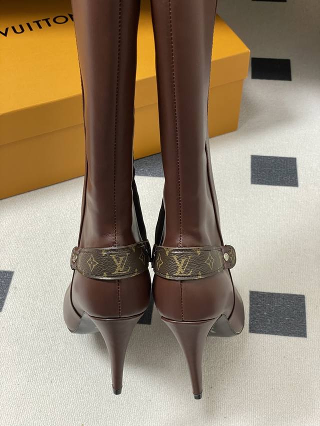 25Ss Early Autumn New Louis Vuitton Lv Legacy Pointed Toe High-Heeled Boots with Side Zipper and Monogram Canvas Strap. This Legacy ankle boot is crafted from smooth calfskin leather, paired with a Monogram canvas strap reminiscent of the handles of the brand's traditional trunks, paying homage to Louis Vuitton's travel heritage. Engraved metal studs accentuate the pointed toe and high heel silhouette. Upper: Calfskin Monogram Canvas Leather; Lining/Insole: Sheepskin; Sole: Italian Leather Outsole; Heel Height: 9.5cm; Sizes: 35-39, 40, 41, 42 (Made to order, no returns or exchanges).