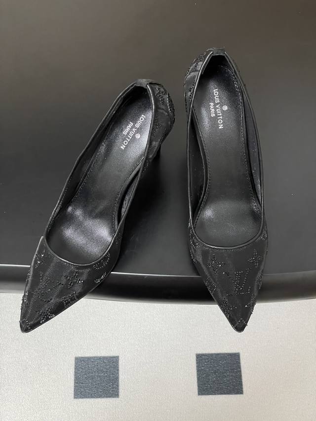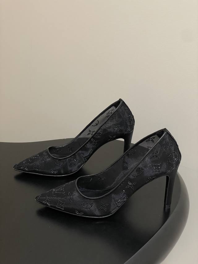 25Ss New summer Louis Vuitton LV Gala high heels with mesh and rhinestone finish, flats with mesh and rhinestones. Bing...Bling...Mesh crystal rhinestones. These Gala pumps feature a mesh upper embroidered with a sparkling rhinestone Monogram pattern, making them an elegant choice for evening outings. The sleek lines of the upper complement the slender heel. The delicate leather outsole is embellished with metal Lv lettering. The breathable mesh upper provides excellent ventilation and comfort, while also highlighting the rhinestone embellishments. The sheepskin lining provides a comfortable fit and enhances comfort. The pointed toe design elongates the foot, creating a more slender and elegant look, while the flat sole ensures comfort and ease of movement. They are suitable for long-lasting everyday wear or pairing with both formal and casual outfits.