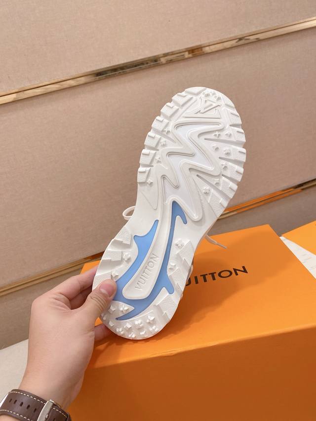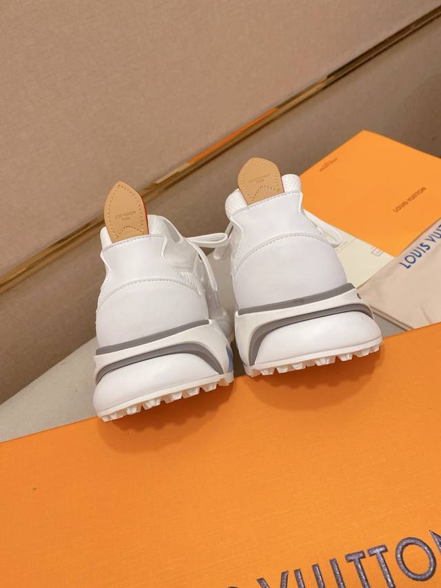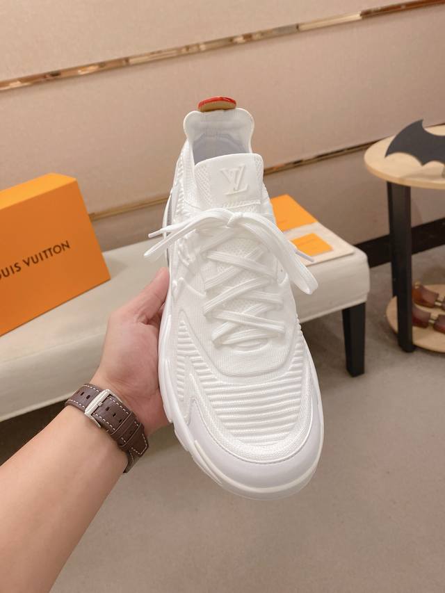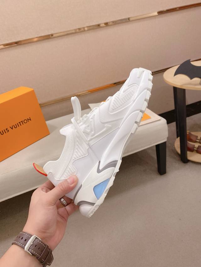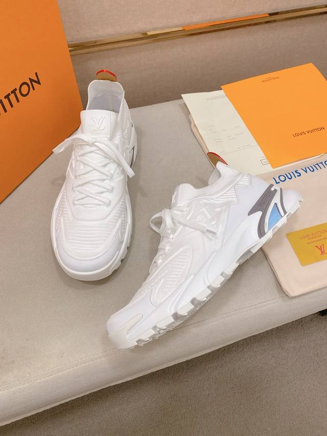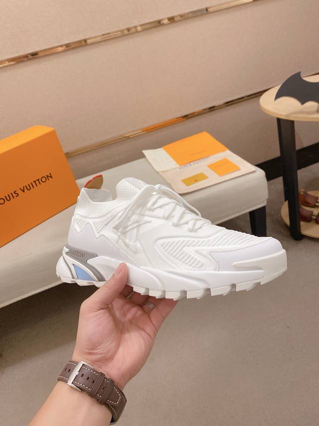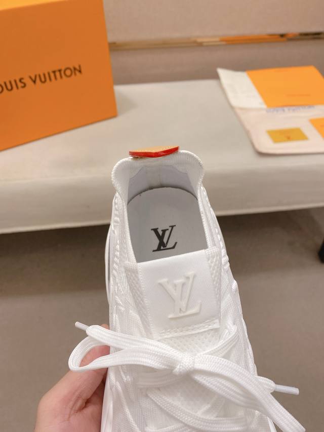 Factory direct high-end version Louis Vuitton Runner Tatic sneakers feature an easy-on design crafted from a single piece of technical knit fabric, accented with cowhide leather trim. The Louis Vuitton logo on the side adds a dynamic touch, while the leather heel tab resembles the handle of a Louis Vuitton leather goods collection. Features include mixed materials, laces, Louis Vuitton elements, and a rubber outsole adorned with the Vuitton logo. Sizes 39-44, custom sizes 38, 45, and 46 are available.