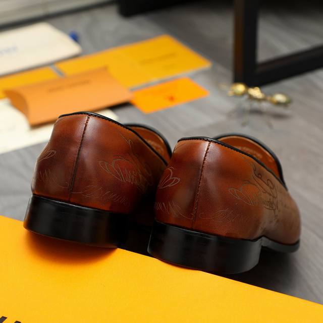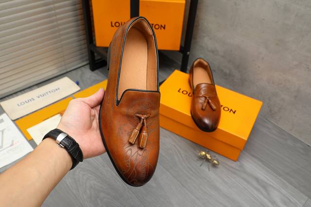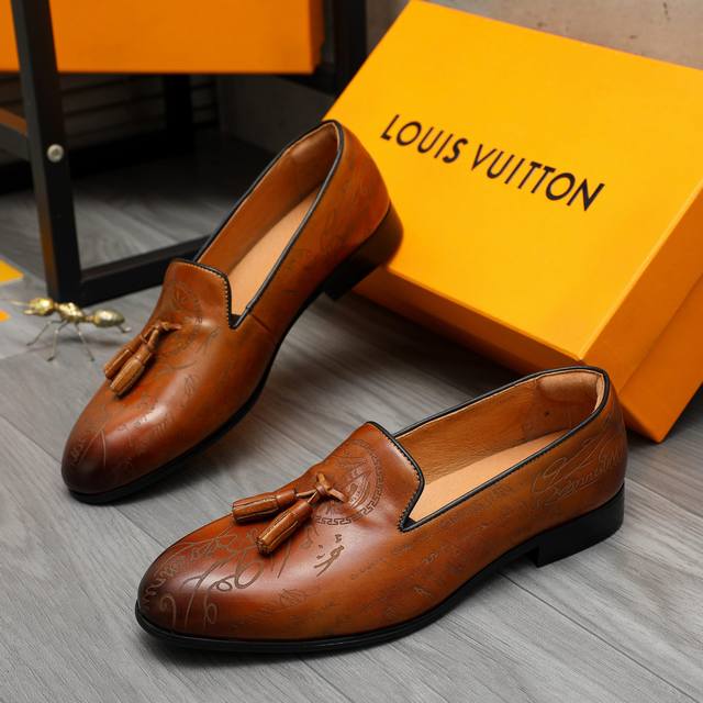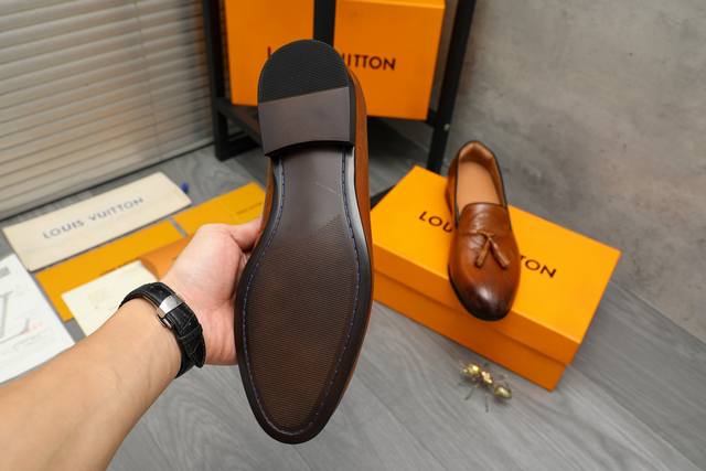 Factory direct price men's shoes and sportswear original product. Trademark: Louis Vuitton business slip-on leather shoes. Sizes: 37-46. Material: Selected distressed cowhide upper, pigskin lining, rubber outsole.