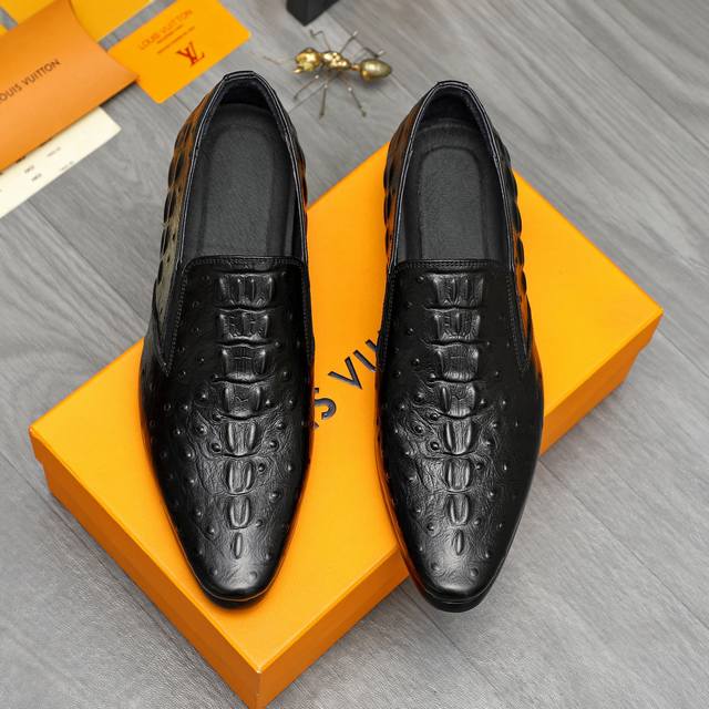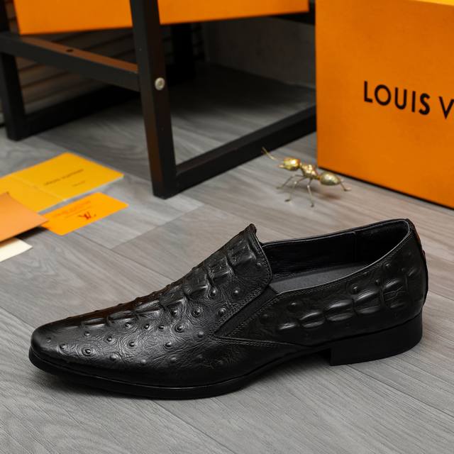 Factory direct price men's shoes and sportswear original product. Trademark: Louis Vuitton business slip-on leather shoes. Sizes: 37-46. Material: Selected crocodile-patterned cowhide upper, pigskin lining, rubber outsole.