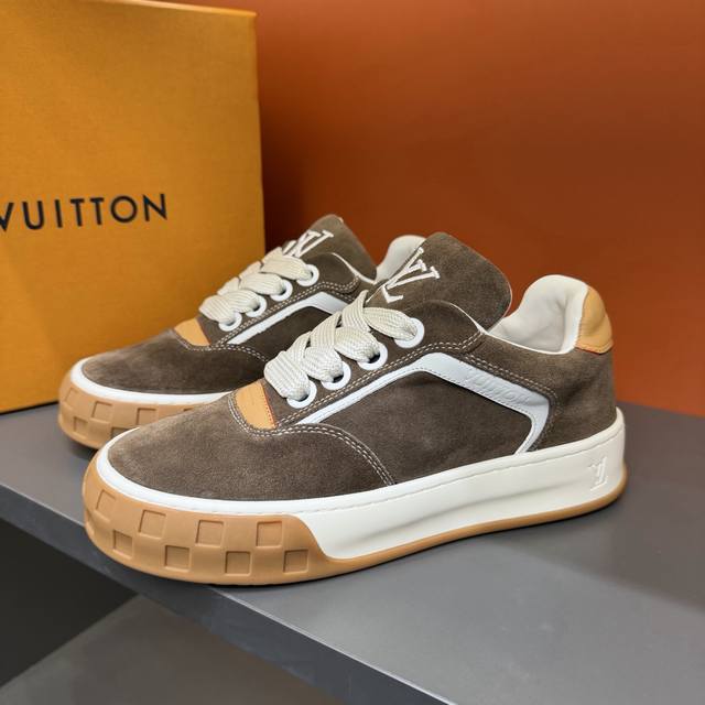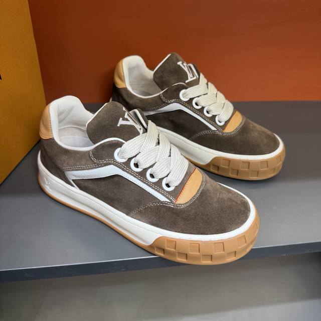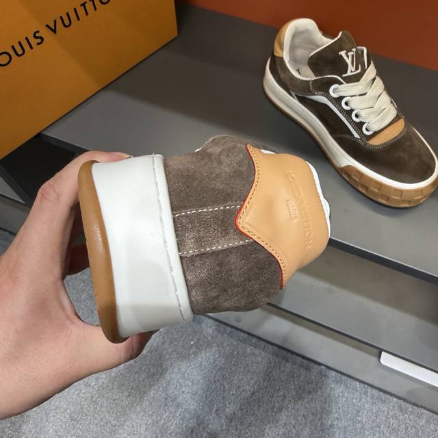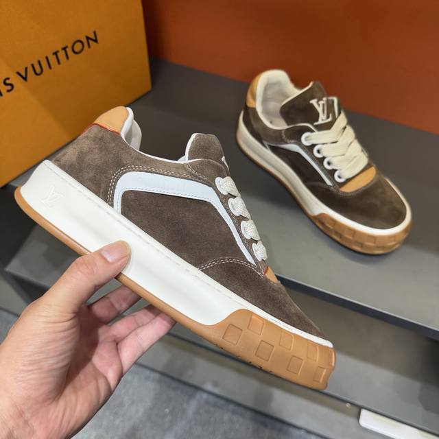 Factory direct price men's sports shoes, original design, sizes 38-45, top-tier version, Louis Vuitton classic runway new style, DDD (outer rubber) craftsmanship, 1:1 original development! Extremely comfortable to wear, luxurious materials, exquisite workmanship, midsole printed with "Made in Europe" (DDD), upper made of imported Italian calfskin, side adorned with the brand logo and signature, latest latex insole, mesh lining, super comfortable feel. Original factory exclusive, original two-tone TPU outsole. Outsole construction: Goodyear welt stitching and overlock edging; Exclusive custom-made top-grain cowhide leather; Accessories: Exclusive private mold Vuitton logo; Lining: Custom-made silky mesh lining - top-grain silk cowhide lining; Outsole: TPU composite outsole, wear-resistant, slip-resistant, and anti-yellowing; Insole: New latex insole - mesh sweat-absorbing; Craftsmanship: Fully computerized stitching, toe cap, heel counter with heat and cold setting, full lasting, mid-low logo pattern.