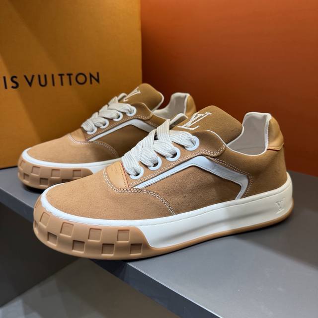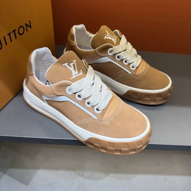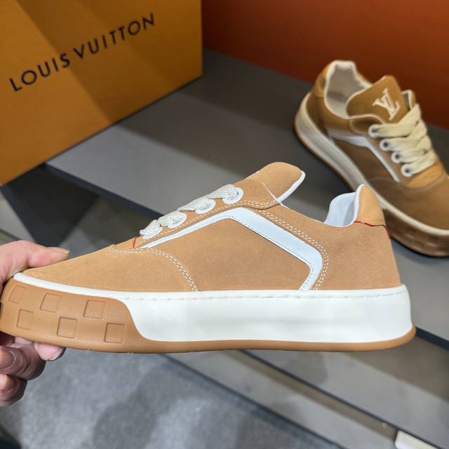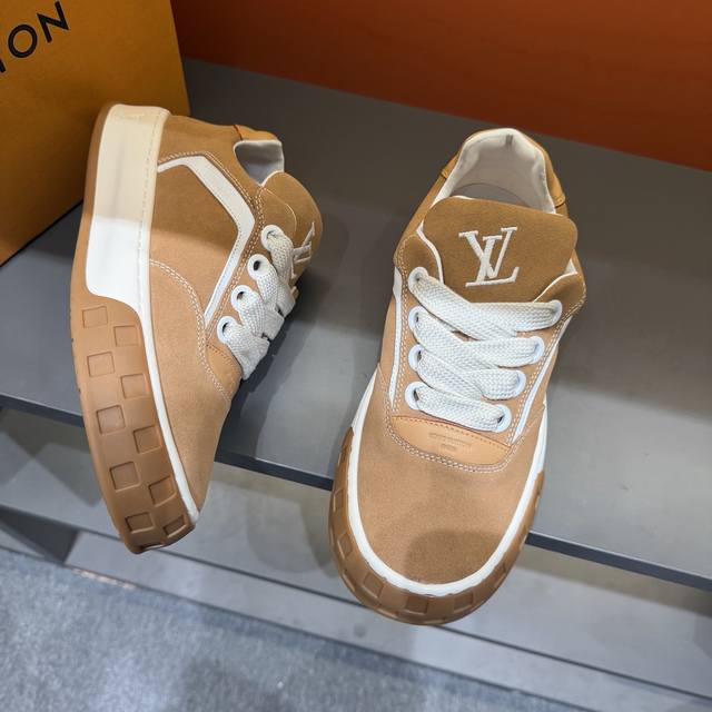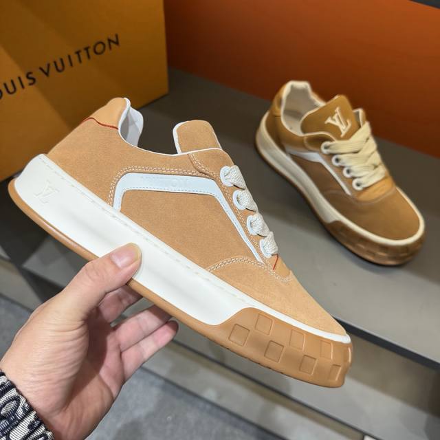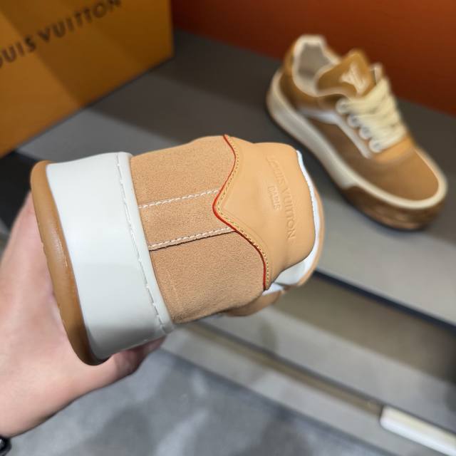 Factory direct price men's sports shoes, original quality, sizes 38-45, top-tier version, Louis Vuitton classic runway new style, DDD (outer rubber) craftsmanship, 1:1 original development! Extremely comfortable to wear, luxurious materials, exquisite workmanship, midsole printed with "Made in Europe" (DDD), upper made of imported Italian calfskin, side adorned with the brand logo and signature, latest latex insole, mesh lining, super comfortable feel. Original factory exclusive, original two-tone TPU outsole. Outsole construction: Goodyear welt stitching and overlock edging; Exclusive custom-made top-grain cowhide leather; Accessories: Exclusive private mold Vuitton logo; Lining: Custom-made silky mesh lining - top-grain silk cowhide lining; Outsole: TPU composite outsole, wear-resistant, slip-resistant, and anti-yellowing; Insole: New latex insole - mesh sweat-absorbing; Craftsmanship: Fully computerized stitching, toe cap, heel counter with heat and cold setting, full lasting, mid-low logo pattern.