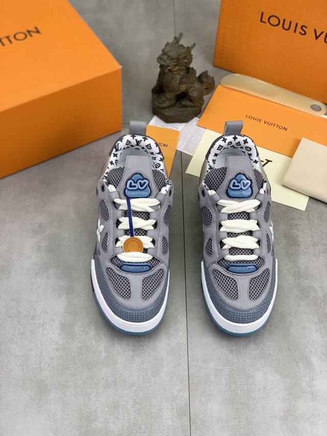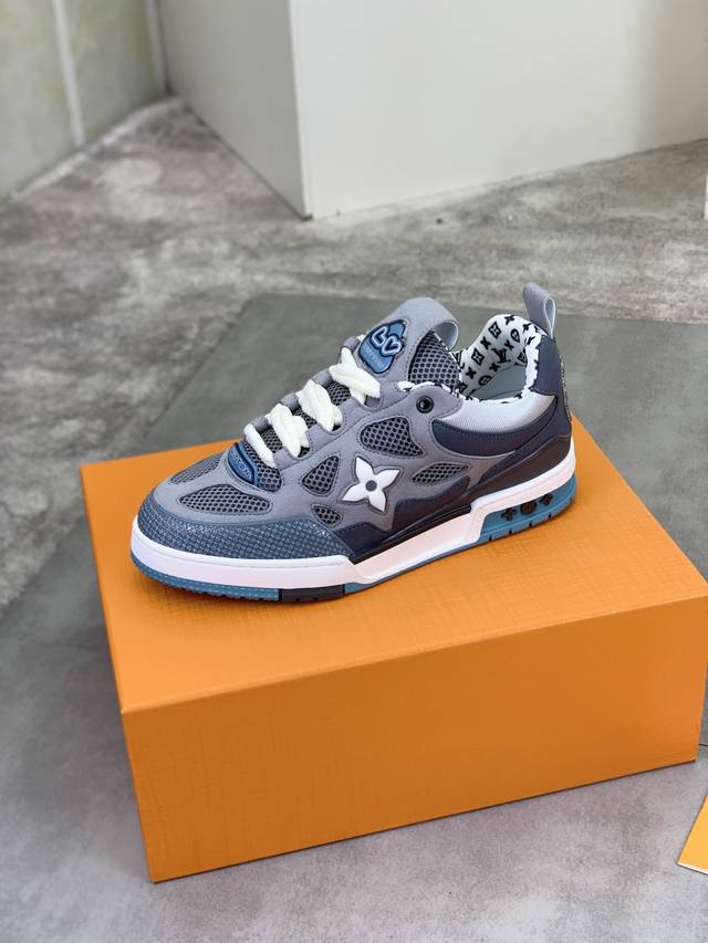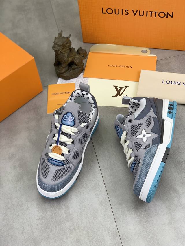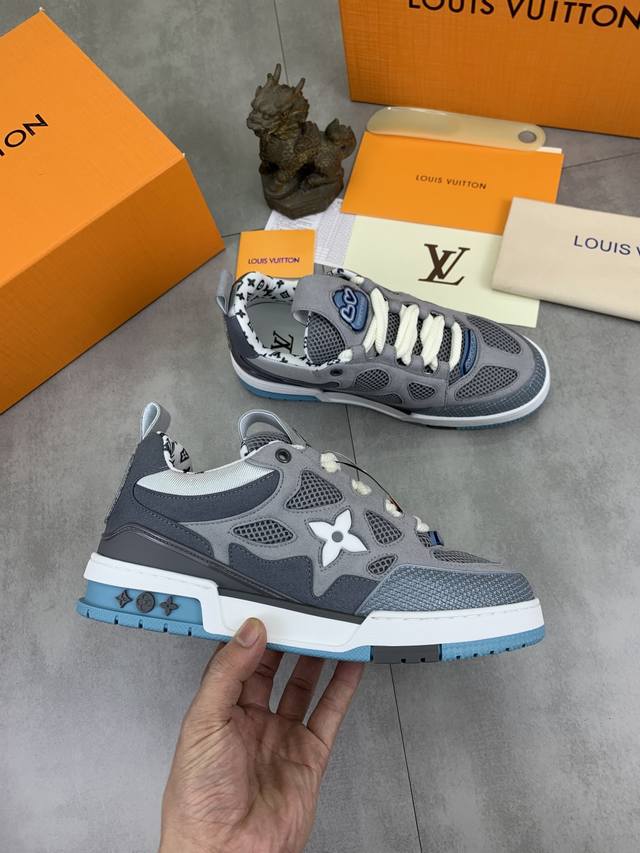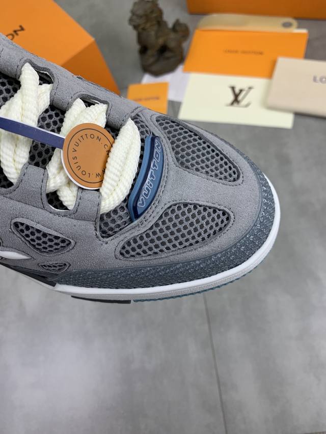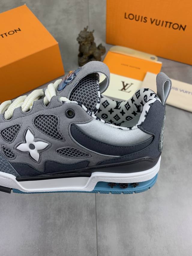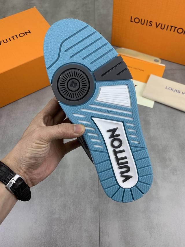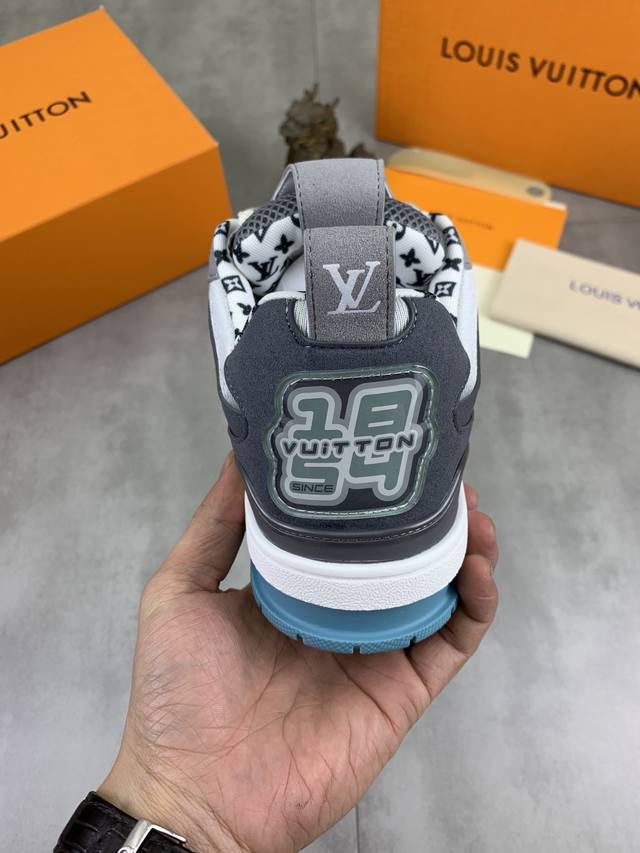 Factory direct price, new LV Trainer sneakers are now available. This LV Trainer sneaker reinterprets Virgil Abloh's classic design with suede and grain cowhide leather, and features a Monogram flower pattern on the tonal rubber outsole. The stylized Monogram flower adorns the side, complementing the asymmetrical Louis and Vuitton logos on the heel. The original design, created by Virgil Abloh, showcases inspiration from retro basketball shoes. The tongue and upper are decorated with the LV logo, the side features a handwritten Louis Vuitton logo, the heel features a #54 logo, and the rubber outsole is adorned with Monogram flowers, continuing the comfort of the innovative gel outsole. Comes with the original drawer box and complete packaging! Available in 3 colors.