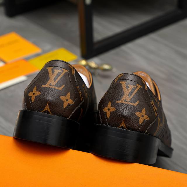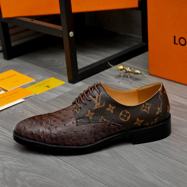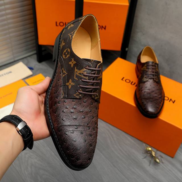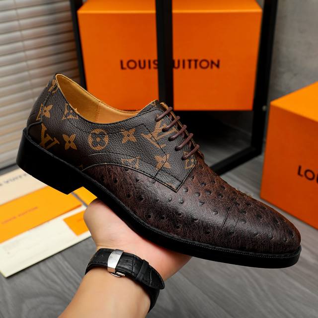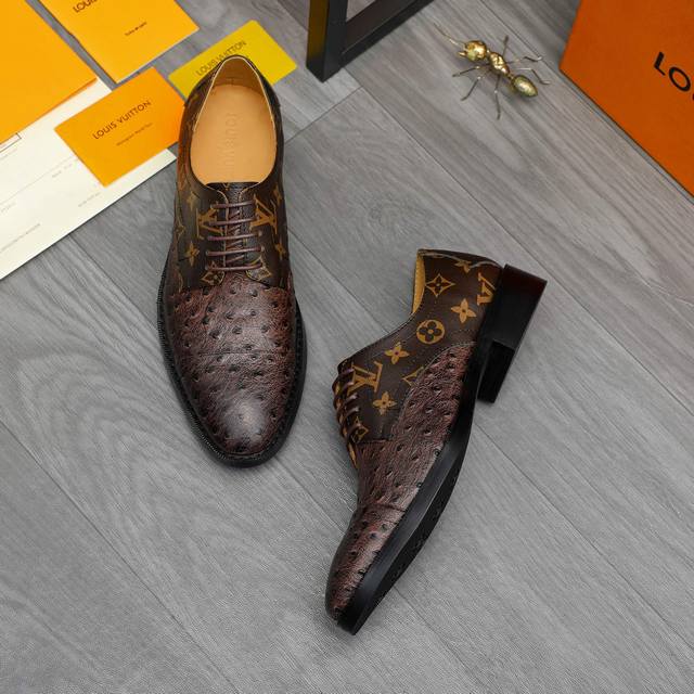 Factory direct price product trademark: LV Louis Vuitton business formal leather shoes. True to size: 39-45. 45 is custom-made and non-refundable. Product materials: Selected ostrich-patterned cowhide upper, cowhide lining, original rubber outsole.