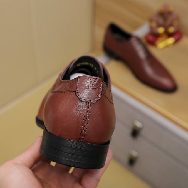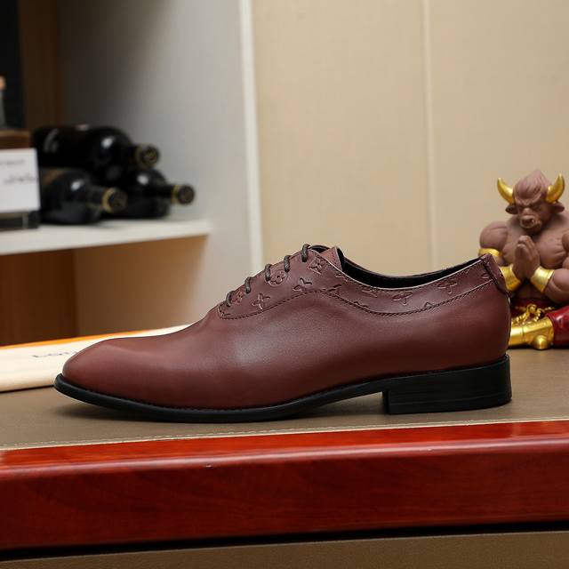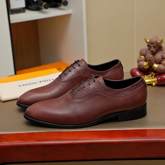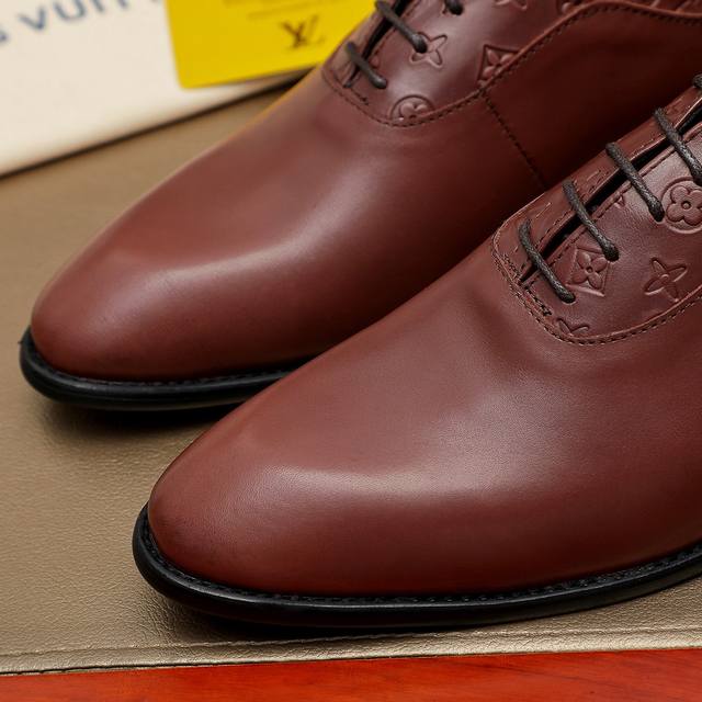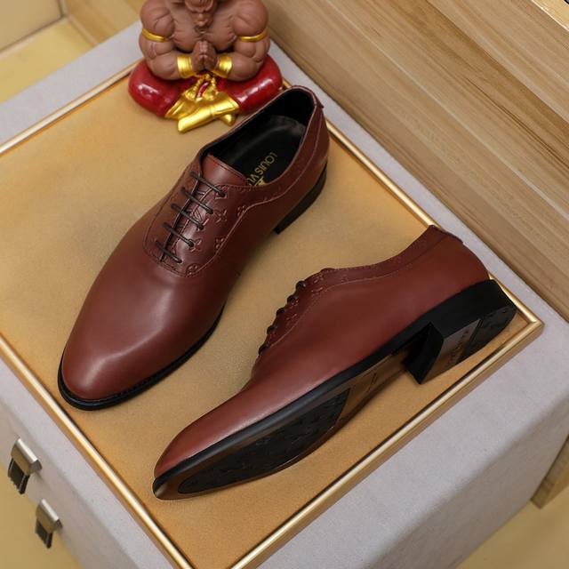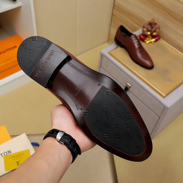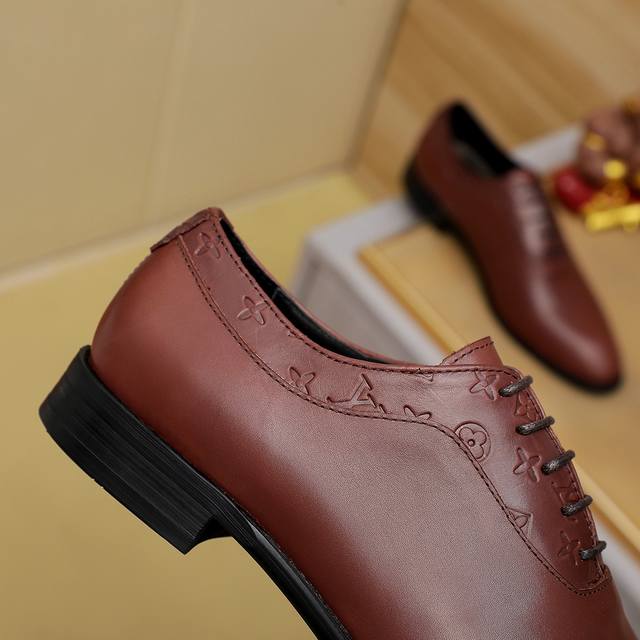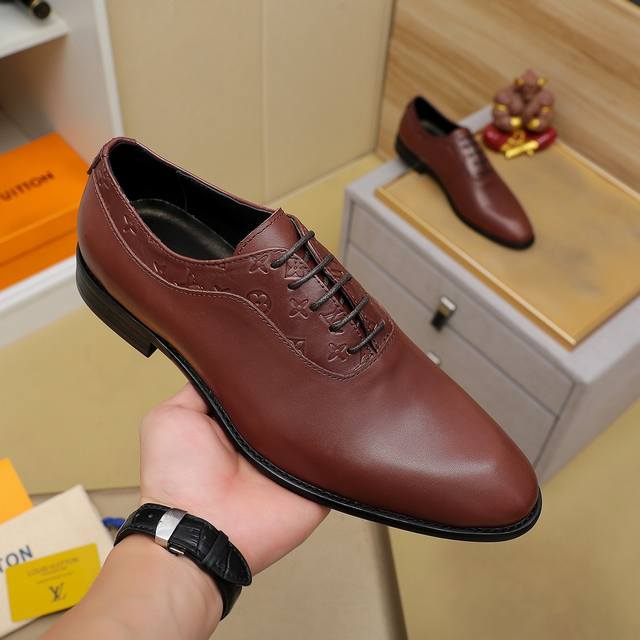Factory direct price product trademark: LV Louis Vuitton business lace-up leather shoes. True to size: 39-44, 38, 45, 46. Custom made. Material: Selected cowhide patchwork embossed cowhide upper, cowhide lining, original rubber outsole.