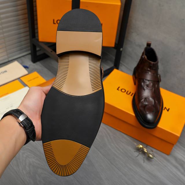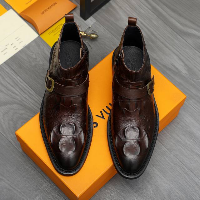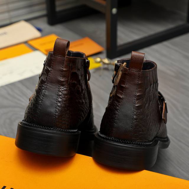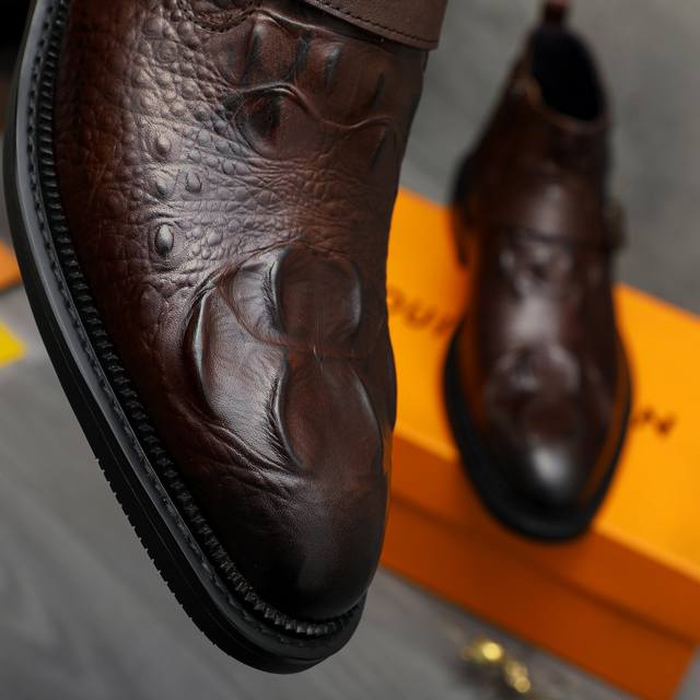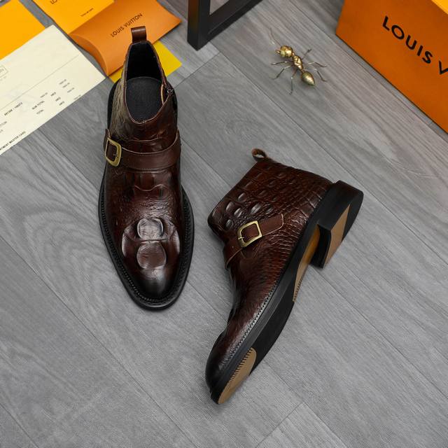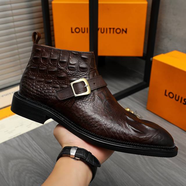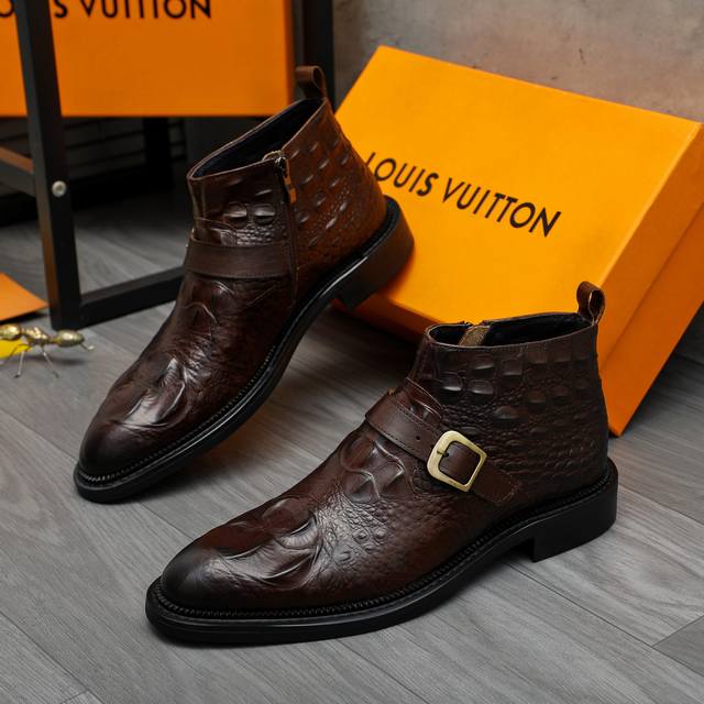 Factory direct price product trademark: LV Louis Vuitton high-top business leather shoes. True to size: 37-46. Sizes 37 and 46 are custom-made and non-refundable. Material: Selected distressed crocodile-patterned cowhide upper, pigskin lining, rubber outsole.