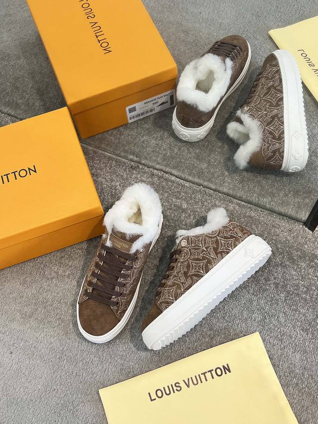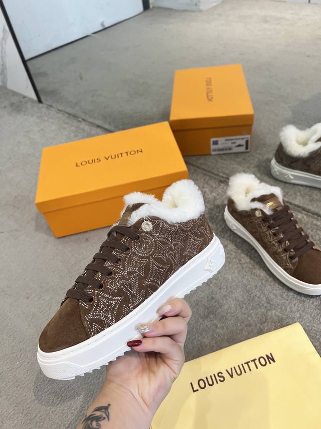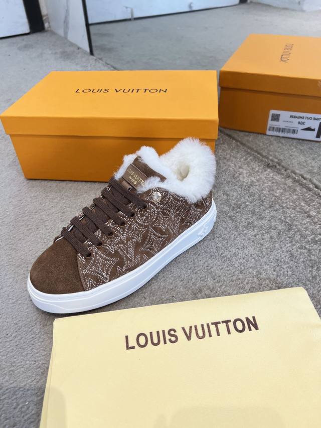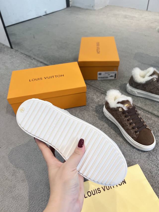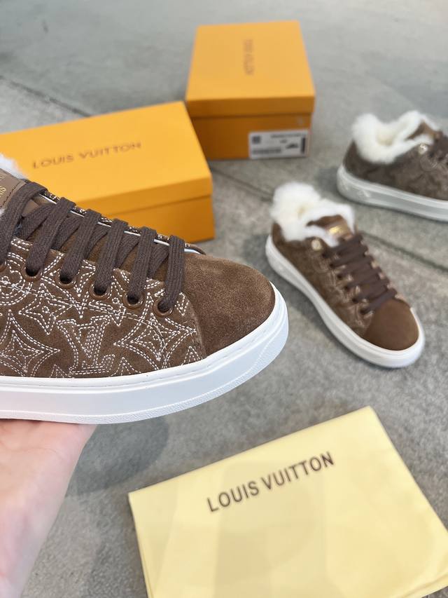 . This is an iteration of the Time Out sneakers, designed for cold weather, made of Monogram embroidered goatskin with a comfortable wool lining. This iconic style features a raised sole decorated with Monogram Flowers. The details are exquisite, including leather trim with the Louis Vuitton logo on the back.
