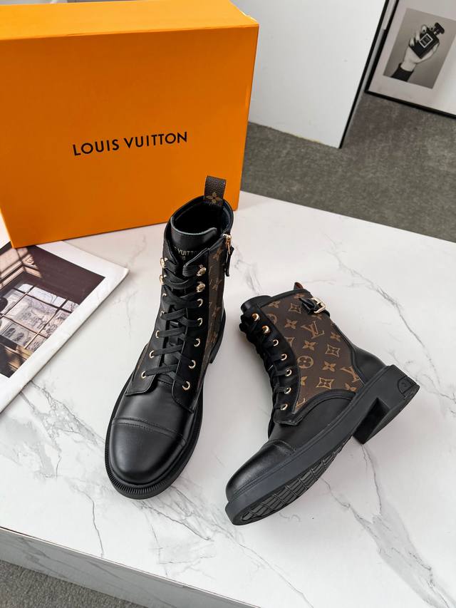 Factory direct price women's shoes and sportswear original Louis Vuitton 2025 Fall/Winter high-end custom design, popular among celebrities and influencers, a century-old classic, exquisite craftsmanship, comfortable to wear. This Citizen flat boot features a military style with smooth cowhide leather and a striking Monogram pattern. The upper has an embossed effect, and the fabric laces and Monogram canvas heel tab complete the details. The side zipper design makes it easy to put on and take off. Material: Full-grain cowhide; Lining: Cowhide; Buckle: Original mold; Outsole: Original mold; Color: Black, Brown; Sizes: 36-40, 41, 42; Custom orders are possible, no returns or exchanges.