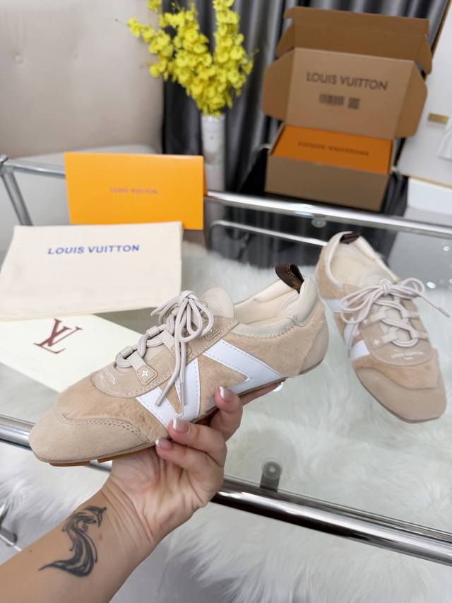 Factory direct women's shoes and athletic shoes, original design. This Louis Vuitton Sneakerina ballet flat features a mixed-material upper and a flexible injection-molded outsole, cleverly blending the comfort of athletic shoes with the light and airy silhouette of ballet flats. The LV logo and Louis Vuitton branding are prominently displayed on one side, while the Monogram canvas heel strap adds a touch of sophistication. Sizes: 35-41, colors continuously updated.