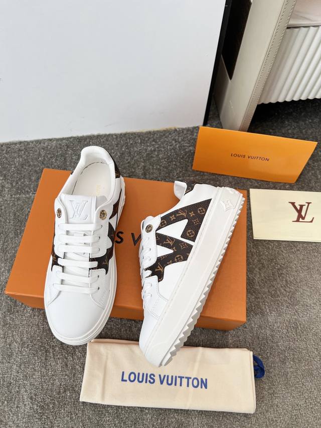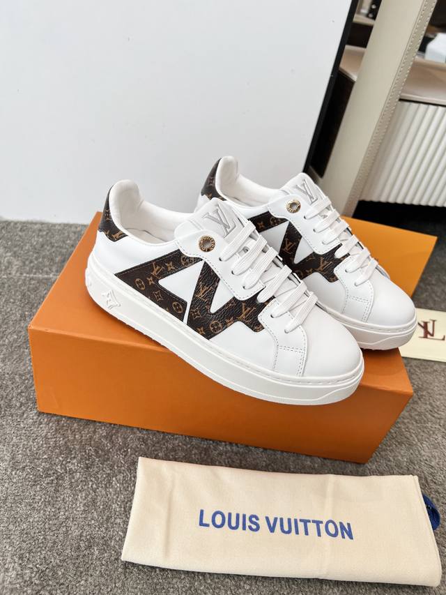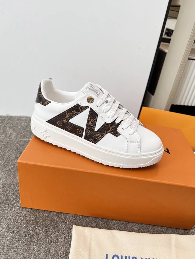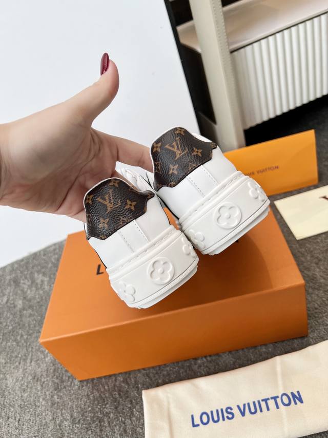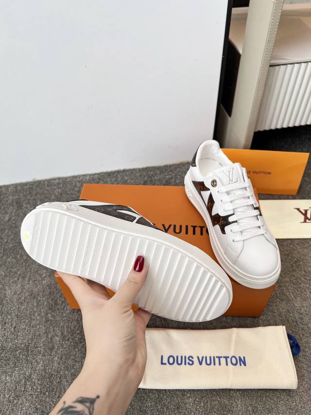 Factory direct women's sports shoes, original quality. This Time Out sneaker features smooth cowhide leather outlined with Monogram canvas trim, and the LV logo on the side exudes a dynamic feel. The Monogram flower pattern is housed in a lightweight Eva thickened outsole, and the LV lettering label on the tongue identifies the brand. Colors: Black, White. Sizes: 35-41. Sizes 34 and 42 can be customized. Includes edge finishing, cowhide lining, and drawer box packaging.