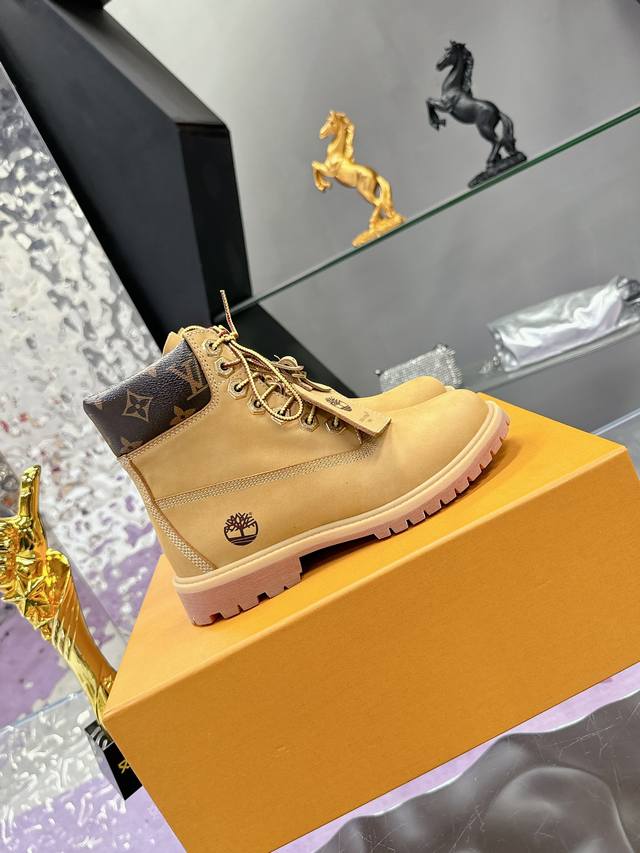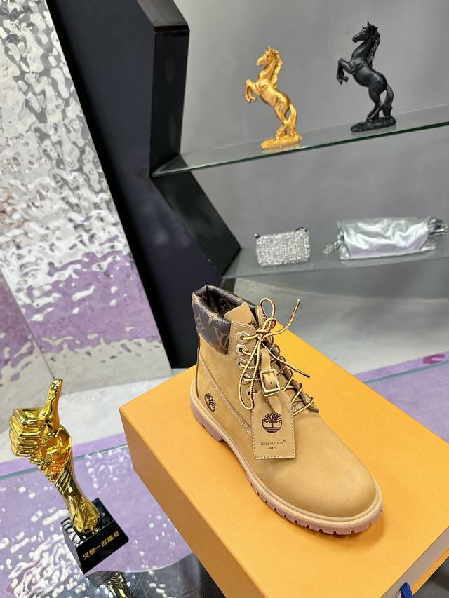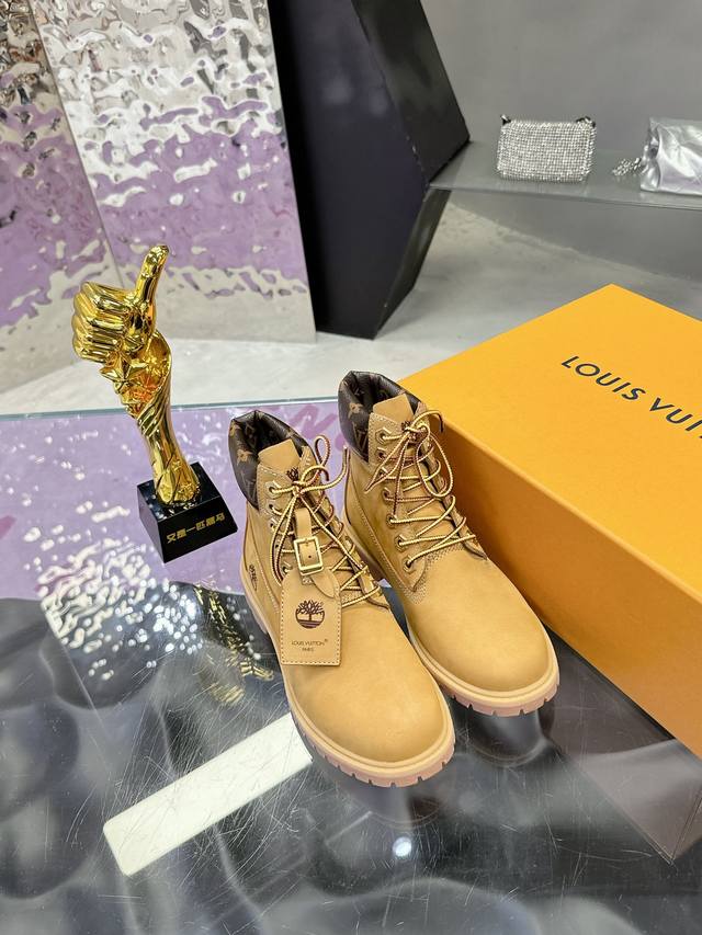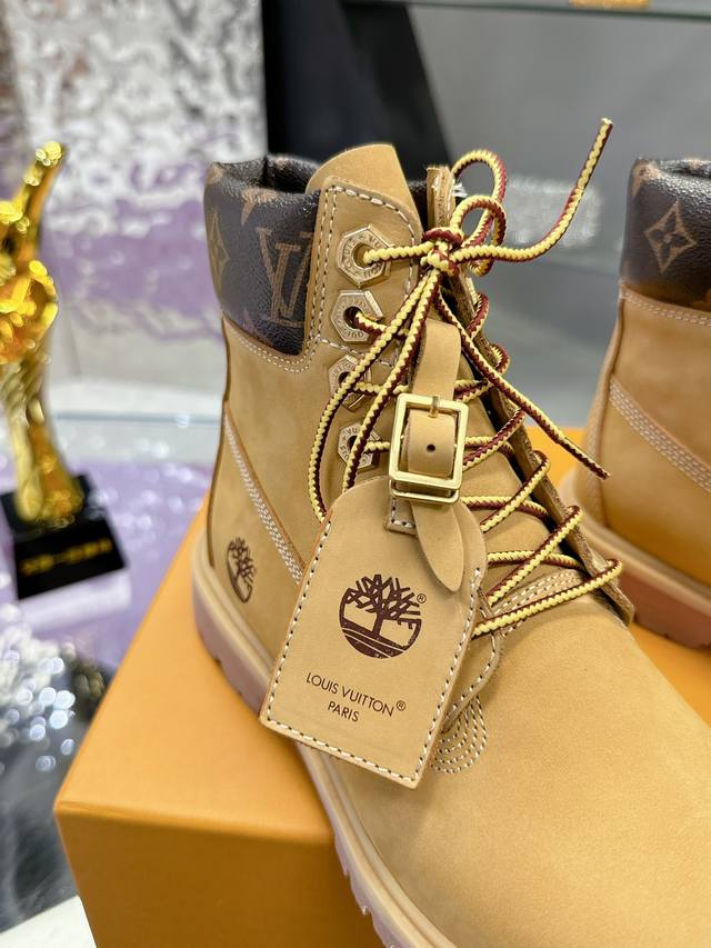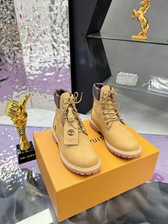 Couple's Lv X Timberland Timberland collaboration with monogrammed yellow ankle boots and short boots