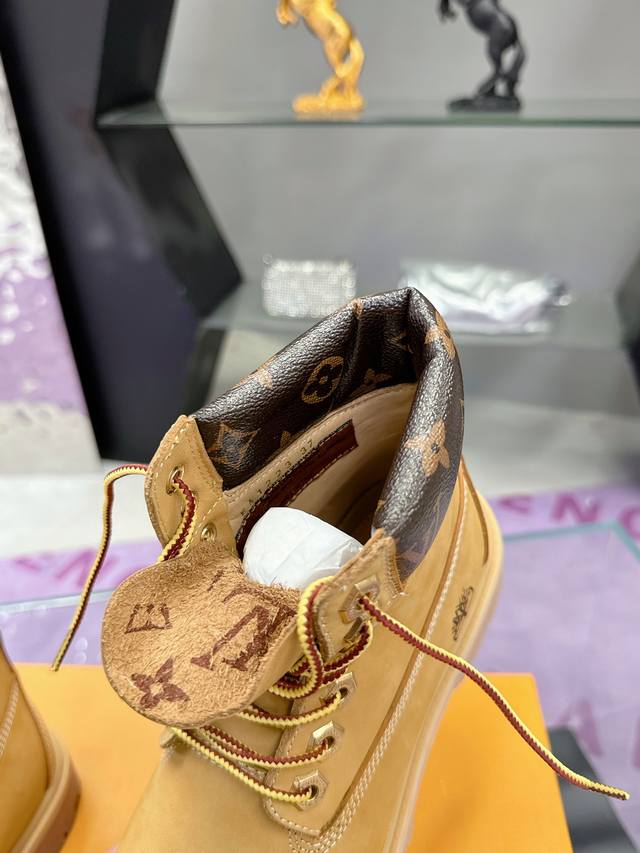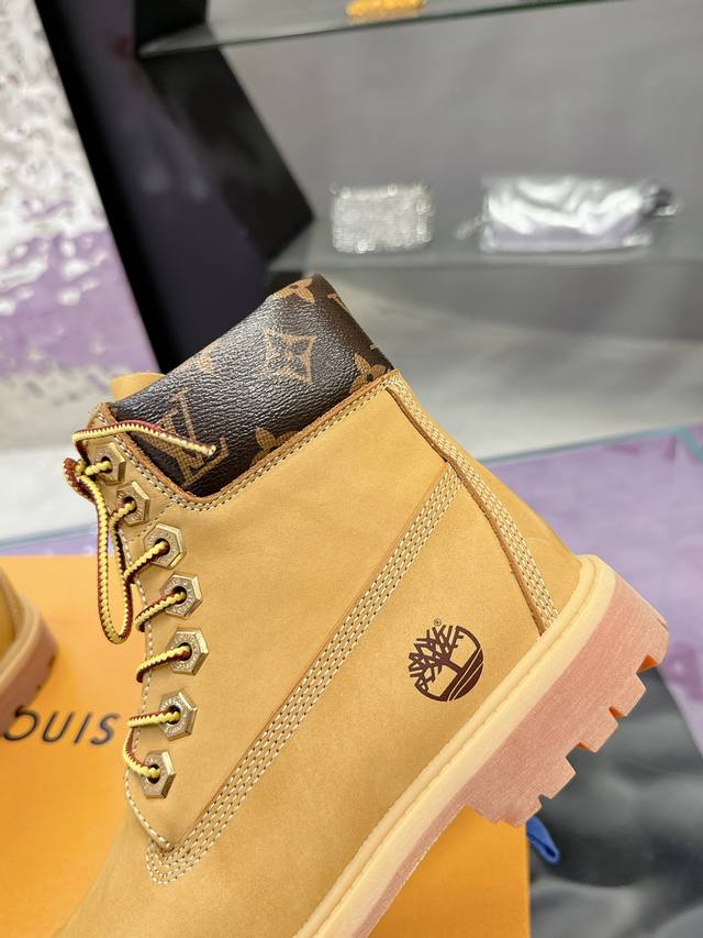 The Lv X Timberland ankle boots are made from Monogram-embossed waterproof nubuck cowhide leather. Relying on the brand's exquisite craftsmanship, the classic Timberland 6-inch boot shape is carefully recreated in Italy with American workwear style. The Monogram-embossed tongue, original Timberland laces, and outsole designed by Pharrell Williams are the finishing touches of exquisite details. The leather label expresses the collaboration logo