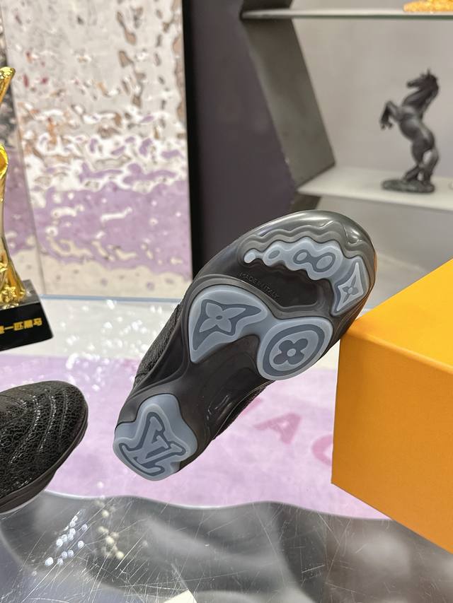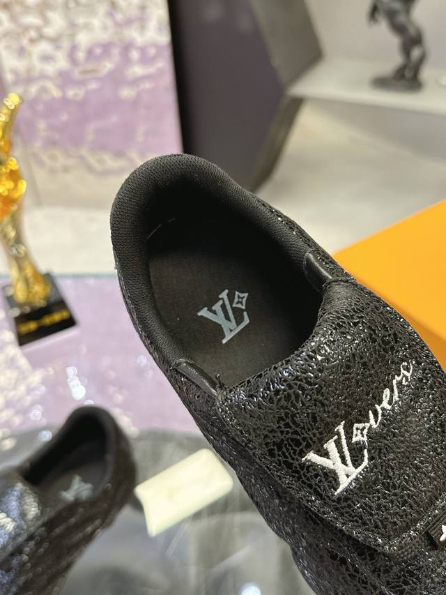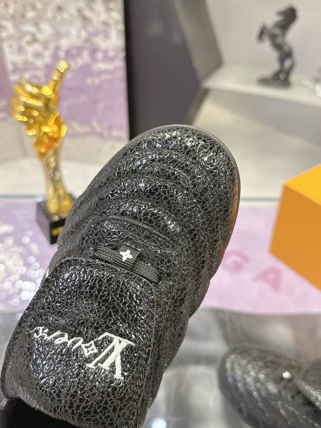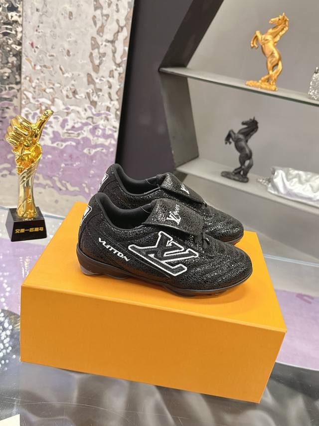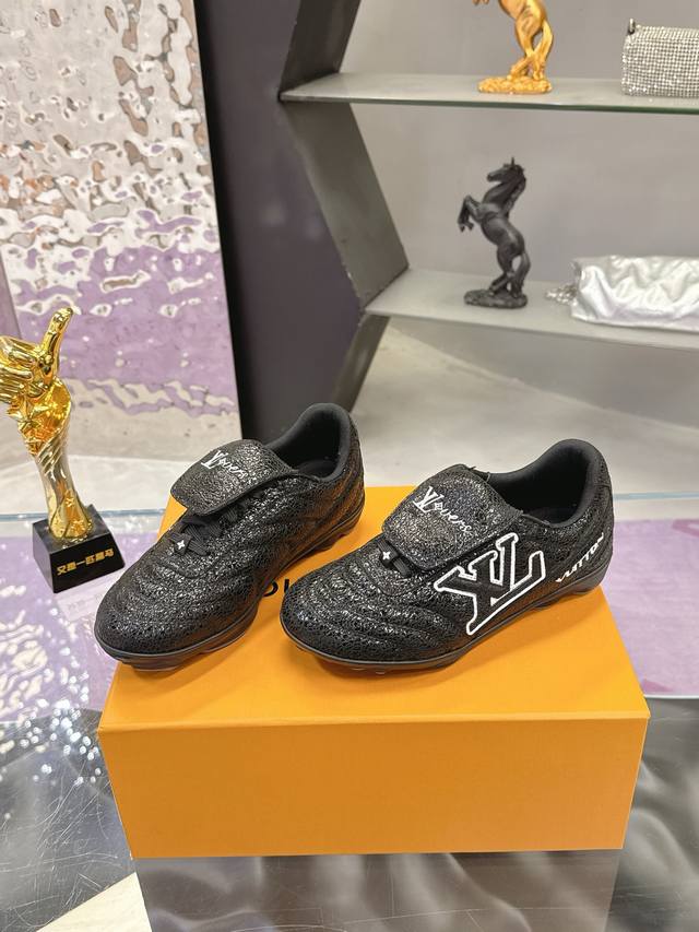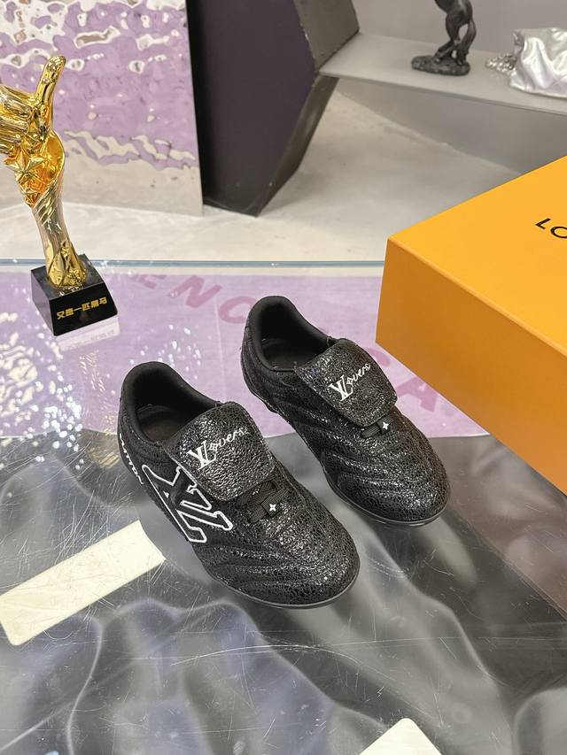 Factory Price: Louis Vuitton's latest Footprint series couple's soccer shoes. This Footprint Soccer sneaker is pharrell Williams' first soccer-inspired design . Inspired by soccer across generations and cultures, this shoe is known for its sleek design, featuring a dynamic Iv Initials logo on the side, an Lvers United badge on the tongue inspired by the soccer team, and a rubber outsole with various Louis Vuitton logos. Comes with exquisite boutique packaging. Material: Original imported top-grain crackled cowhide. Lining: Original custom soft sheepskin lining. Sole: Original molded two-tone TPU combination sole. Sole thickness: 3.5cm. Size: Women's 35-41, Men's 39-45.