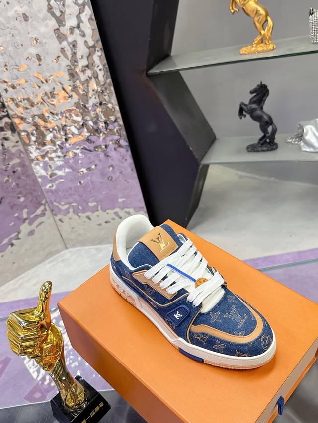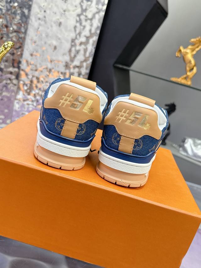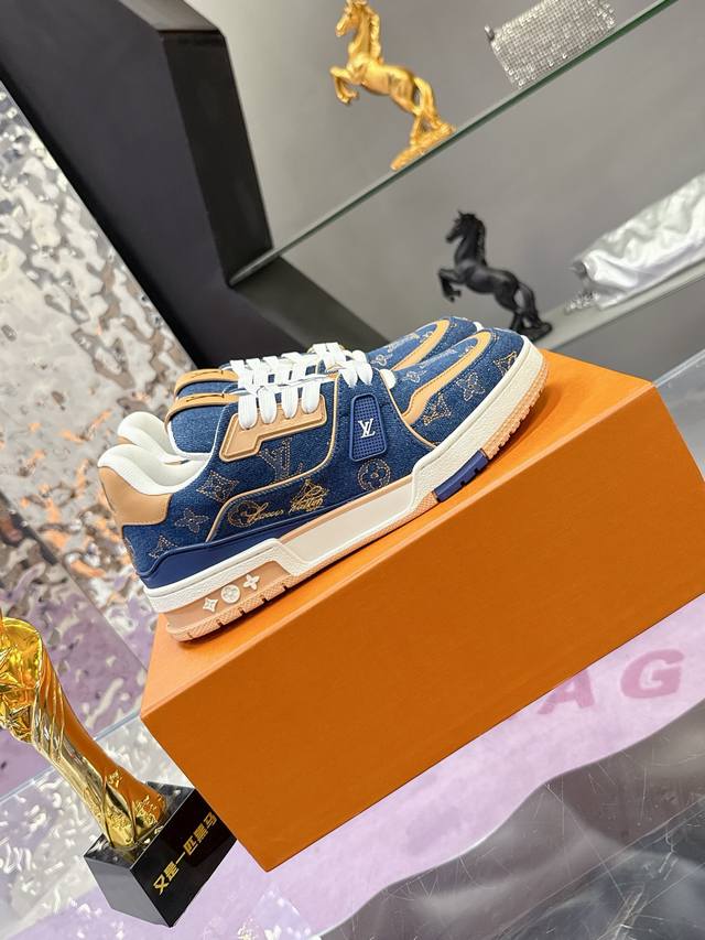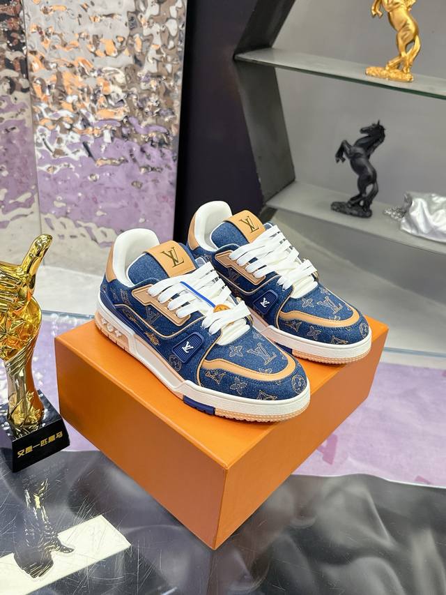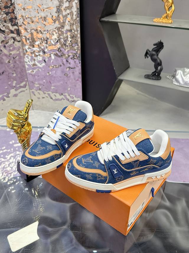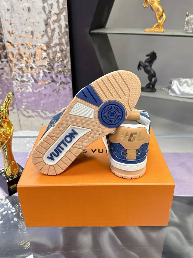 Factory Price: Newest Color for 2025 - Louis Vuitton Trainer Series Couple Casual Sneakers/Skateboard Shoes. Original purchase and development. This Louis Vuitton Trainer sneaker features a suede cowhide upper embossed with the Damier pattern, inspired by retro basketball shoes. Multiple logos highlight the brand's style. Removable Monogram floral tag and #54 logo adorn the laces and heel. Comes with exquisite boutique packaging. Material: Original custom imported materials. Lining: Original custom breathable mesh. Outsole: Original molded anti-slip TPU combination outsole. Sole thickness: 3cm. Size: Women's 35-40, Men's 38-46.
